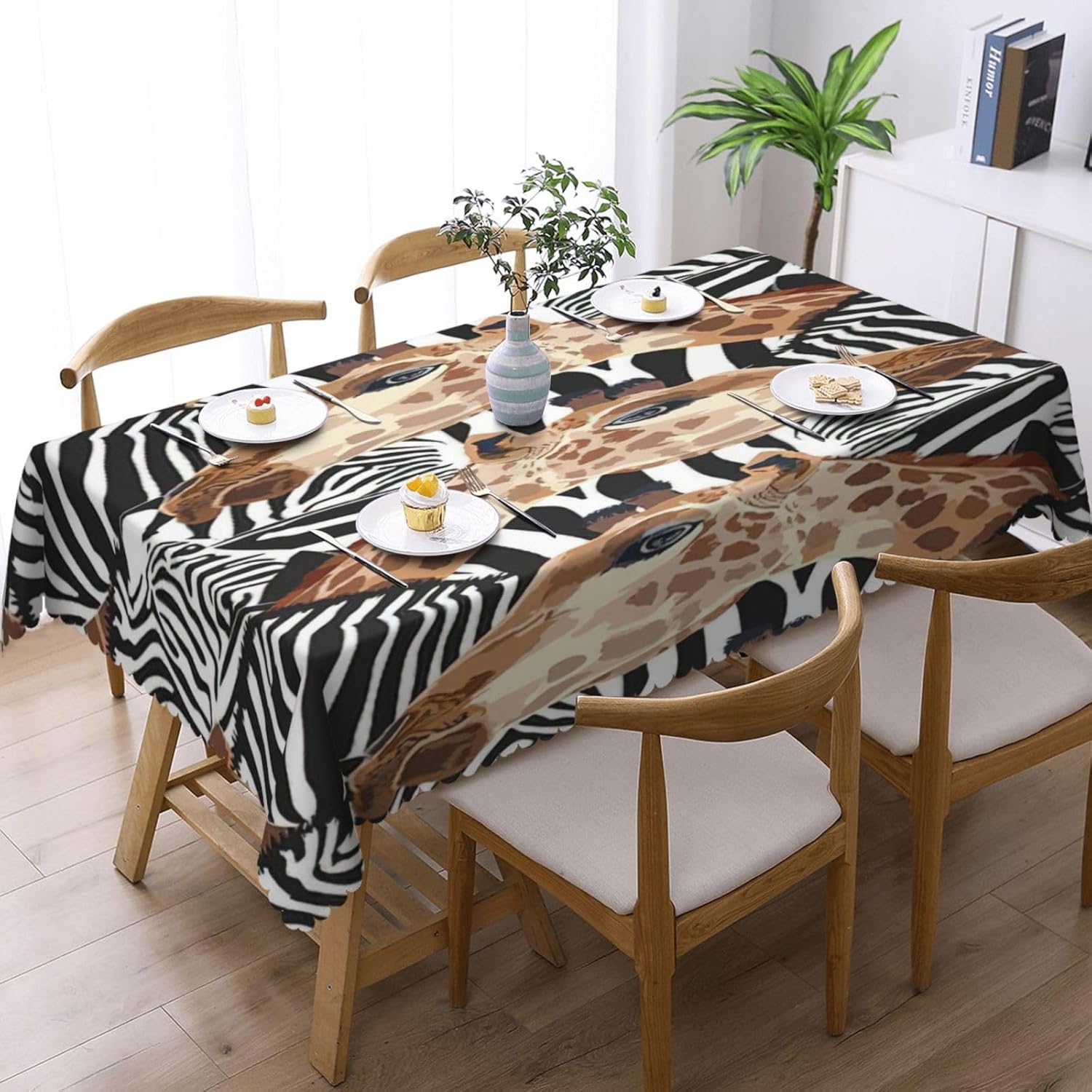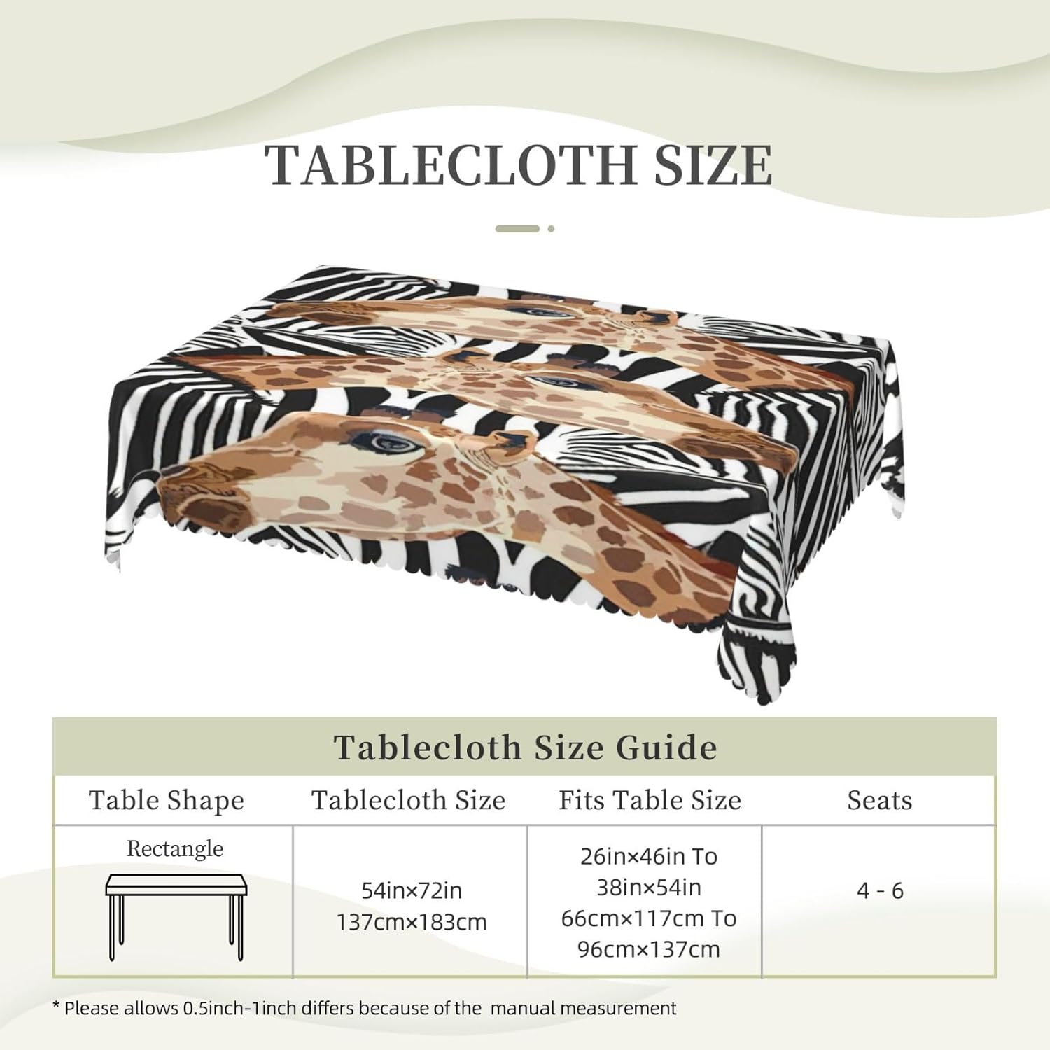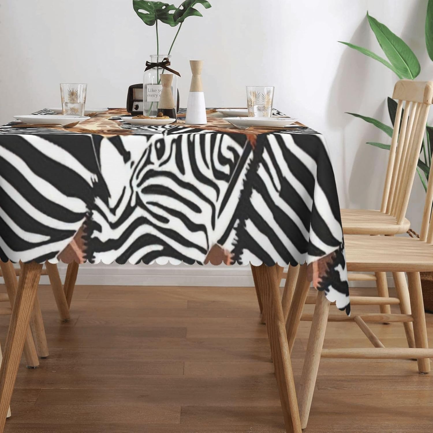 Questa tovaglia rettangolare con motivo zebrato e giraffa è di 137x183 cm. Tovaglia con motivo zebrato e giraffa realizzata in materiale poliestere, calda e morbida, buona resistenza alle pieghe, può essere lavata e riutilizzata, protegge dalla polvere e protegge da ammaccature, scheggiature e graffi. Tovaglia con stampa zebra e giraffa, utilizzabile sia all'interno che all'esterno, ideale per feste, matrimoni, campeggio, patio, compleanno in famiglia, buffet, barbecue, tavoli da cucina, ecc. Tovaglia quadrata con stampa zebra e giraffa, bordo semicircolare in pizzo, Attenzione: non candeggiare, non esporre alla luce del sole, è accettabile sia il lavaggio a mano che in lavatrice a temperatura ambiente e la stiratura a bassa temperatura. In caso di problemi o domande, contattateci, vi risponderemo entro 24 ore