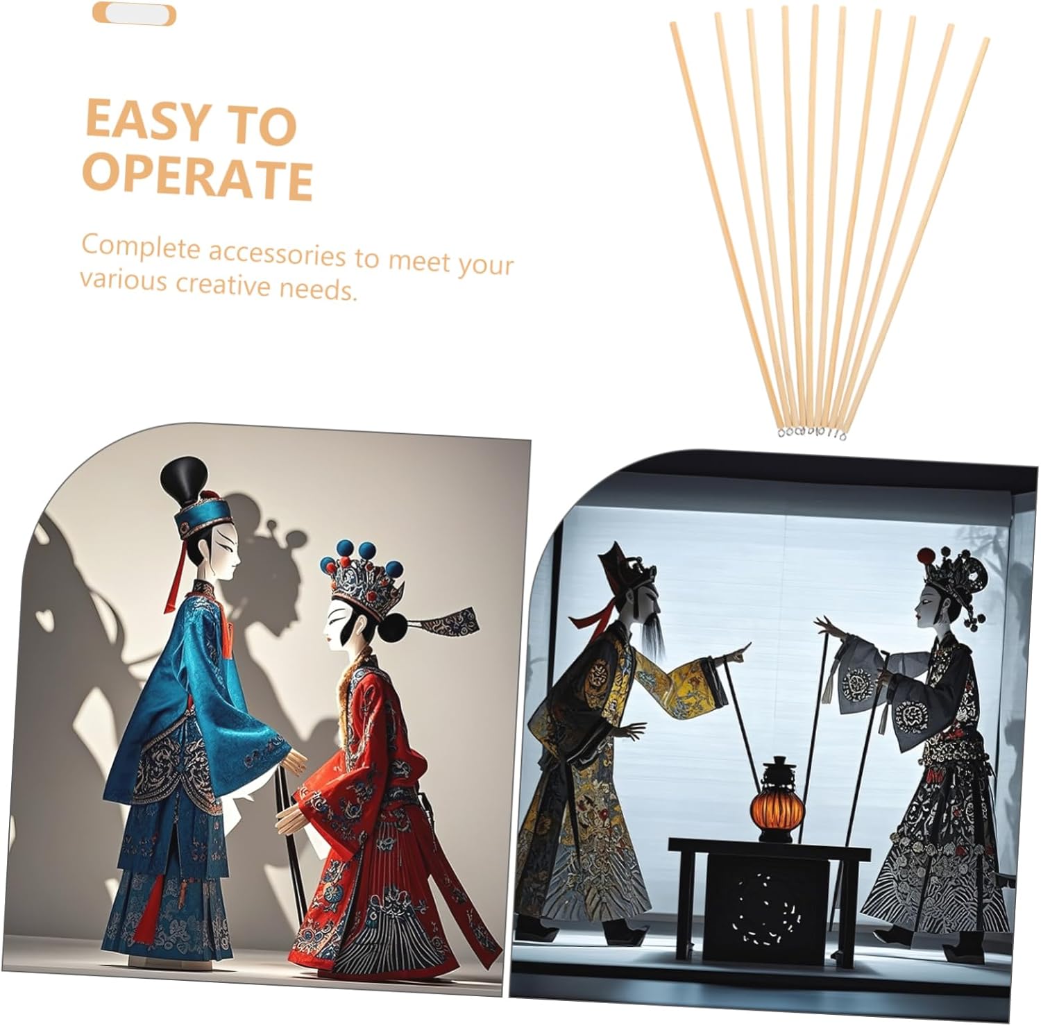 Materiali resistenti: realizzati con materiali facili da usare, che garantiscono prestazioni durature e facilità di manipolazione, manico per burattini in legno, bastoncini artigianali non finiti Patrimonio culturale: immergiti nell'antica arte delle marionette delle ombre, sperimentando il fascino della cultura tradizionale cinese, giocattolo delle marionette delle ombre, bastoncini di marionette in legno Esplorazione culturale: sperimenta l'esperienza delle marionette delle ombre cinesi, connettendoti con una tradizione artistica senza tempo, manico delle marionette delle ombre fai da te, asta per la maniglia delle marionette Controllo semplice: il design ergonomico delle aste garantisce una facile manipolazione, dandoti il controllo delle azioni del tuo burattino, controlli del burattino in legno, controllo del braccio del burattino Artigianato creativo fai da te: progetta e assembla i tuoi accessori per marionette ombra, realizzando ogni creazione, accessori per il controllo delle marionette in legno, parti fai da te per marionette ombra