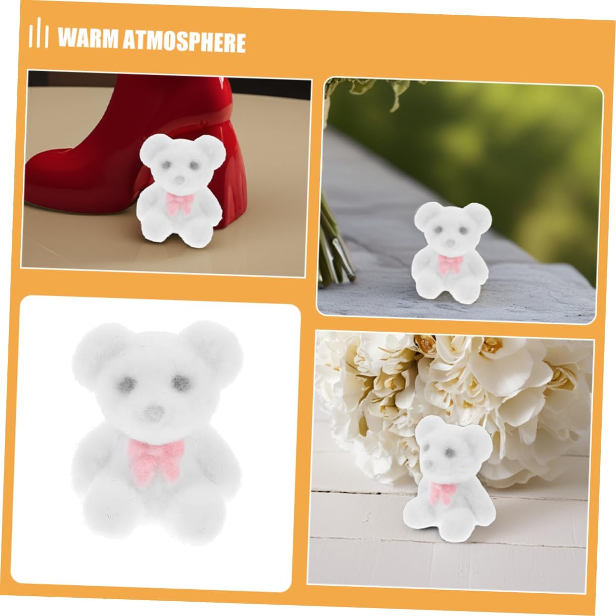 Morbidi e morbidi: realizzati in morbido materiale floccato, questi mini orsetti offrono un'esperienza tattile confortevole e piacevole, decorazioni per torte, morbidi animali giocattolo Decorazione fai da te: questi orsetti possono essere usati come materiali fai da te, permettendoti di crearli e decorarli per adattarli tuo stile e tema dell'evento, mini orsetti floccati, bomboniere in miniatura Artigianato fai da te unico: usa questi peluche in miniatura come materiale fai da te per creare decorazioni uniche e creative per ogni occasione, decorazioni di compleanno, giocattoli floccati Morbido e confortevole: il materiale floccato di questi mini orsetti garantisce una sensazione morbida e confortevole, rendendoli una gioia da tenere e coccolare, toppers per torta, mini orsetti Bomboniere versatili: questi piccoli animali floccati sono ideali per vari eventi, tra cui matrimoni, compleanni e shower, rendendoli bomboniere versatili, articoli decorativi per feste, orsetti di peluche