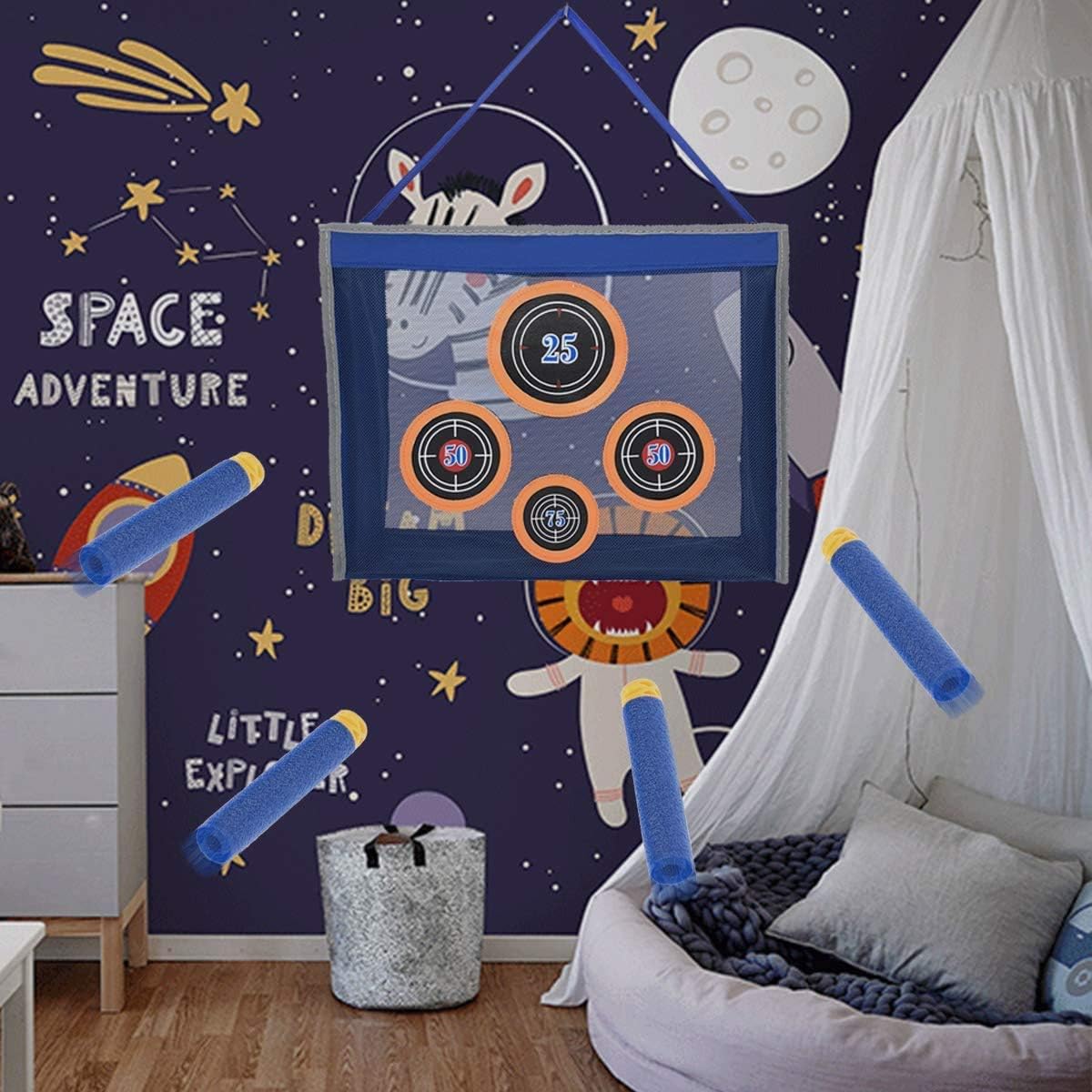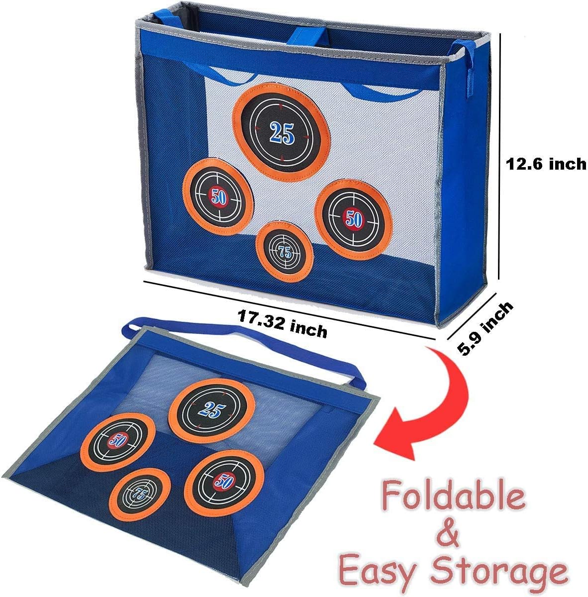 Borsa da bersaglio portatile allena le tue abilità ovunque promuova la comunicazione genitore-figlio ed eserciti la capacità di tiro dei bambini. Non crea disordine e non perde più le freccette, raccoglie e conserva facilmente le freccette. Il design interno del supporto consente di posizionare l'obiettivo in piedi notevolmente, non cadrà durante la pratica di ripresa. 4 diversi fori punteggio, è possibile organizzare più piano di allenamento di tiro, divertirsi più sul gioco. Il bersaglio portatile è pieghevole, è possibile piegarlo piccolo per riporre o viaggiare. La borsa portatile ha una maniglia per consentire di trasportare alcuni blasters e giri all'aperto o ovunque e divertirsi in qualsiasi momento. Dimensioni: ca. 44 x 15 x 32 cm Adatto per bambini dagli 8 anni in su. Tasca per bersaglio Surper compatibile con Nerf N-Strike Elite Series,N-Strike Elite Mega Series e Rival Series.