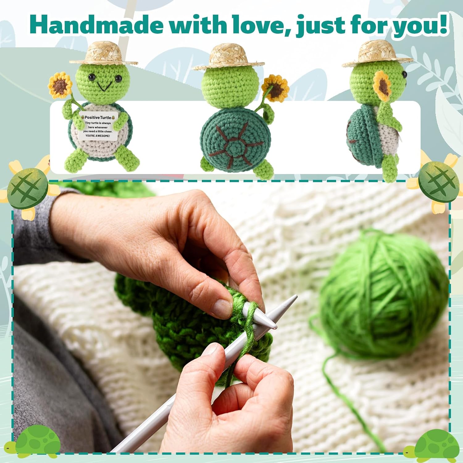 Contenuto del pacchetto: riceverai una simpatica bambola di tartaruga all'uncinetto con carta di ispirazione, la dimensione è 12x7x5cm, carina, portatile, facile da trasportare, facile da posizionare e decorare. Design carino: questa bambola all'uncinetto è affascinante, delicata e carina, decorata con dettagli di girasole e galline, piena di sole, calore e potenza positiva, aggiungendo un tocco di divertimento al tuo ambiente decorativo. Craftsmanship premium: la nostra tartaruga all'uncinetto è accuratamente intrecciata con filato di buona qualità, che è sicuro, affidabile, non facile da rompere, non facile da deformare e sbiadire, non si perde i capelli e può essere posizionata e conservata per lungo tempo. Regalo significativo: questa bambola di lana è carina e significativa. Che si tratti di una cerimonia di compleanno, Natale o di laurea, può essere dato come un regalo pieno di incoraggiamento emotivo per la famiglia, gli amici, i compagni di classe e i colleghi. Decorazione versatile: questa bambola di tartaruga positiva può essere posizionata sulla scrivania, la scrivania, il comodino, in macchina e ovunque è necessario incoraggiamento, rendendola una meravigliosa decorazione per la casa, il favore della festa o il compagno di viaggio.