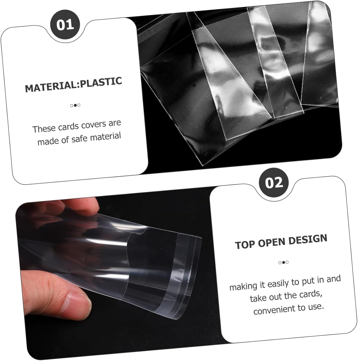Maniche per carte: pregevole fattura, senza sbavature sulla superficie, anche se il giocando e usandolo non danneggerà la sua pelle delicata, protezione per carte Porta carte di credito in stile semplice: ogni custodia protettiva è progettata in modo indipendente e può essere estratta per essere utilizzata separatamente, custodie per carte Forniture per carte: la custodia per carte è facile da usare e comoda da pulire, il che porta comodità alla tua vita, custodie protettive per carte Coperture per carte antigraffio: adottano un design con apertura superiore, che facilita l'inserimento e l'estrazione delle carte, comode da usare, coperture per l'esposizione delle carte Portafoto di gioco: conserva perfettamente le tue foto di gioco, foto, cartoline, coupon o altri oggetti da collezione in modo sicuro e organizzato, protezioni trasparenti per il mazzo