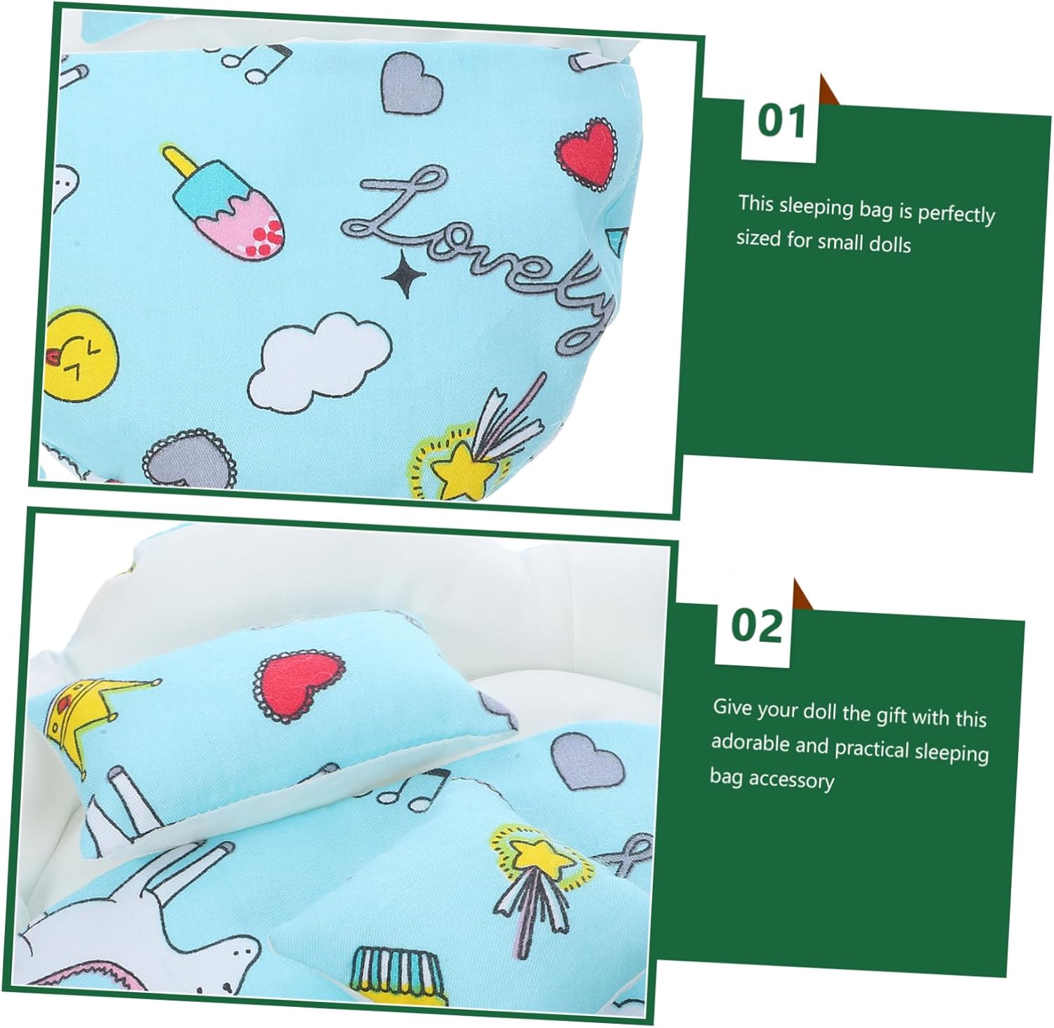 Sacco a pelo per bambole di peluche: facile da indossare e da togliere, comodo per far giocare gli adolescenti, morbido e confortevole, non sbiadisce facilmente. Sacco a pelo per bambole minuscole: puoi vestire le bambole secondo le tue preferenze con questo sacco a pelo per bambole, arricchendo l'immaginazione. Sacco a pelo per bambole sostituibile: questo sacco a pelo è della dimensione perfetta per le bambole piccole e adatta perfettamente al tuo piccolo . Fornitura per bambole resistente all'usura: bellissimo design, questo sacco a pelo per bambole è molto trendy e carino, rendendo le bambole più affascinanti. Sacco a pelo per bambole: design adorabile, elegante e carino, che rende le bambole più attraenti con questo sacco a pelo per bambole.
