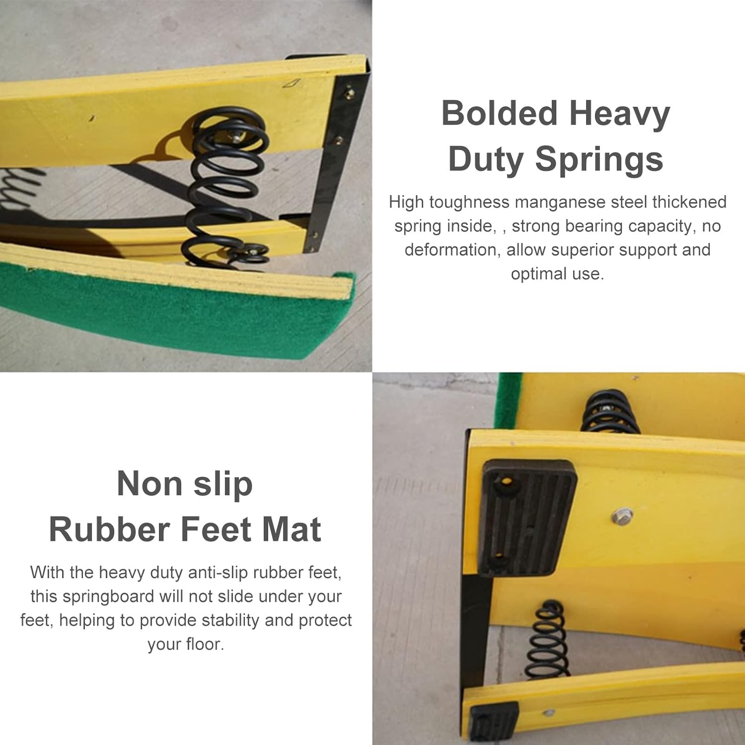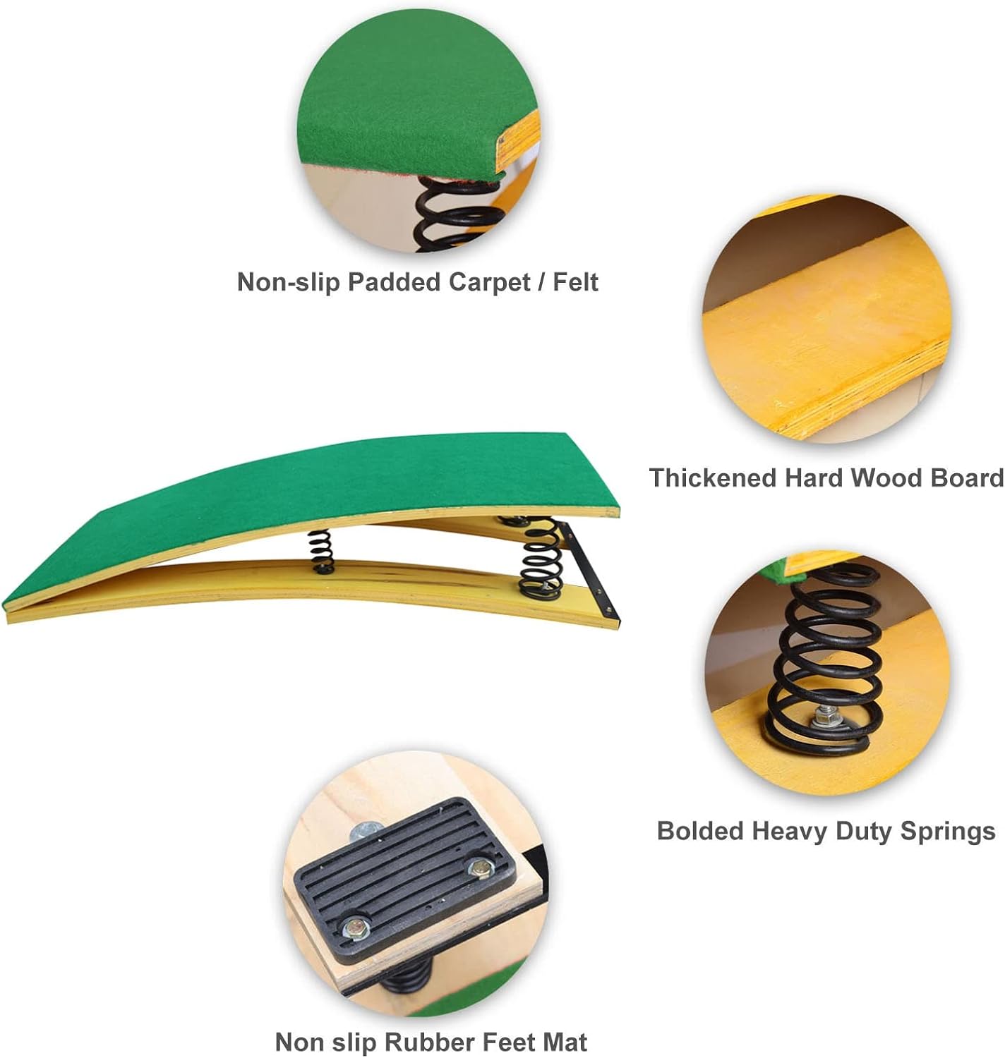 【 Durevole e stabile 】 Il nostro trampolino è realizzato in legno massello, con una forte capacità portante, nessuna deformazione, liscio e senza sbavature, facile da pulire; perfetto in qualsiasi condizione atmosferica, adatto per interni ed esterni. 【Comodo per i piedi nudi】 Questi trampolini sono rivestiti in feltro antiscivolo imbottito. Questo permette ai piedi di aderire bene durante il salto e fornisce anche una superficie confortevole. Sono ecologici e facili da pulire. 【Progettato per i bambini】 Carico massimo: 65 kg/143 libbre. Questo powerboard è perfetto per lezioni di ginnastica prescolare, per migliorare le abilità di volteggio, per salire sulle parallele asimmetriche, per esercitarsi negli atterraggi, per Pilates, yoga, arte fisica o stretching. 【4 Molle in Acciaio per Impieghi Gravosi】 Elevata tenacità, elasticità e resilienza delle molle ispessite, sicure e durevoli, reattive e riducono notevolmente l'affaticamento degli atleti. Consentono un supporto superiore e un utilizzo ottimale. 【Servizio】I nostri prodotti vengono rigorosamente selezionati prima della spedizione, ci impegniamo per una maggiore soddisfazione. In caso di domande sul nostro prodotto, non esitate a contattare il nostro team di assistenza clienti