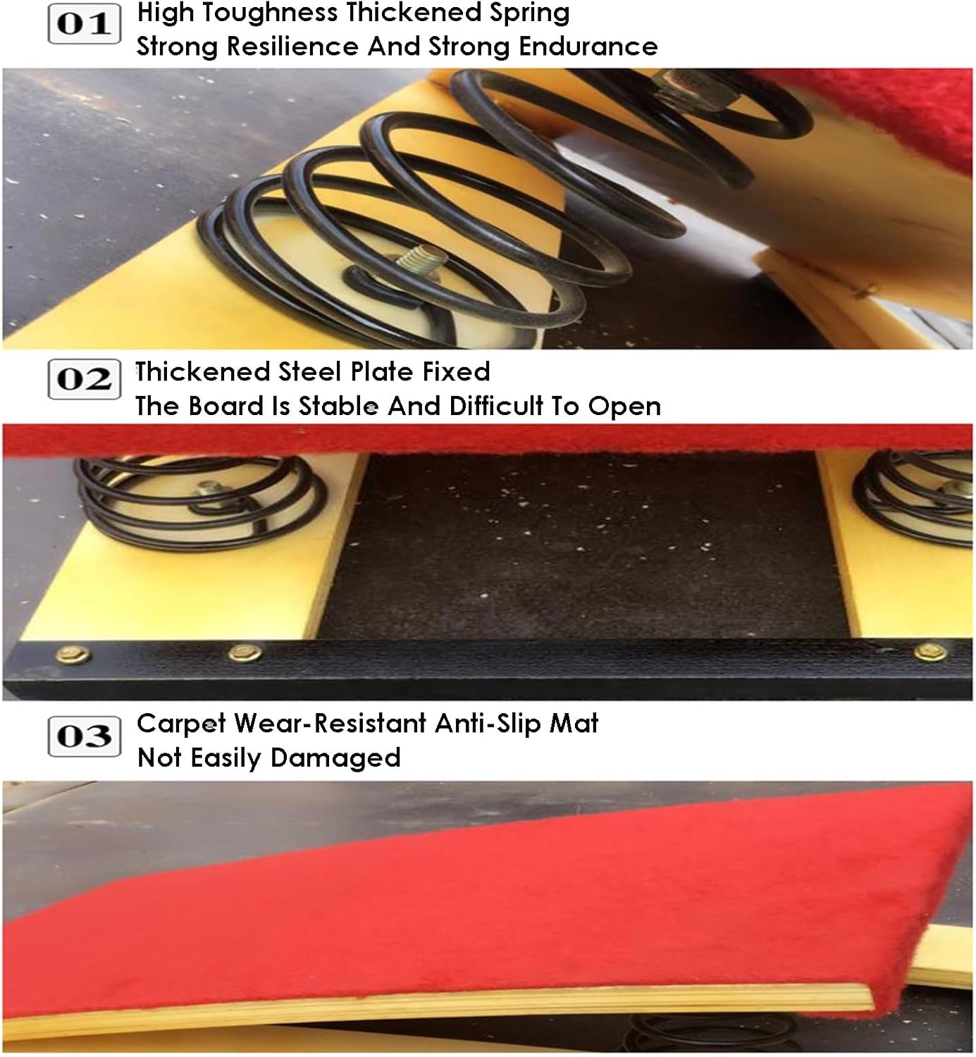 TRAPANO DA GINNASTICA: il trampolino elastico è realizzato in legno duro, con feltro sulla superficie e molla ispessita all'interno, forte capacità portante, nessuna deformazione, con piastra in acciaio, adatto a qualsiasi scena, adatto per interni ed esterni CURVA ERGONOMICA: il trampolino da ginnastica si conforma alla curvatura ergonomica in modo che non si verifichino incidenti di sicurezza durante l'uso e il booster di ribaltamento da ginnastica ha un'elevata elasticità, che riduce notevolmente il consumo fisico degli atleti DESIGN IN FELTRO SUPERFICIALE: la superficie del trampolino è ricoperta di feltro, in modo che i piedi possano mantenere una buona presa durante il salto, sicuro e anticaduta e proteggerci il più possibile, anche se sei a piedi nudi, non ti sentirai a disagio AMPIA APPLICAZIONE: trampolino da ginnastica resistente per casa, palestra, campo di allenamento professionale, palestra, scuola, trampolino robusto adatto a bambini, adolescenti e adulti, che tu sia un atleta professionista, un appassionato di fitness o un allenamento di fitness per bambini, salto in alto e salto in lungo, può essere la tua scelta STRUMENTO DI ASSISTENZA AL SALTO: Il trampolino è uno strumento ausiliario per il salto per i progetti di volteggio con cavalli, utilizzato per migliorare le abilità di volteggio, praticare lo smontaggio, l'arte sportiva e gli esercizi di stretching, il trampolino aiuta gli atleti ad aumentare l'altezza del salto e assiste nei movimenti tecnici complessi negli sport aerei