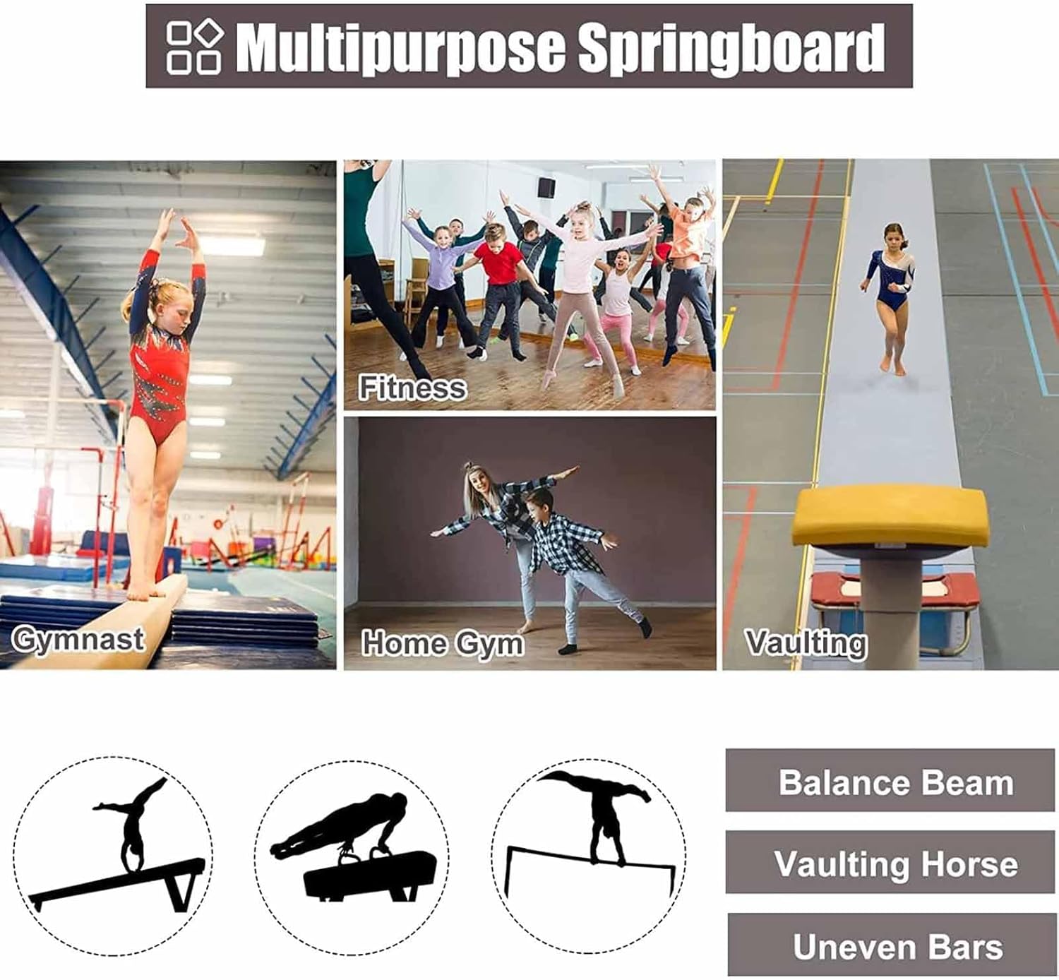 【Trampolino da ginnastica】Il trampolino da ginnastica è un ausilio per il salto negli eventi di volteggio, utilizzato per migliorare le abilità di salto, esercitarsi nello sbarco e nell'atterraggio, nell'arte sportiva e nello stretching. Il trampolino aiuta gli atleti ad aumentare l'altezza del salto e supporta i movimenti tecnici complessi negli sport aerei. 【Feltro antiscivolo】 La superficie del trampolino è rivestita in feltro antiscivolo e resistente all'usura, che consente ai piedi di mantenere una buona presa durante il salto, ed è sicuro e anticaduta, proteggendoci il più possibile dagli infortuni. Non pungerà i piedi anche se sei a piedi nudi. 【Tavola in legno ispessito】 Il nostro trampolino è realizzato in legno ispessito di alta qualità, impermeabile, resistente all'umidità e non facile da rompere, sicuro e stabile, con un'eccellente capacità di carico e una lunga durata e può essere utilizzato sia all'interno che all'esterno. 【Molla ad alta tenacità】 Questo trampolino sportivo è realizzato con una molla ad alta tenacità, che ha una buona elasticità, non è facile da arrugginire e deformare, è stabile e sicuro, risolve le tue preoccupazioni, ti offre una migliore sensazione di rimbalzo, risparmia forza fisica ed energia e salta più in alto. 【Servizio】I nostri prodotti vengono rigorosamente selezionati prima della spedizione, ci impegniamo per una maggiore soddisfazione. In caso di domande sul nostro prodotto, non esitate a contattare il nostro team di assistenza clienti