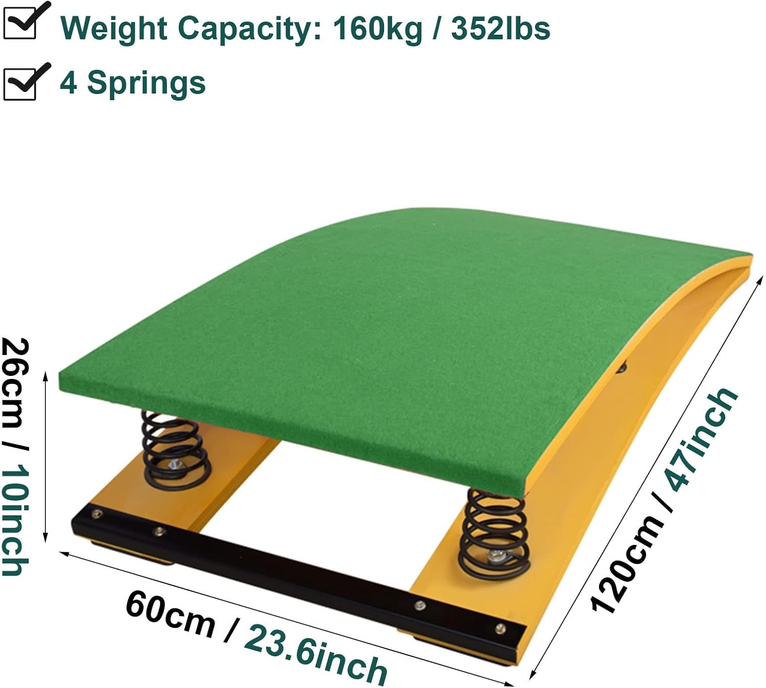 Robusto e durevole: realizzato in legno duro, rivestito in feltro. 4 molle metalliche garantiscono un supporto superiore e un utilizzo ottimale. Dimensioni: 120 cm (47 pollici) di lunghezza, 60 cm (23,6 pollici) di larghezza, 26 cm (10 pollici) di altezza dall'estremità più alta. Progettato per saltatori fino a 160 kg (352 libbre). Altezze graduali: grazie alla piattaforma gradualmente inclinata, il bambino può mettere i piedi in una posizione più comoda. Trampolino per adulti/ragazzi: progettato secondo gli standard. Il trampolino è perfetto per gli allenamenti dei ginnasti a casa. Usalo per salire alle sbarre e per esercitarti nelle discese! Occasioni di utilizzo: ideale per centri di ginnastica, sale giochi, palestre domestiche, scuole, asili, ecc.