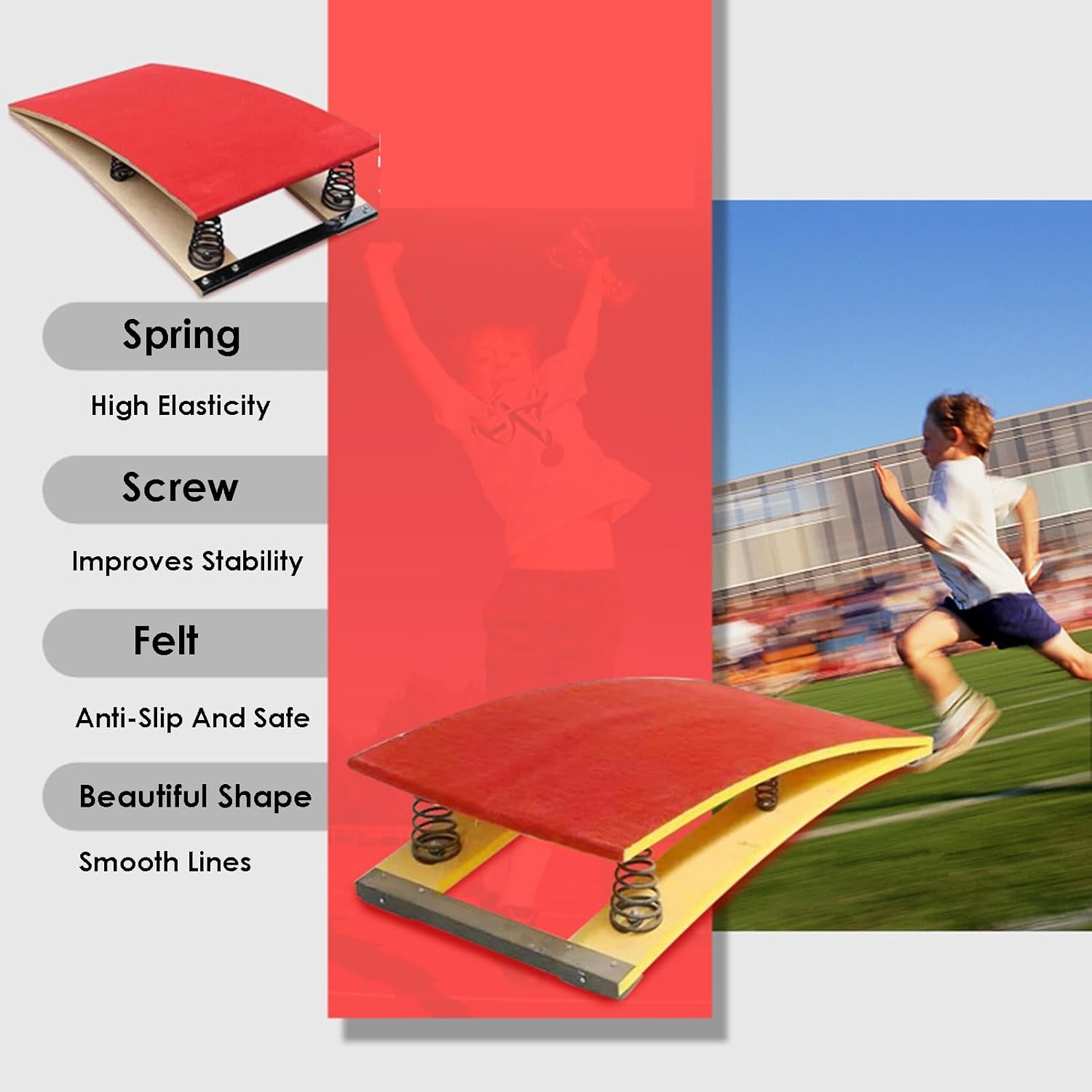 TRAMPOLINO PER GINNASTICA: il trampolino elastico è realizzato in legno duro, con feltro sulla superficie e molla ispessita all'interno, forte capacità portante, nessuna deformazione, con piastra in acciaio, adatto a qualsiasi scena, adatto per interni ed esterni STRUMENTO DI ASSISTENZA AL SALTO: il trampolino è uno strumento ausiliario per il salto per il progetto del cavallo da volteggio, utilizzato per migliorare le abilità del cavallo da volteggio, praticare lo smontaggio, l'arte sportiva e gli esercizi di stretching, il trampolino aiuta gli atleti ad aumentare l'altezza del salto e assiste nei movimenti tecnici complessi negli sport aerei MOLLA AD ALTA RESISTENZA: il trampolino utilizza una molla ad alta resistenza, buona elasticità, non facile da arrugginire e deformare, stabile e sicuro, risolve le tue preoccupazioni, ti offre un migliore senso di rimbalzo, risparmia forza fisica ed energia, salta più in alto DESIGN IN FELTRO SUPERFICIALE: la superficie del trampolino da ginnastica è ricoperta di feltro, in modo che i piedi possano mantenere una buona presa durante il salto, sicuro e anticaduta, proteggendoci il più possibile, anche se sei a piedi nudi, non ti sentirai a disagio AMPIA APPLICAZIONE: il trampolino da ginnastica è adatto per l'allenamento, la competizione, l'intrattenimento quotidiano, adatto per casa, scuola, cantina, sala giochi, palestra, centro di ginnastica, scene di club sportivi