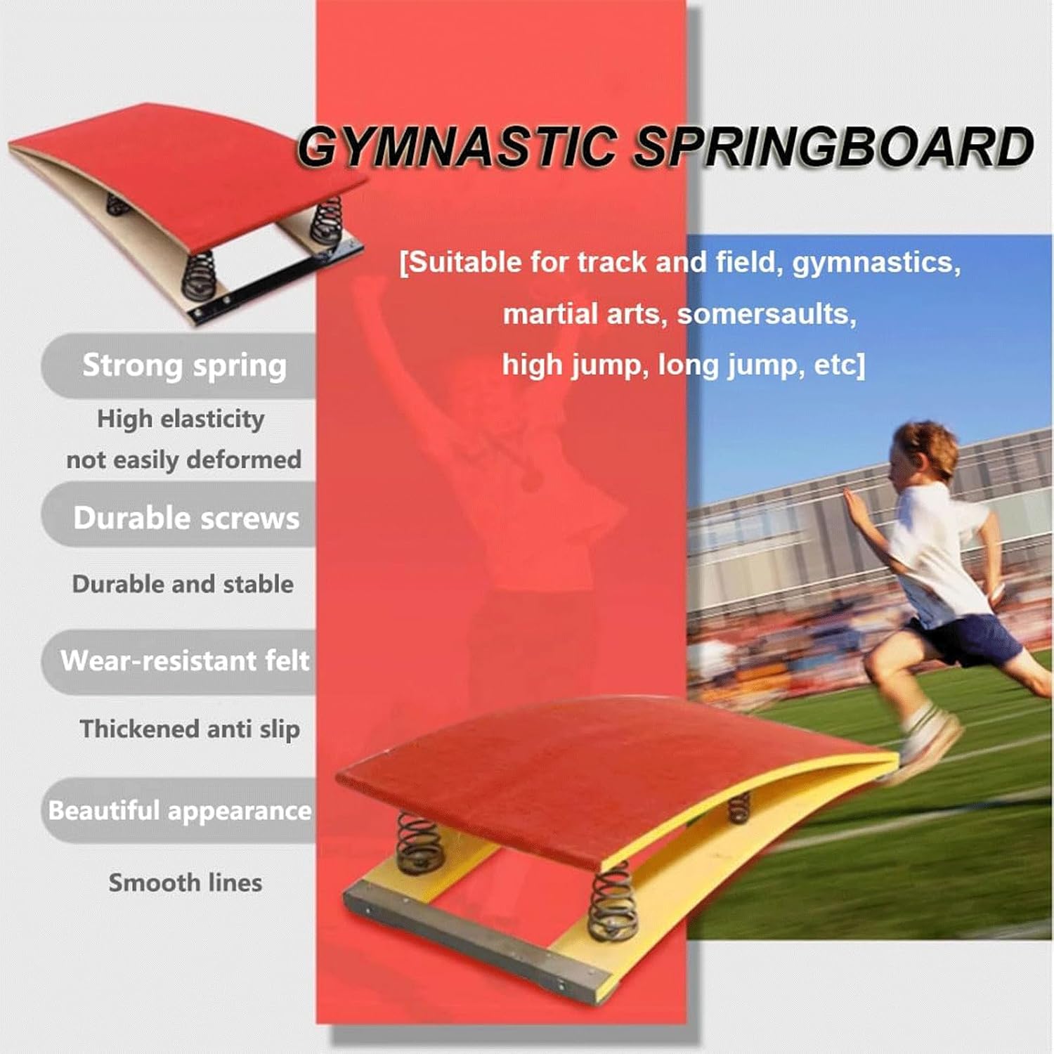 La robusta piastra in acciaio ispessita internamente collega saldamente il tappetino antiscivolo superficiale e il telaio, garantendo una comoda resistenza della molla, una forte capacità portante, una forte elasticità, nessuna deformazione e un fissaggio della piastra in acciaio antiruggine. Realizzato in legno massello, è durevole, impermeabile e resistente all'umidità, e non soggetto a crepe. Ai quattro angoli inferiori sono installati dei cuscinetti antiscivolo in plastica. La parte superiore del pannello è rivestita da un comodo feltro antiscivolo, che non solo non ferirà i piedi, ma fornirà anche una presa sufficiente durante il salto, proteggendo al contempo la superficie del trampolino. Il pannello è dotato di due angoli anti-collisione. [Dimensioni]: (L x P x A) 60 x 120 x 26 cm/23,62 x 47,24 x 10,23 pollici, Stile: 4 molle. Peso supportato: 80 kg/176 libbre. Colore: verde. È molto adatto per il volteggio a cavallo, il salto in alto, il salto in lungo, la ginnastica, lo stretching, la body art e l'allenamento yoga nelle sale giochi, nelle famiglie, nelle palestre, nelle scuole, nei centri di ginnastica, nei club sportivi e in altri luoghi.