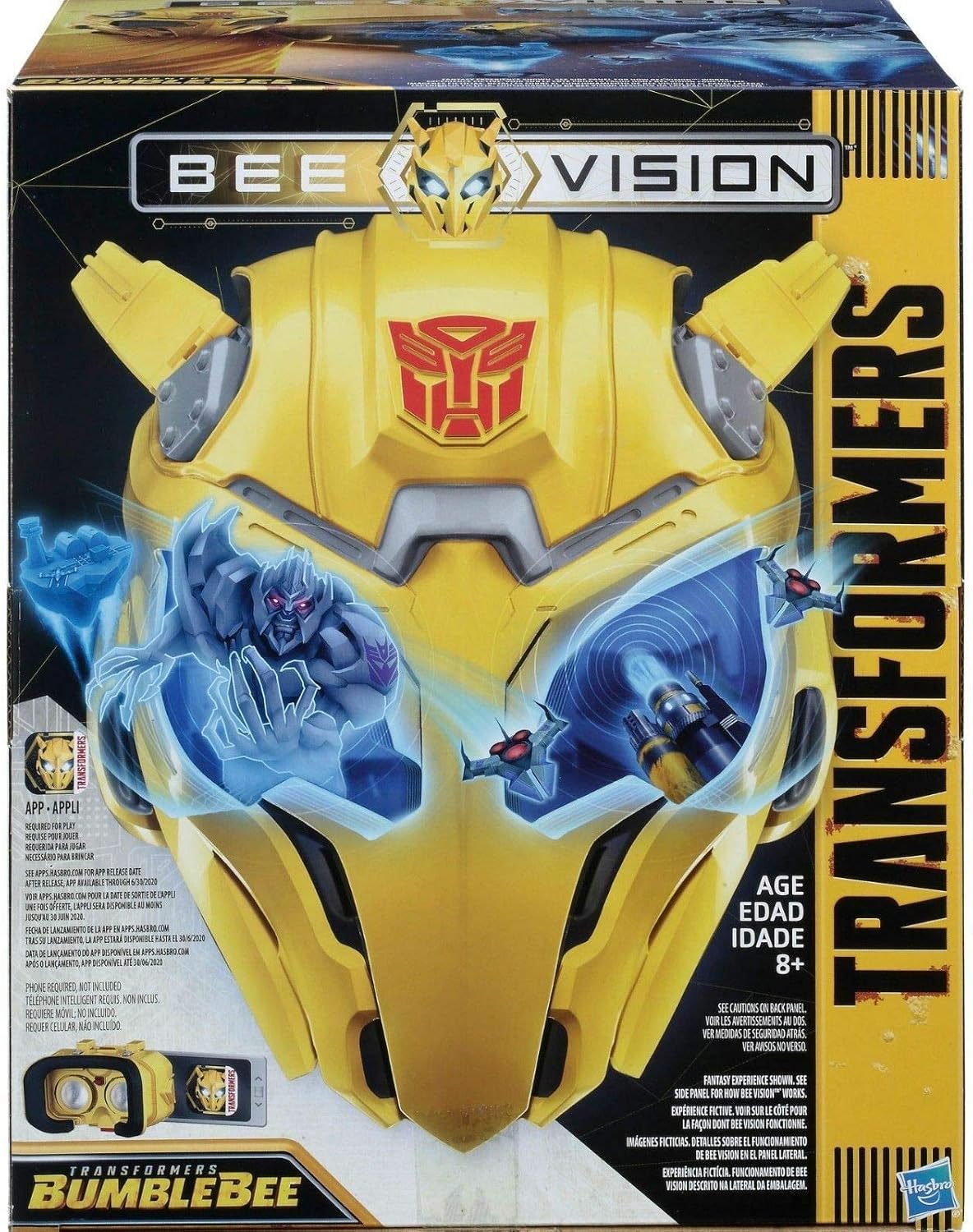 L'esperienza di realtà aumentata di Bumblebee Include la maschera AR di Bumblebee, gli occhiali AR, il polsino di Bumblebee, tre pennarelli AR. Il Bumblebee Battle Blaster (venduto separatamente) attiva un potenziamento nell'app È necessario uno smartphone (non incluso). È richiesto il download dell'app Bee Vision. Le informazioni sulla compatibilità con i dispositivi supportati sono disponibili su apps.hasbro.com. Adatto a partire dagli 8 anni in su