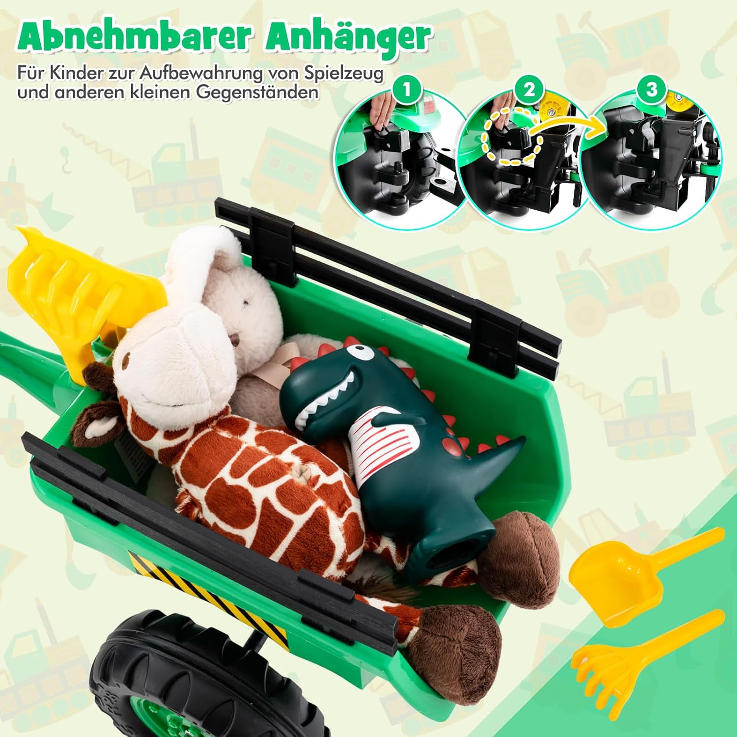 【Trattore per bambini 3 in 1】 Questo trattore a pedali è dotato di pala, benna da scavo e rimorchio, offrendo infinite possibilità di gioco fantasioso. Il tuo bambino può trasformare questo versatile giocattolo in un bulldozer da spingere, un escavatore da scavare o un trattore da tirare. 【Esperienza di guida autentica】 Dotato di volante realistico, clacson funzionante, pedali e pneumatici durevoli, questo trattore offre a tuo figlio una vera esperienza di guida. Possono anche controllare l'escavatore con una benna da scavo completamente controllabile e bracci e giunti flessibili, consentendo loro di azionare l'escavatore in modo efficiente e di divertirsi senza fine! 【Uso sicuro e durevole】 Questo escavatore con sedile è realizzato con materiali di alta qualità e non tossici, garantendo un'esperienza di gioco sicura e duratura per il tuo bambino. Inoltre, con 6 ruote durevoli e resistenti all'usura sul fondo, questo escavatore con conducente garantisce una guida fluida anche su superfici irregolari. 【Rimorchio staccabile】 Questo escavatore a bordo presenta un esclusivo design del rimorchio staccabile, che consente ai tuoi bambini di riporre facilmente giocattoli e altri piccoli oggetti. La parte posteriore del giocattolo dell'escavatore può essere facilmente rimossa per un trasporto senza sforzo. 【Il miglior regalo per i bambini】 Questo trattore a pedali combina intrattenimento, educazione e attività fisica in uno e può essere il regalo perfetto per i bambini dai 3 ai 6 anni. Inoltre, non solo promuove la creatività e l'attività fisica dei bambini, ma migliora anche l'interazione genitore-figlio.