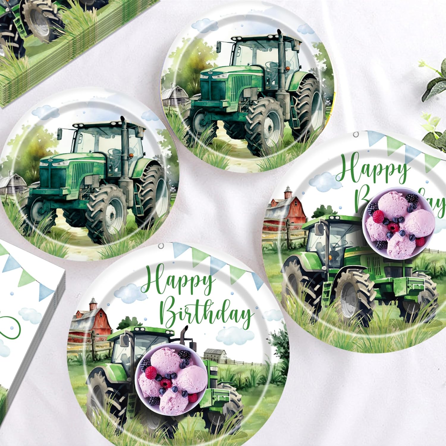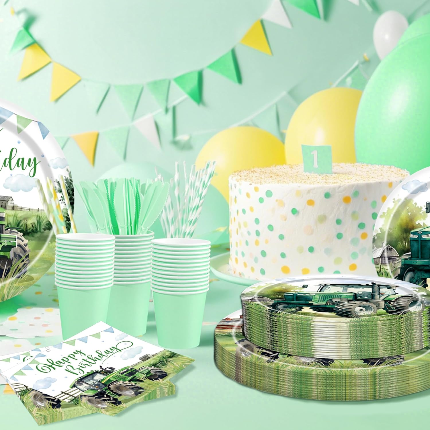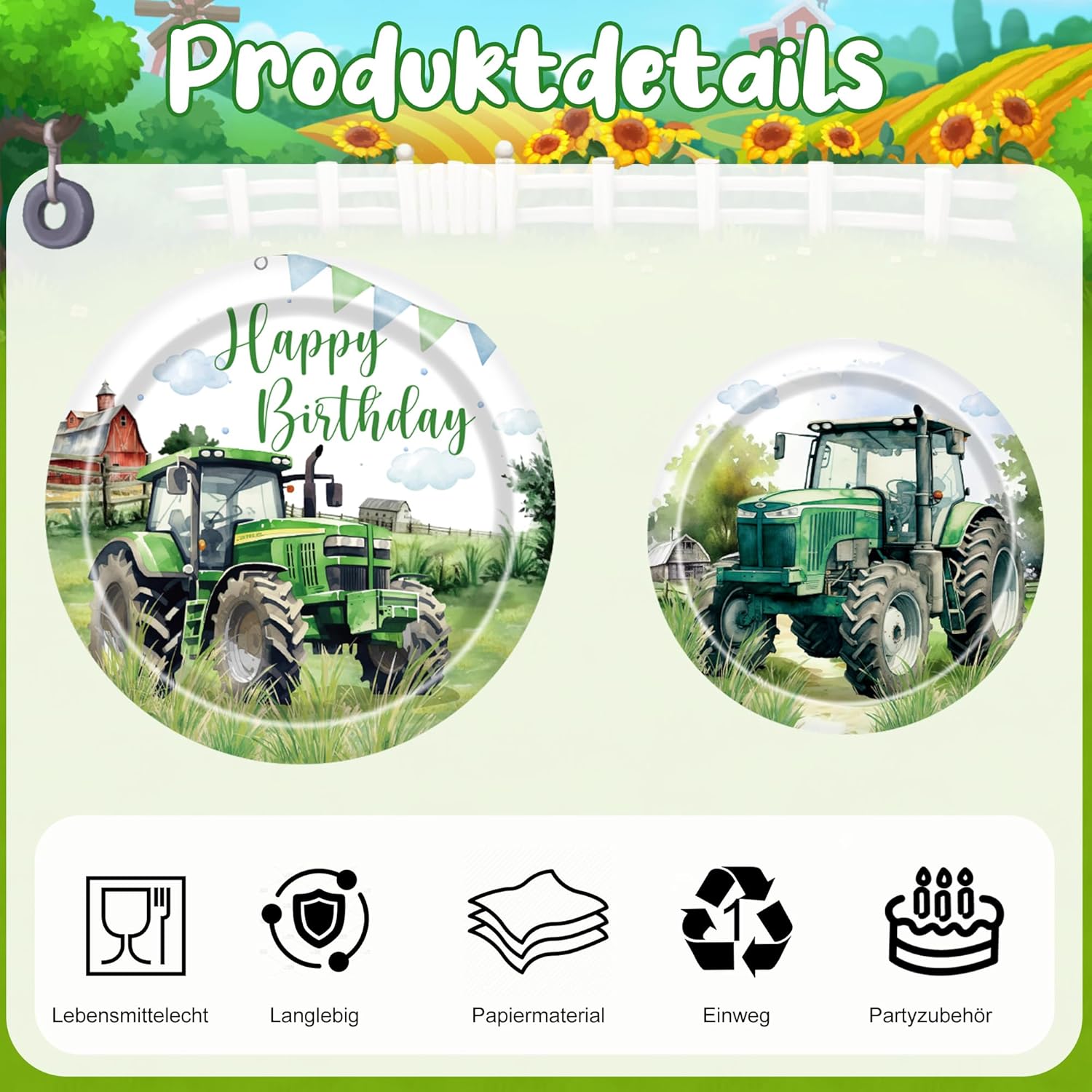 Set completo di stoviglie per trattore per 24 ospiti: include 24 grandi piatti da trattore, 24 piccoli piatti da dessert e 24 tovaglioli coordinati a tema, perfetto per una festa di compleanno indimenticabile per bambini Motivo della fattoria popolare: i motivi realizzati con cura con trattore, prato e elementi della fattoria verde garantiscono un tocco rurale e entusiasmano i piccoli fan dei trattori Materiali di alta qualità: i piatti e i tovaglioli sono realizzati in carta resistente, ideale per torte, snack e pasti di compleanno Ideale per molte occasioni: perfetto per feste di compleanno per bambini, feste a tema fattoria, feste all'asilo, scuola, picnic o feste in giardino, adatto per interni ed esterni Decorazione rapida, grande effetto: il set consente di risparmiare tempo di preparazione e porta immediatamente colore e gioia a qualsiasi festa di trattore: basta aprire la confezione, fare scorta e iniziare a festeggiare