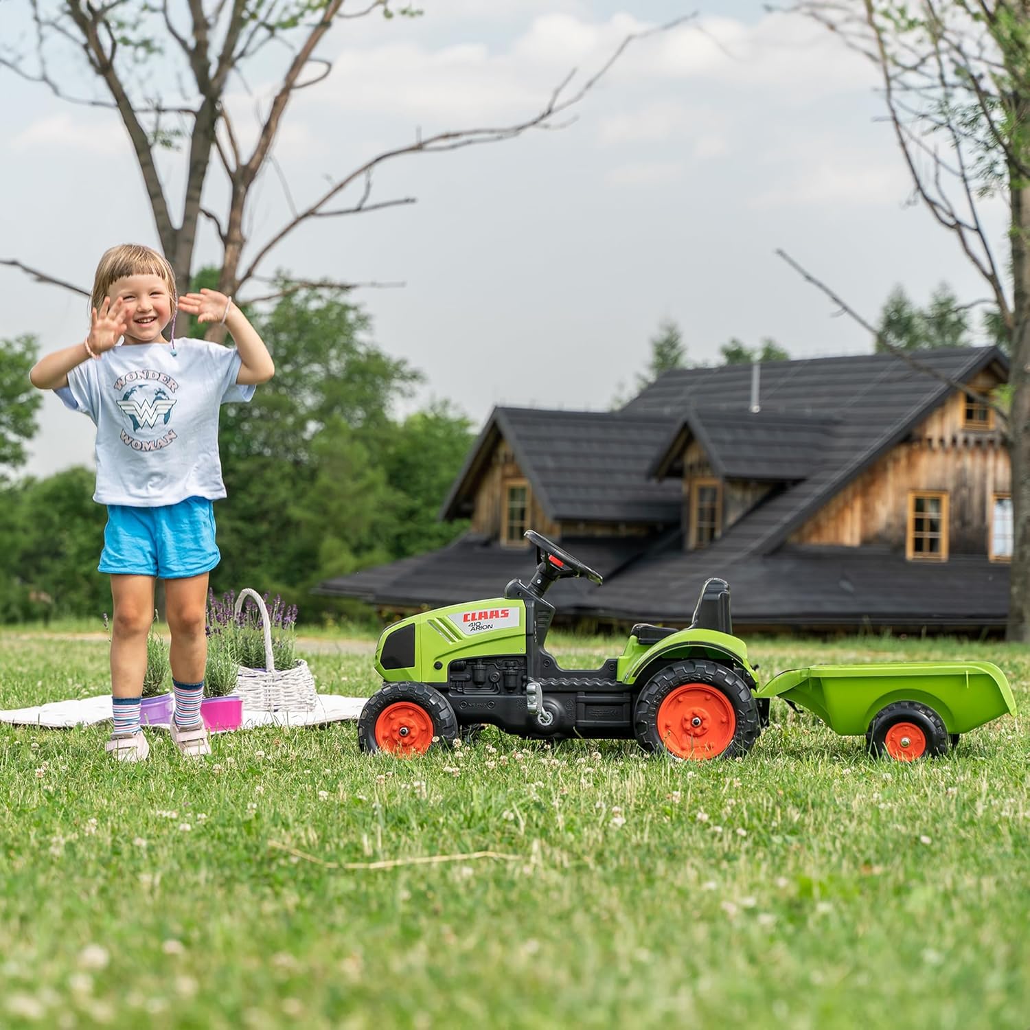 REPLICA FEDELE ALL'ORIGINALE: questo trattore per bambini è una replica dettagliata del noto Claas Arion 410. I piccoli appassionati di trattori provano una vera sensazione di fattoria e si immergono giocosamente nel mondo dell'agricoltura. RIMORCHIO PER TRASPORTO E GIOCO: il rimorchio rimovibile può essere utilizzato per trasportare sabbia, foglie, terra o giocattoli. Questo trasforma il giardino in un emozionante parco giochi pieno di fantasia e movimento. VOLANTE CON CLACSON PER PIÙ DIVERTIMENTO: Il robusto volante è dotato di clacson che rende l'esperienza di gioco ancora più realistica. I bambini possono “avvertire” chi li circonda e assumere, giocosamente, il ruolo di un piccolo guidatore. QUALITÀ MADE IN FRANCE: Il trattore è prodotto al 100% in Francia e colpisce per i suoi materiali di alta qualità e la lavorazione robusta. Sicuro, durevole e appositamente progettato per bambini dai 2 ai 5 anni. GIOCATTOLO DA ESTERNO PER UN USO LUNGO: con una capacità di carico fino a 30 kg e una comoda altezza del sedile di 33 cm, il trattore è l'ideale per ore di divertimento all'aria aperta, sia in giardino che in fattoria.