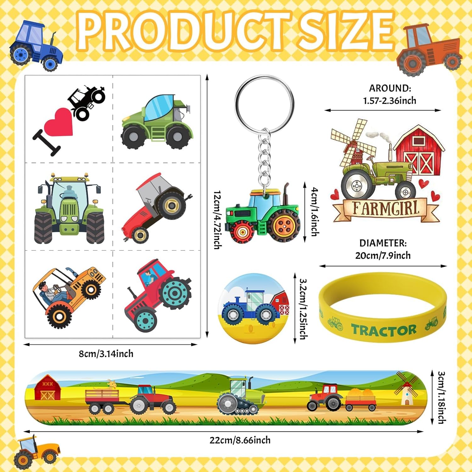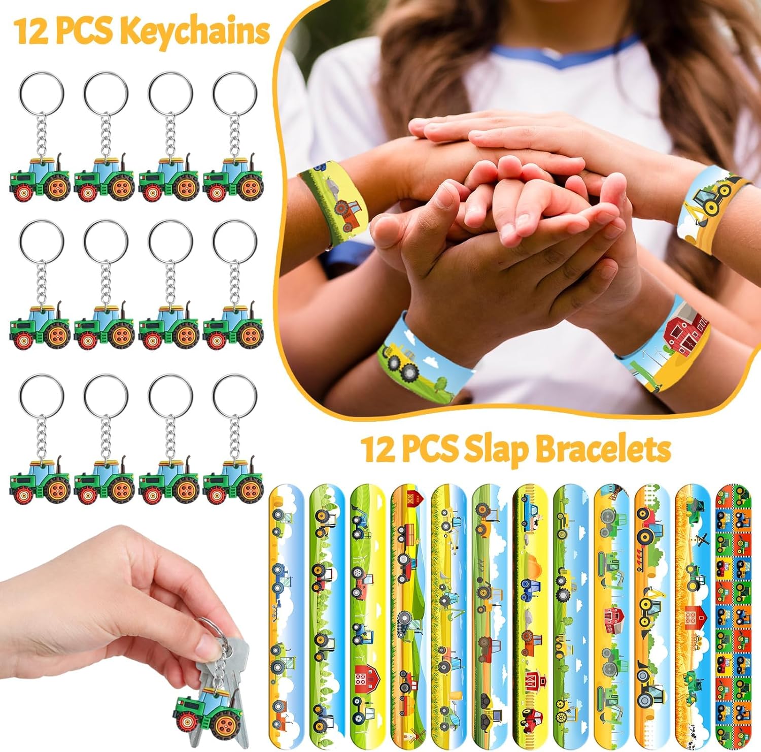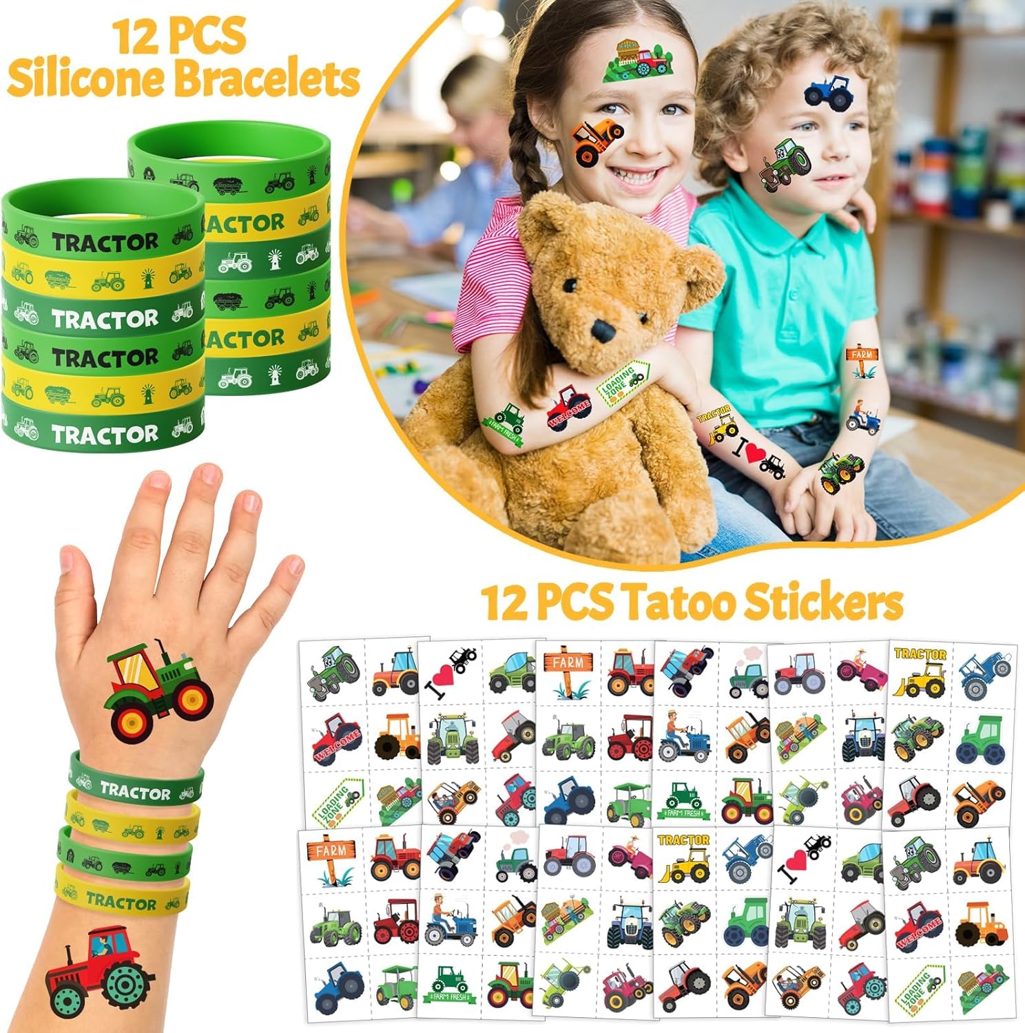 🚜 Set per feste con trattore da 110 pezzi - Tutto ciò di cui hai bisogno! Questo set della fattoria comprende 12 fogli di tatuaggi pretagliati (72 disegni!), 12 braccialetti applausi, 12 braccialetti in silicone, 12 portachiavi, 12 spille per trattore e 50 adesivi impermeabili. Il set perfetto per i piccoli appassionati di trattori – ad un prezzo eccezionale! 🎁 Pieno di colorata gioia contadina – Con trattori rossi e verdi, carri di fieno e fienili, ogni pezzo è pieno di fascino rurale. I bambini adorano scambiarsi braccialetti, collezionare adesivi e mostrare i tesori della loro fattoria! 💪 Adatto ai bambini e testato per la qualità - Realizzato con materiali morbidi e non tossici in conformità con gli standard di sicurezza statunitensi. I braccialetti in silicone sono resistenti all'allungamento, i braccialetti con applauso sono comodi da indossare e i tatuaggi sono facili da applicare e rimuovere: perfetti per la scuola e le feste! 🎉 IDEALE PER COMPLEANNI E ALTRO - Perfetto per feste di compleanno di trattori, scrigni del tesoro in classe, pomeriggi di gioco in fattoria o piccole campagne di regali. Che si tratti di una festa nella stalla o di un evento all'asilo, questo set porta il divertimento direttamente sul campo! 💡 Nessun problema, divertimento immediato: tutto è preconfezionato: basta riempire i sacchetti della festa e il gioco è fatto! Risparmia tempo ed energia e sorprendi i tuoi ospiti con regali premurosi e di alta qualità. Non è necessaria alcuna preparazione: basta aprire la borsa e festeggiare!