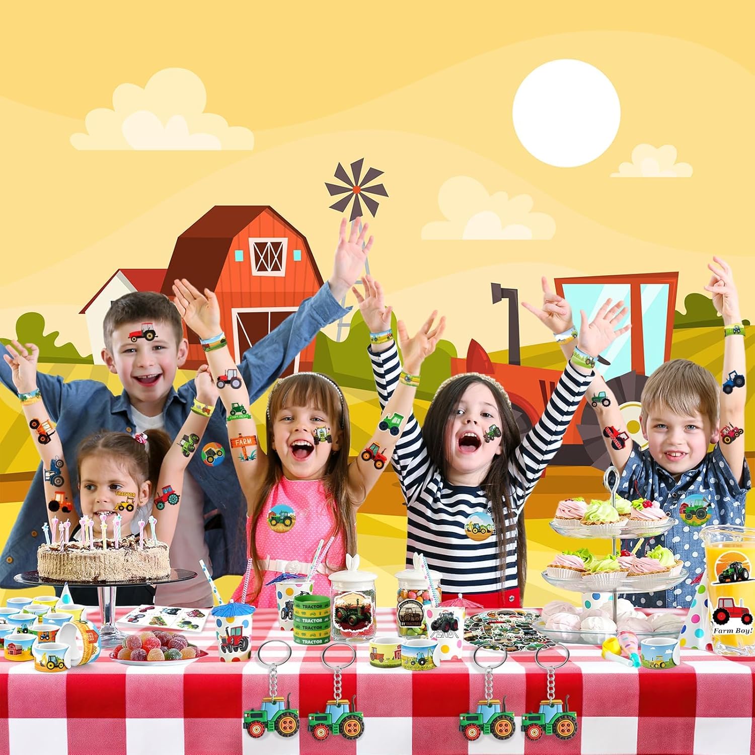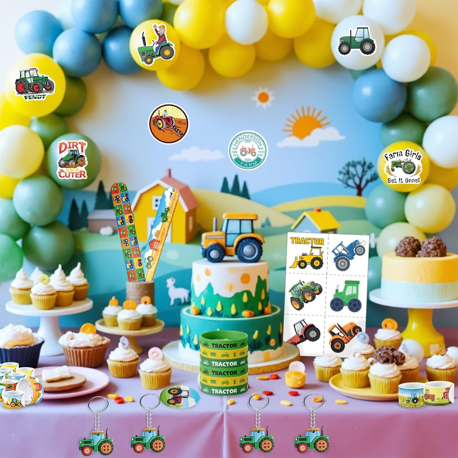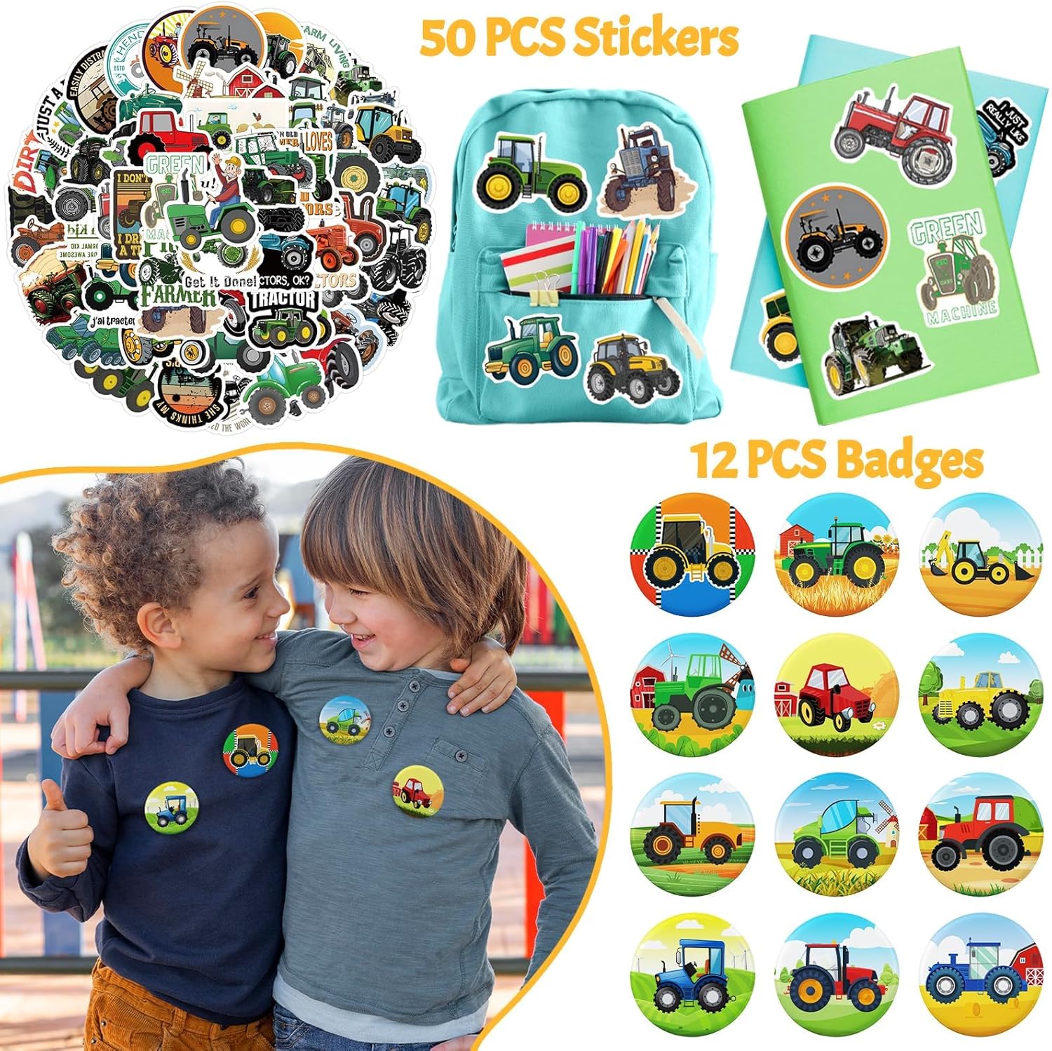 🚜 Set per feste con trattore da 110 pezzi - Tutto ciò di cui hai bisogno! Questo set della fattoria comprende 12 fogli di tatuaggi pretagliati (72 disegni!), 12 braccialetti applausi, 12 braccialetti in silicone, 12 portachiavi, 12 spille per trattore e 50 adesivi impermeabili. Il set perfetto per i piccoli appassionati di trattori – ad un prezzo eccezionale! 🎁 Pieno di colorata gioia contadina – Con trattori rossi e verdi, carri di fieno e fienili, ogni pezzo è pieno di fascino rurale. I bambini adorano scambiarsi braccialetti, collezionare adesivi e mostrare i tesori della loro fattoria! 💪 Adatto ai bambini e testato per la qualità - Realizzato con materiali morbidi e non tossici in conformità con gli standard di sicurezza statunitensi. I braccialetti in silicone sono resistenti all'allungamento, i braccialetti con applauso sono comodi da indossare e i tatuaggi sono facili da applicare e rimuovere: perfetti per la scuola e le feste! 🎉 IDEALE PER COMPLEANNI E ALTRO - Perfetto per feste di compleanno di trattori, scrigni del tesoro in classe, pomeriggi di gioco in fattoria o piccole campagne di regali. Che si tratti di una festa nella stalla o di un evento all'asilo, questo set porta il divertimento direttamente sul campo! 💡 Nessun problema, divertimento immediato: tutto è preconfezionato: basta riempire i sacchetti della festa e il gioco è fatto! Risparmia tempo ed energia e sorprendi i tuoi ospiti con regali premurosi e di alta qualità. Non è necessaria alcuna preparazione: basta aprire la borsa e festeggiare!