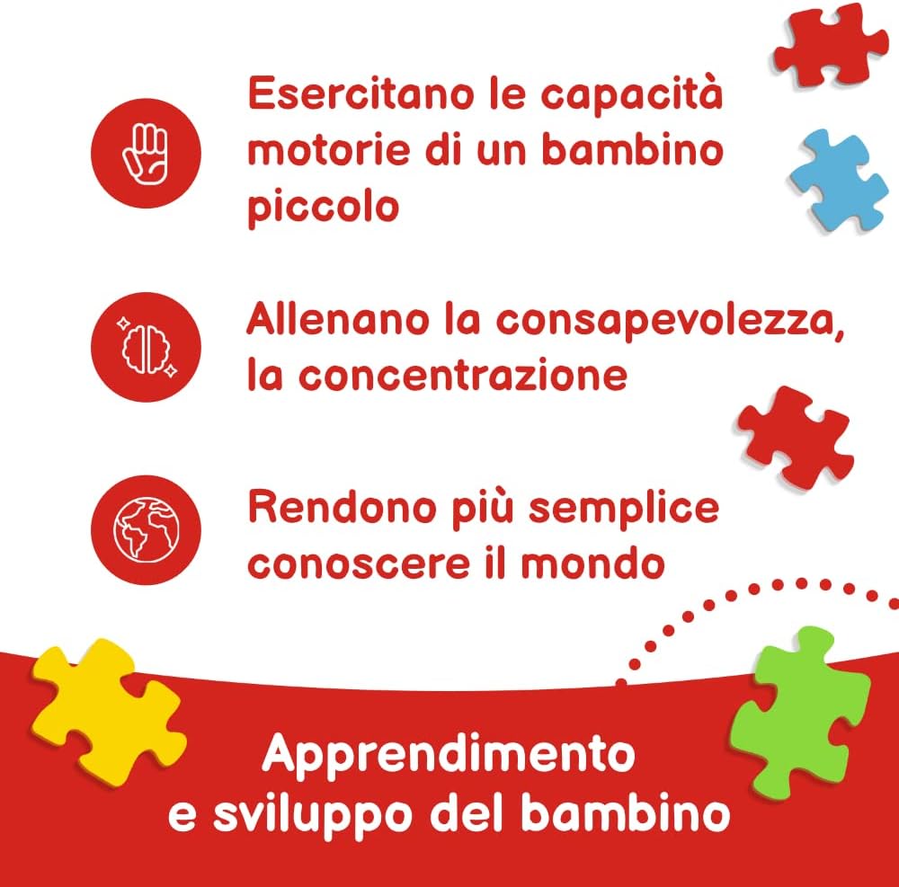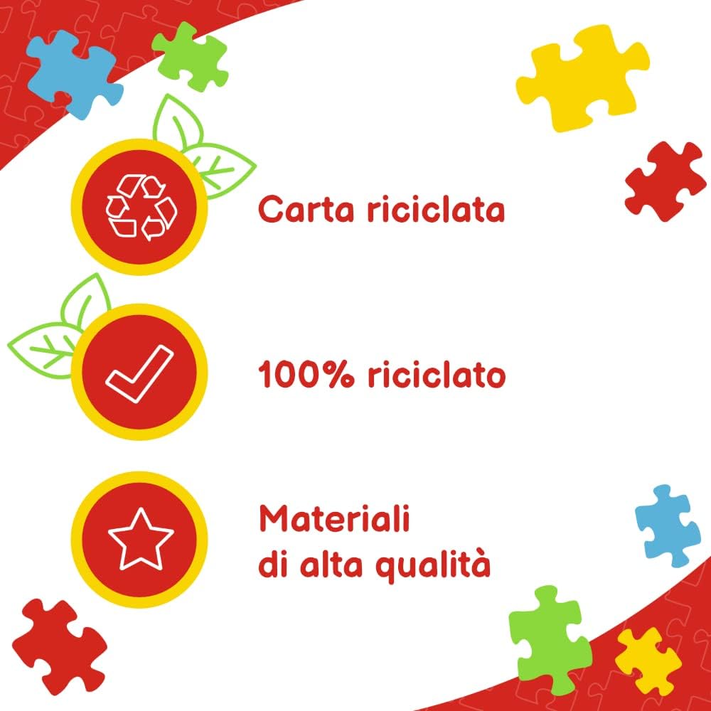I puzzle con cornice sono puzzle composti da 15 pezzi molto grandi pensati per i bambini più piccoli. Una volta assemblato, il puzzle forma un'immagine di 159x258 mm che raffigura i personaggi del cartone animato Topolino e i suoi amici. La cornice e il supporto rigido aiutano a comporre i puzzle e a spostarli facilmente. Grazie ai pezzi grandi e alla cornice, anche i bambini più piccoli possono affrontare la sfida da soli. I colori vivaci e le forme accattivanti dei puzzle incoraggiano i bambini a giocare, mentre le interessanti illustrazioni attirano la loro attenzione. Comporre i puzzle stimola la curiosità verso il mondo e l'immaginazione, calma i bambini, esercita la concentrazione e insegna la pazienza e la percezione. Un regalo eccellente per bambini di età superiore ai 3 anni. Realizzato con materiali naturali sicuri e di alta qualità.