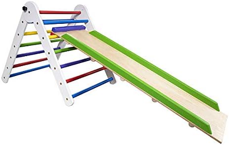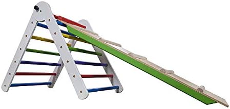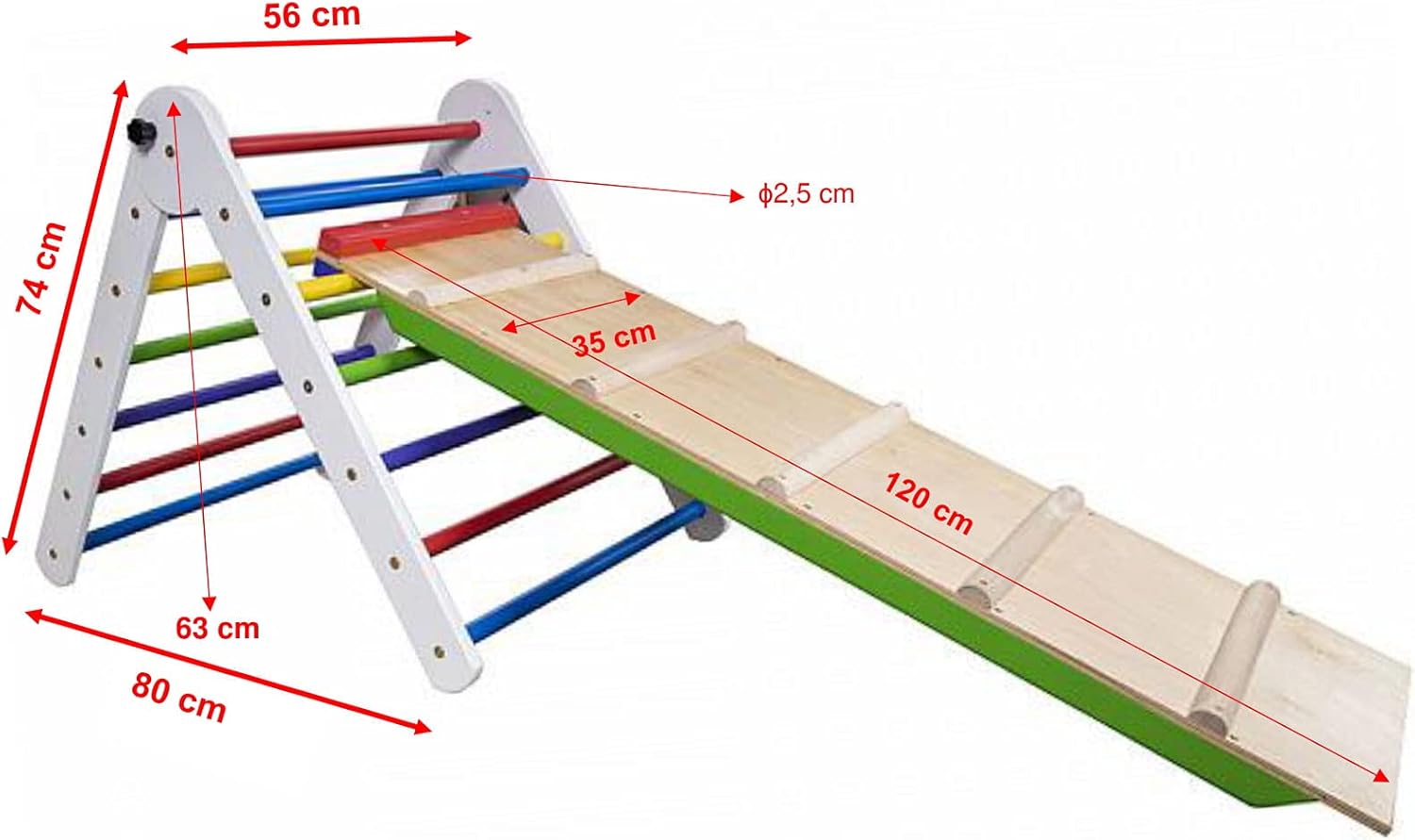 Il pacchetto include: Triangolo bambino con barre, Scivolo, Set attrezzi per il montaggio. l prodotto è realizzato in legno di faggio di alta qualità. Il legno viene levigato e verniciato con vernice ad acqua; sicuro per i bambini (certificato EN 71-3). Dimensioni: altezza 74 cm, lunghezza 56 cm, scivolo 120 x 35 cm, diametro barre 2,5 cm, peso 14 kg. L'inclinazione di questo triangolo non è regolabile e non può essere modificata. Adatto per bambini dai 1-5 anni. Il carico massimo possibile fino a 30 kg. Per uso interno. Triangolo viene fornita smontata con istruzioni di montaggio (lingua italiana non garantita). Solo per uso interno/montaggio semplice/consegna dal magazzino europeo/consegna entro 2-5 giorni lavorativi