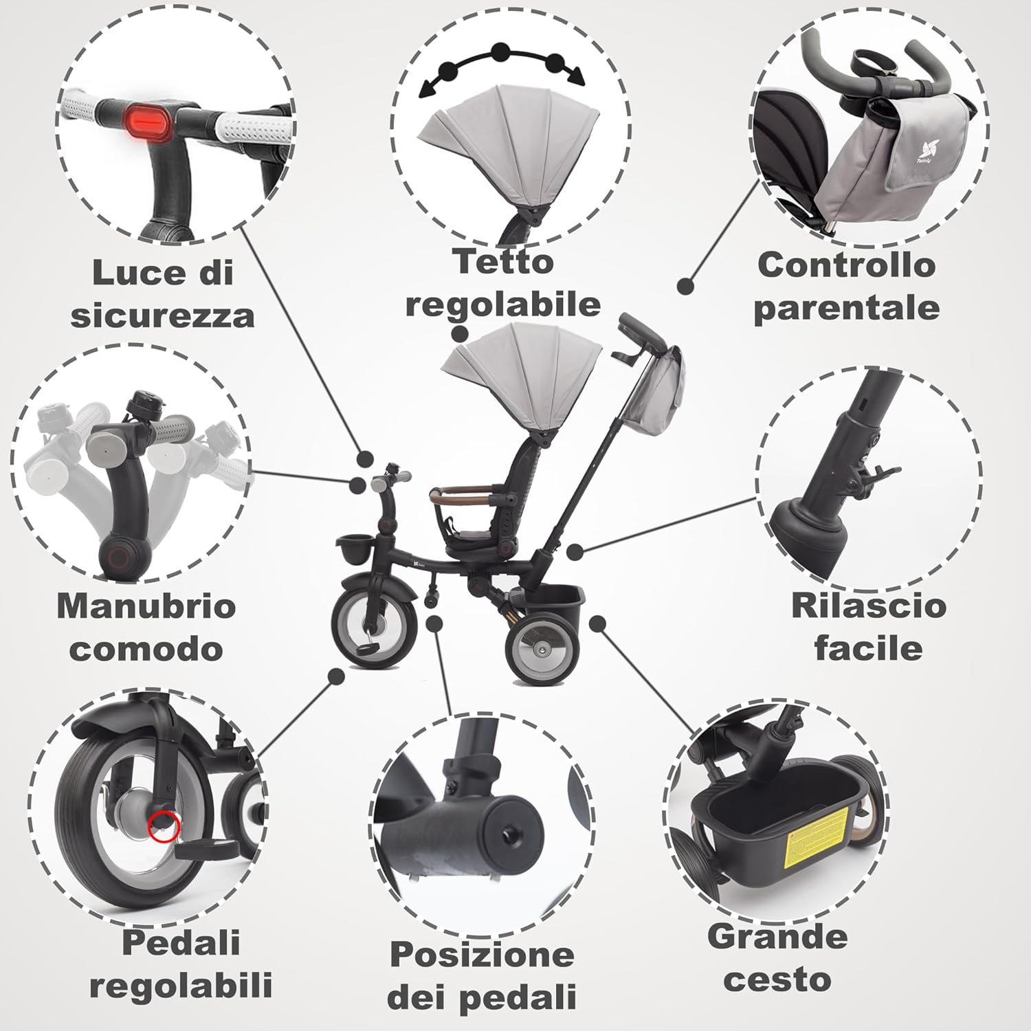 ⭐Multifunzionale: Triciclo regolabile da 9 mesi a 5 anni. Sedile orientato in avanti o indietro, adattabile alle abilità del bambino. Ideale per imparare a pedalare e godersi all'aperto. ⭐ Design pratico e resistente: Triciclo pieghevole, facile da trasportare e riporre. Ruote airless per una maggiore durata e telaio in lega di magnesio resistente e leggero. Facile da pulire e mantenere. ⭐Comfort e comfort: seduta ergonomica con schienale alto e reclinabile, poggiapiedi e capottina regolabile con filtro UPF 50+. Design pratico e resistente: triciclo pieghevole, facile da trasportare e riporre. Ruote airless per una maggiore durata e telaio in lega di magnesio resistente e leggero. Facile da pulire e mantenere. Protegge il bambino in qualsiasi condizione atmosferica, anche sotto il sole o la pioggia. ⭐ Ideale per genitori: manubrio regolabile in 3 livelli per adattarsi all'altezza dei genitori. Accessori come campanello, bustina, 2 cestini per giocattoli e portabicchieri per un maggiore comfort durante le passeggiate in famiglia. ⭐Sicurezza migliorata: cinture di sicurezza a 3 punti con cuscinetti, doppi freni posteriori, barriera rimovibile e ruota anteriore senza lacune. Funzione a ruota libera per il bambino a pedalare senza spostare il triciclo.
