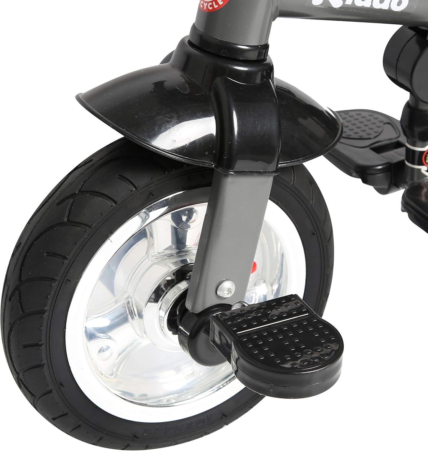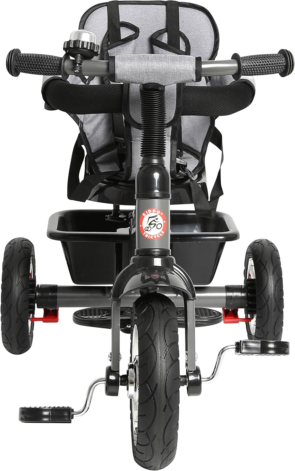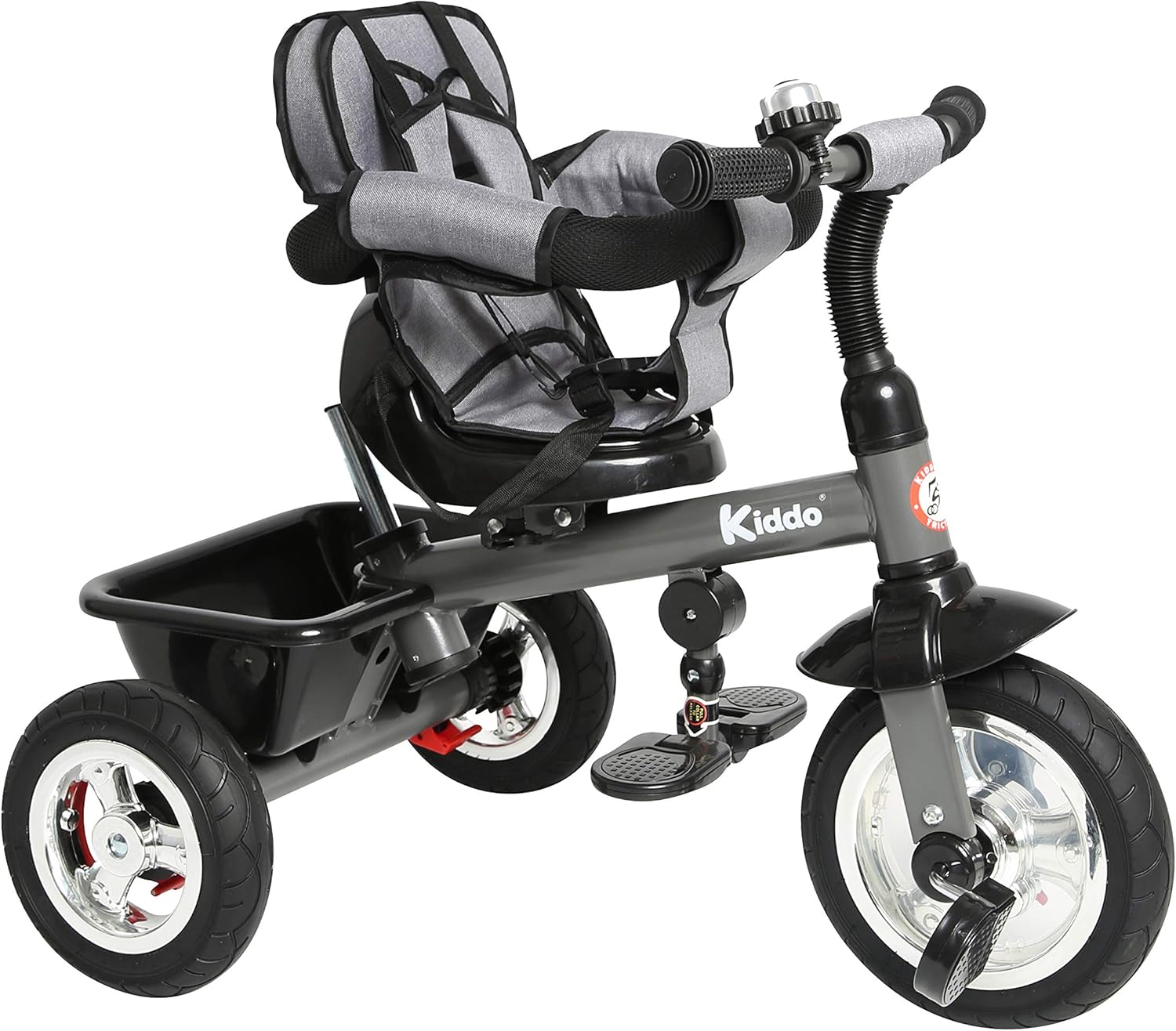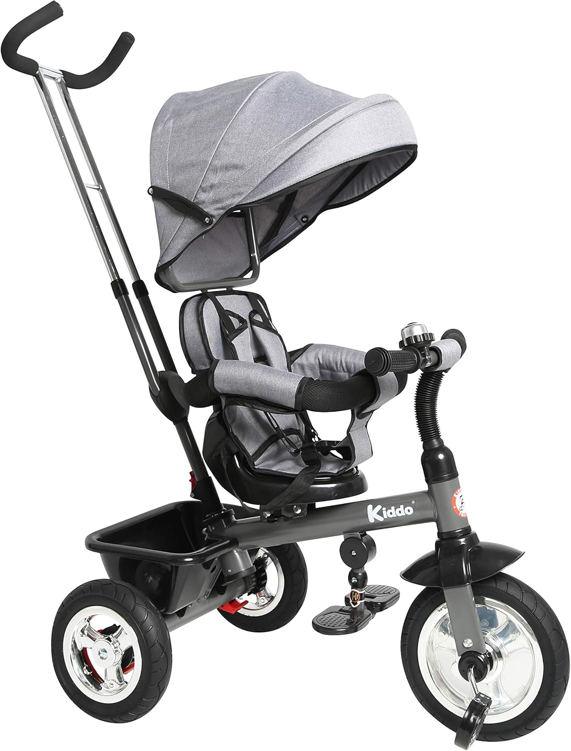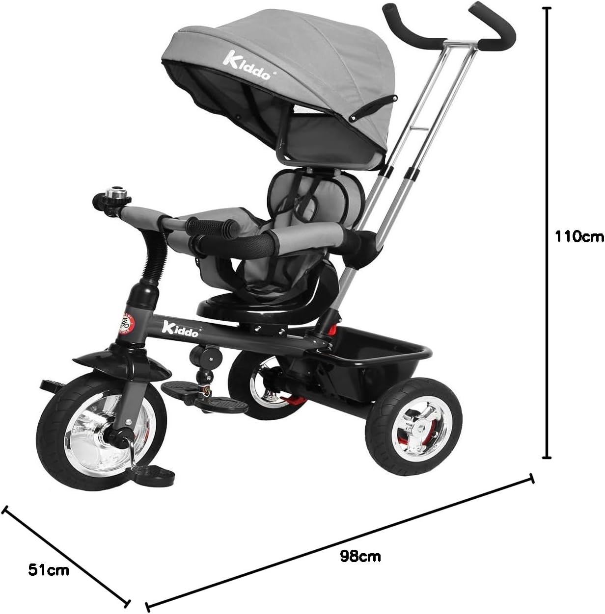Triciclo Kiddo 4 in 1 - Ora con sedile girevole, freno posteriore e interruttore a pedale anteriore Dotato di telaio in metallo, ruote cromate, pneumatici in gomma, campanello, maniglia dello sterzo per genitori regolabile e rimovibile, sedile girevole, freno posteriore, cappottina parasole regolabile e rimovibile, barriere per i braccioli regolabili e rimovibili, sedile imbottito rimovibile e cintura di sicurezza a 3 punti, cestello portaoggetti posteriore, pedali antiscivolo e poggiapiedi regolabili, interruttore di blocco/sblocco dei pedali (l'interruttore consente di accendere e spegnere (sbloccare) i pedali della ruota anteriore con Ruota Adatto a bambini dai 12 mesi ai 5 anni. Il triciclo Kiddo 4 in 1 è stato appositamente progettato per crescere con il tuo bambino. Dimensioni del prodotto: circa L 98 x P 51 x A 110 cm - Certificato EN-71 - È richiesta la supervisione di un adulto