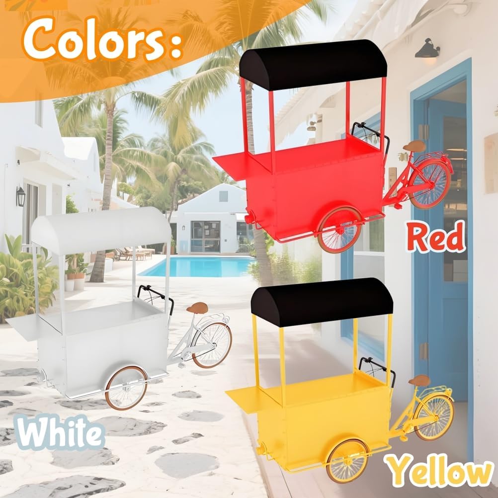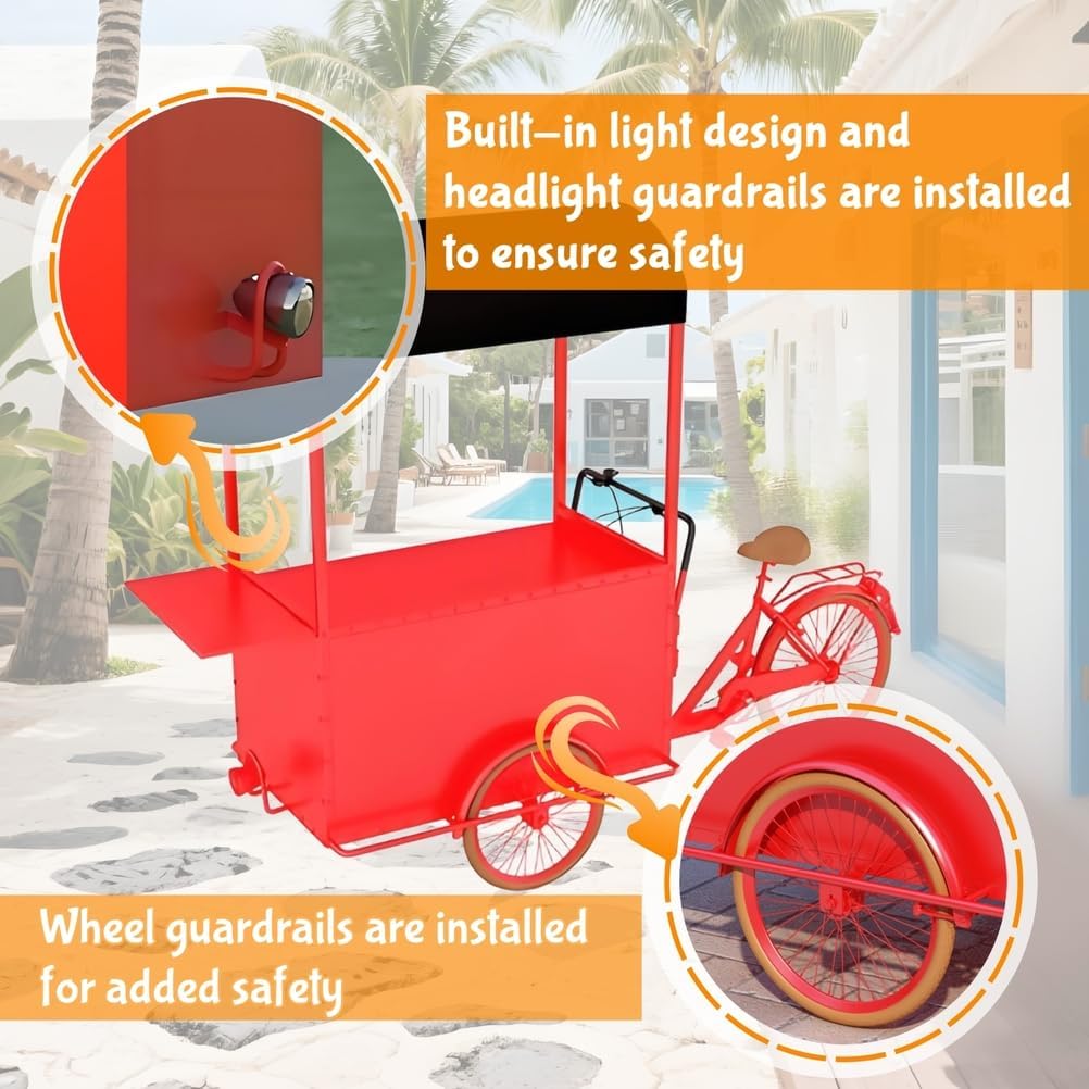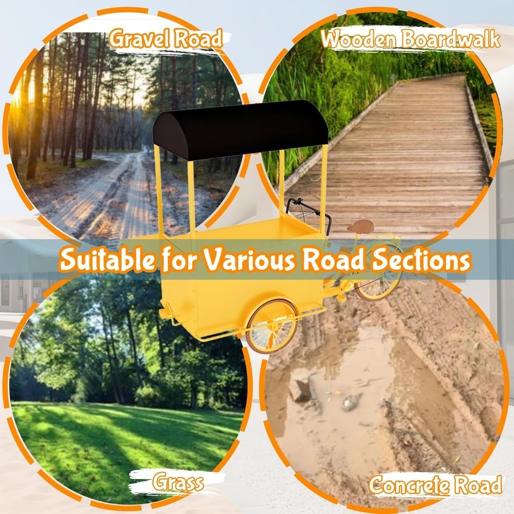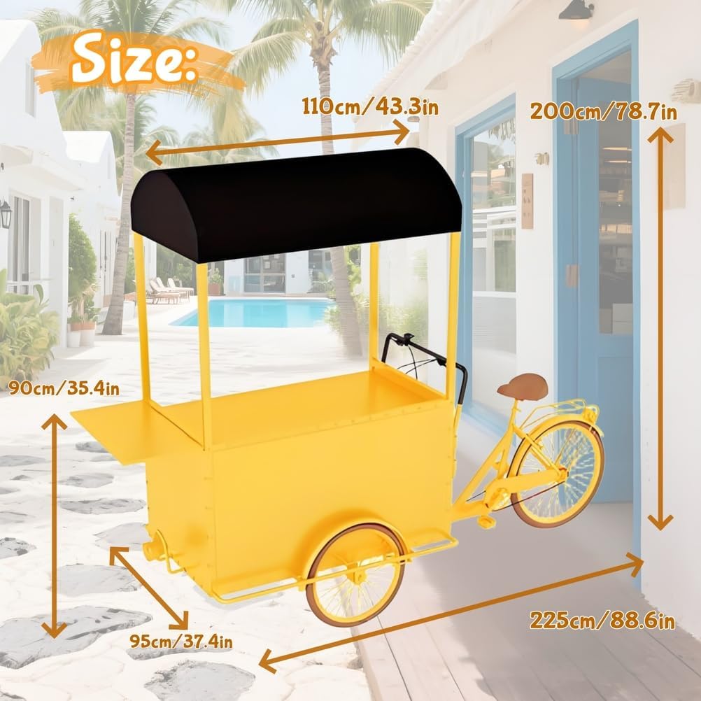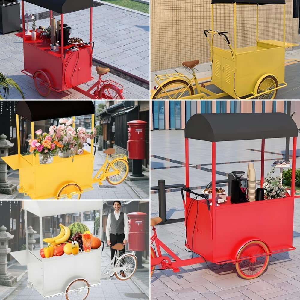 Materiali di alta qualità: questo grande carrello per bicicletta è realizzato con materiali di alta qualità e rigorosamente controllati. I suoi pontoni in ferro sono resistenti ai graffi e all'usura e offrono una forte capacità di carico. Design del movimento inverso: questo distributore automatico a tre ruote presenta un design unico del movimento inverso. Sia in posizione fissa che in movimento, offre un'esperienza di guida flessibile e senza sforzo. Stand promozionale multifunzione: questo carrello per biciclette è dotato di un'ampia superficie di ristorazione pieghevole e regolabile in modo continuo, attirando così i clienti e migliorando l'efficacia promozionale del tuo stand. Facile montaggio: il design complessivo del carrello per biciclette è semplice ed elegante e il suo assemblaggio è semplice e non richiede competenze particolari. Si piega facilmente per lo stoccaggio e il trasporto. Adattabile a molteplici scenari: un rimorchio per fiori commerciale può essere utilizzato come bancarella mobile, camion di cibo, esposizione in un centro commerciale o decorazione di un'attrazione turistica, espandendo la tua attività di vendita al dettaglio.