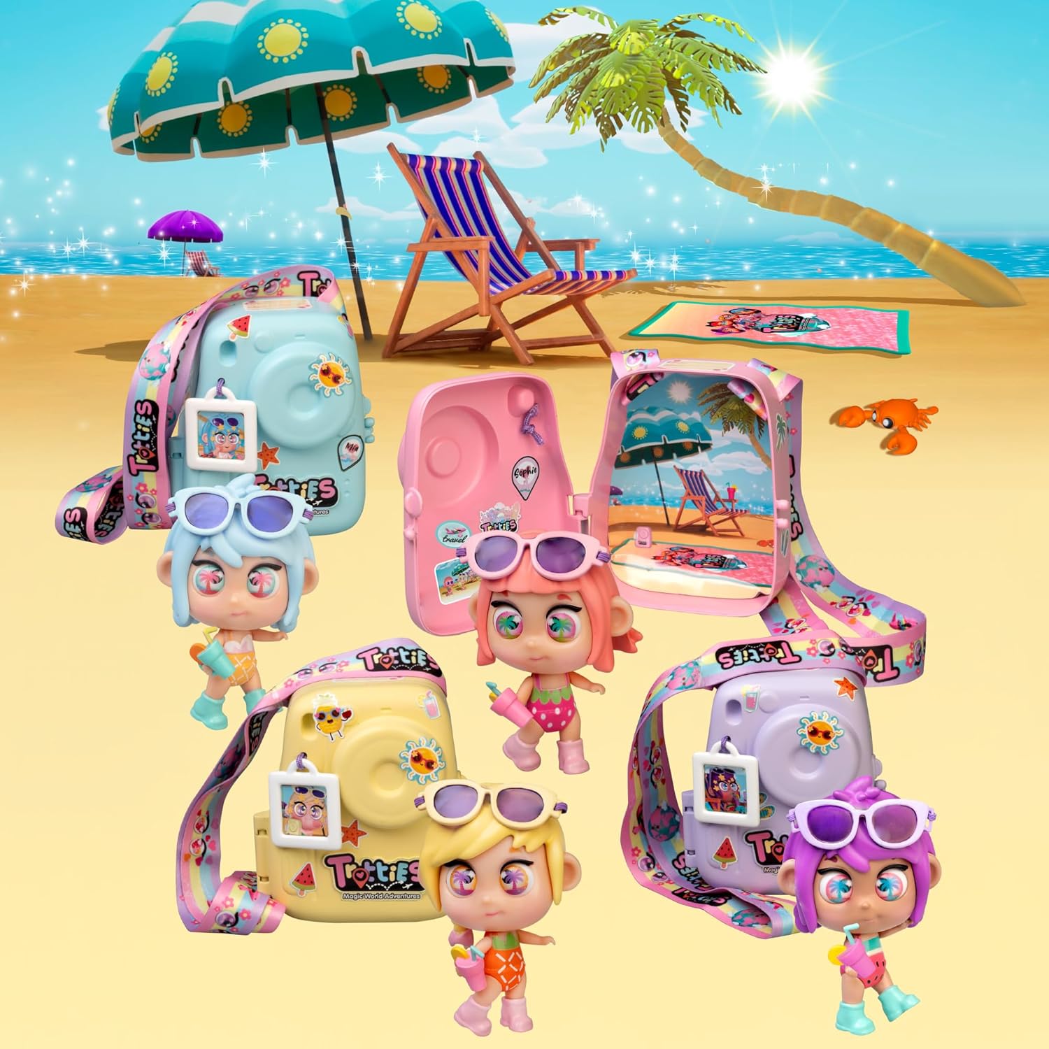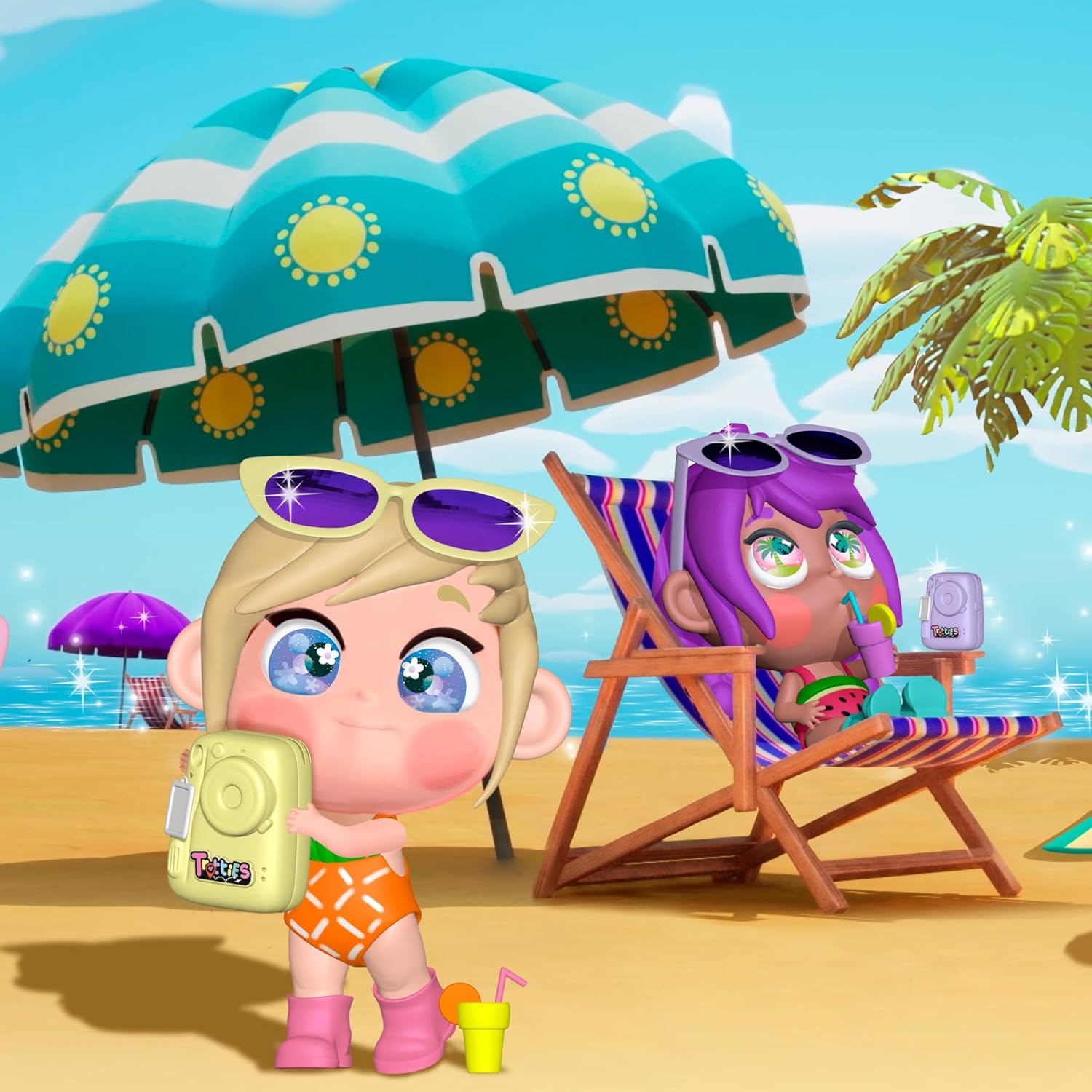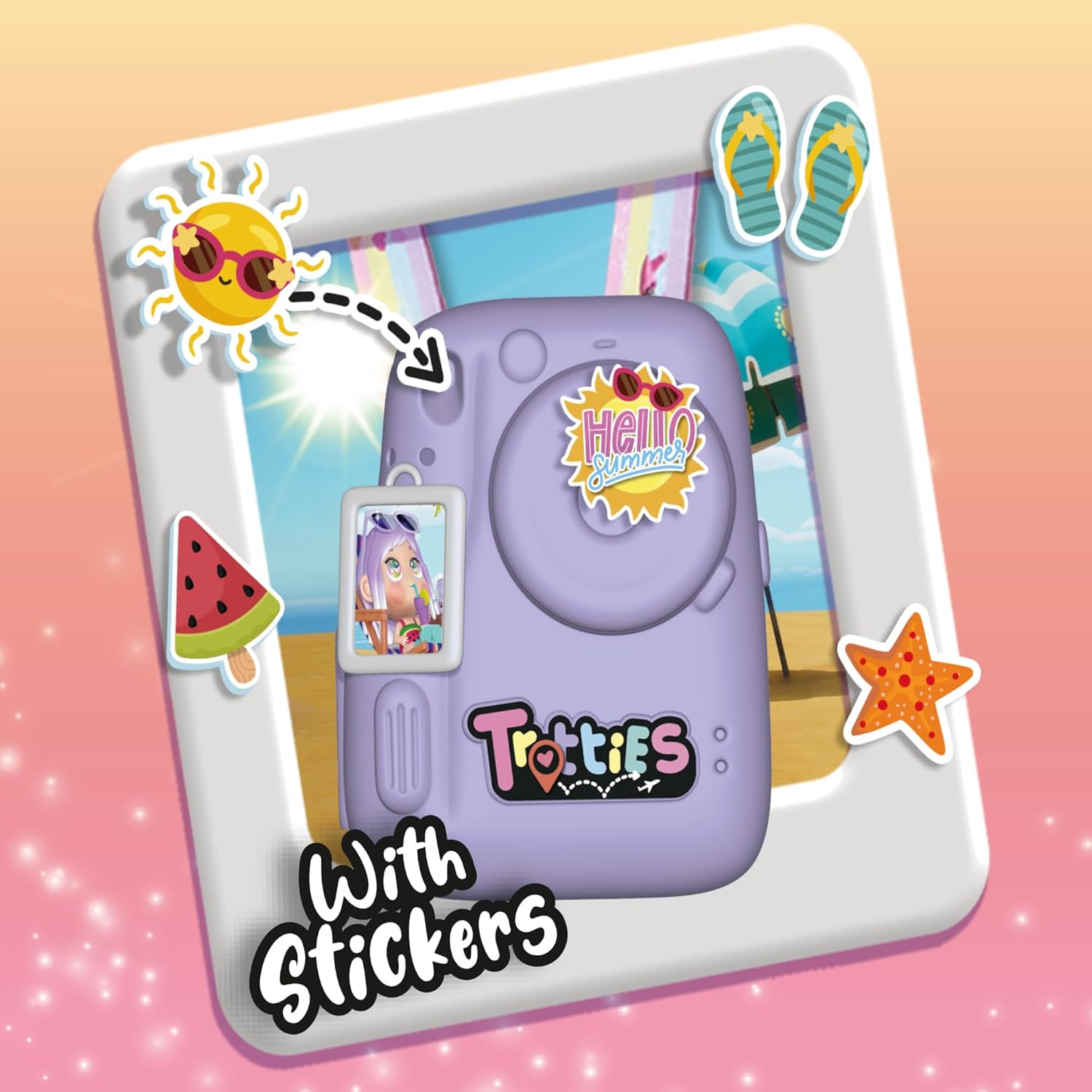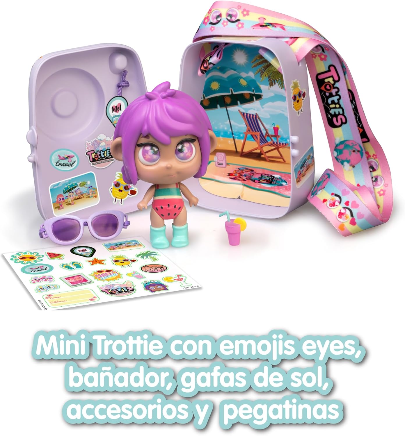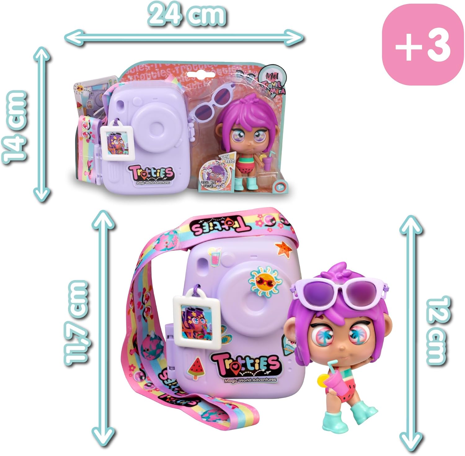 Mini Trotties Mel figura da 12 cm con borsa fotografica da viaggio Mel è vestita per le vacanze estive con un costume da bagno in stile anguria e occhiali da sole. La figura ha occhi emoji intercambiabili e braccia, gambe e testa articolate. I suoi vestiti sono intercambiabili con quelli di altre bambole Mini Trotties. La borsa per fotocamera ha una cinghia e sono inclusi adesivi per decorarla.