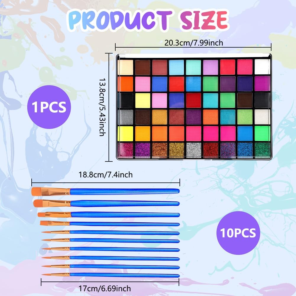 🎨【Set di pittura del viso per feste in 54 colori】 Questo set contiene 45 colori brillanti, 9 polveri glitterate e 10 pennelli unici di forme diverse, in grado di soddisfare le esigenze di diversi look e occasioni. Sia i bambini che gli adulti possono essere creativi e creare una varietà di look, dalla semplice pittura del viso alla complessa body art. 👧【 Palette di pittura per il corpo sicura】 Il nostro set di pittura per il viso per bambini è realizzato in materiale sicuro e non tossico, delicato sulla pelle, ipoallergenico, naturale, conforme alle normative UE e USA. Nessuna preoccupazione per la sicurezza della pelle del tuo bambino. Tuttavia, la pelle di ogni persona è diversa, per evitare possibili disagi, si prega di fare un test di allergia prima di utilizzare la palette di trucchi. 🌈【Colori vivaci e a lunga durata】I nostri colori per il viso offrono un'ampia gamma di colori intensi e brillanti che durano tutto il giorno. Non sbiadiscono e mantengono la loro luminosità anche sulla pelle sudata. Creano e rimuovono facilmente look straordinari, perfetti per le feste dei bambini o per il trucco di Halloween. 🎭【Facile da usare e da pulire】 Applicare il colore con i pennelli in dotazione e lasciare asciugare per una finitura liscia e senza crepe. Lavabile dopo l'uso con acqua e sapone senza strofinare. Il set contiene diversi pennelli per aiutarvi a iniziare. 🥳【Perfetto per qualsiasi celebrazione】 Che si tratti di Halloween, feste in maschera, festival, carnevali, feste di compleanno, eventi cosplay, eventi scolastici, giochi sportivi o spettacoli teatrali - questo trucco per bambini farà sì che i bambini brillino con i loro disegni unici per il viso e il corpo. Aggiungete un tocco personale a qualsiasi festa.