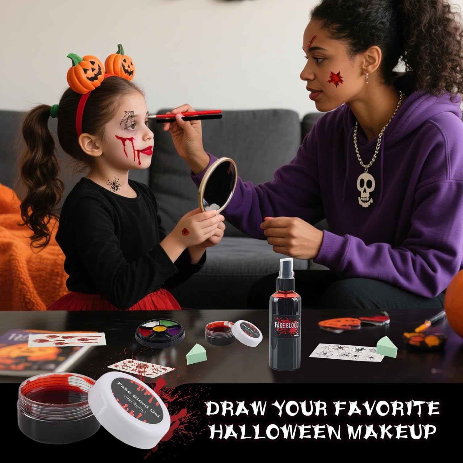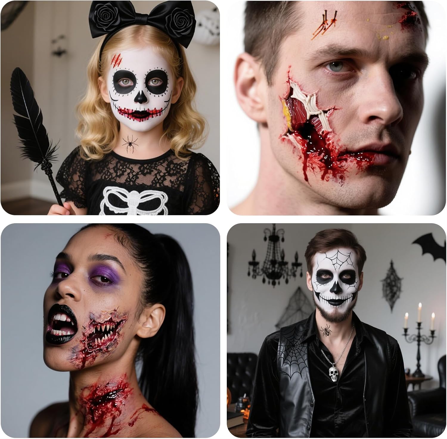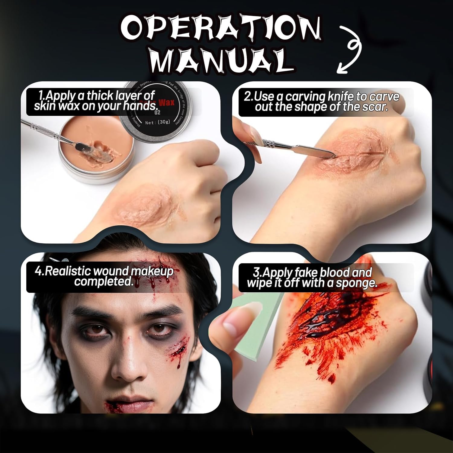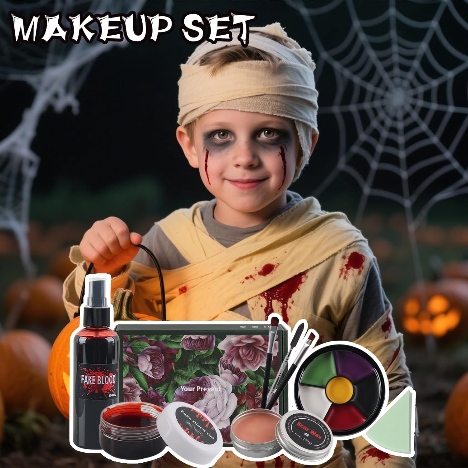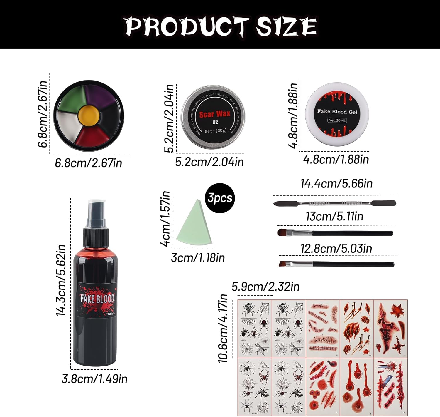 【Kit Trucco Halloween】Contiene: 30g di cera color pelle, 10 tatuaggi effetto cicatrice, 1 spatola per cera, 3 spugnette triangolari per trucco, 1 spray di sangue finto da 100g, 2 pennelli (testa larga + angolata), una tavolozza con 6 colori (nero, bianco, rosso, viola, verde, giallo) e 30ml di gel sangue finto. Tutto il necessario per creare trucchi horror realistici per Halloween 【Sicuro e delicato sulla pelle】Il make up halloween utilizza formule non tossiche, ipoallergeniche ed ecologiche, adatte alla maggior parte dei tipi di pelle. La cera è morbida e facile da modellare, mentre il sangue finto halloween lavabile è realizzato con pigmenti alimentari e base acquosa, privo di sostanze chimiche nocive e inodore. Ogni componente è testato MSDS. Si consiglia di testare su una piccola zona dietro l’orecchio prima del primo utilizzo 【Effetto Realistico】La tavolozza a 6 colori può essere miscelata liberamente. In combinazione con la cera e il trucco sangue finto, consente di simulare vari tipi di ferite halloween. I tatuaggi facilitano un’applicazione rapida, mentre lo spray crea un effetto di schizzi di sangue estremamente realistico – ideale per teatro, film o feste a tema halloween trucchi 【Facile da Usare】La cera si modella facilmente con la spatola, il trucco si applica con pennelli o dita, e lo spray è pratico e asciuga rapidamente. Il sangue finto lavabile si rimuove facilmente con acqua tiepida e detergente delicato – perfetto per feste e scherzi quotidiani 【Uso Versatile】Il trucchi halloween make up è perfetto per Halloween, cosplay, feste horror, palcoscenici teatrali e molto altro. Che tu voglia diventare un vampiro, uno zombie o un clown spaventoso, il tuo halloween trucco sarà realistico e d’effetto, rendendoti protagonista della serata
