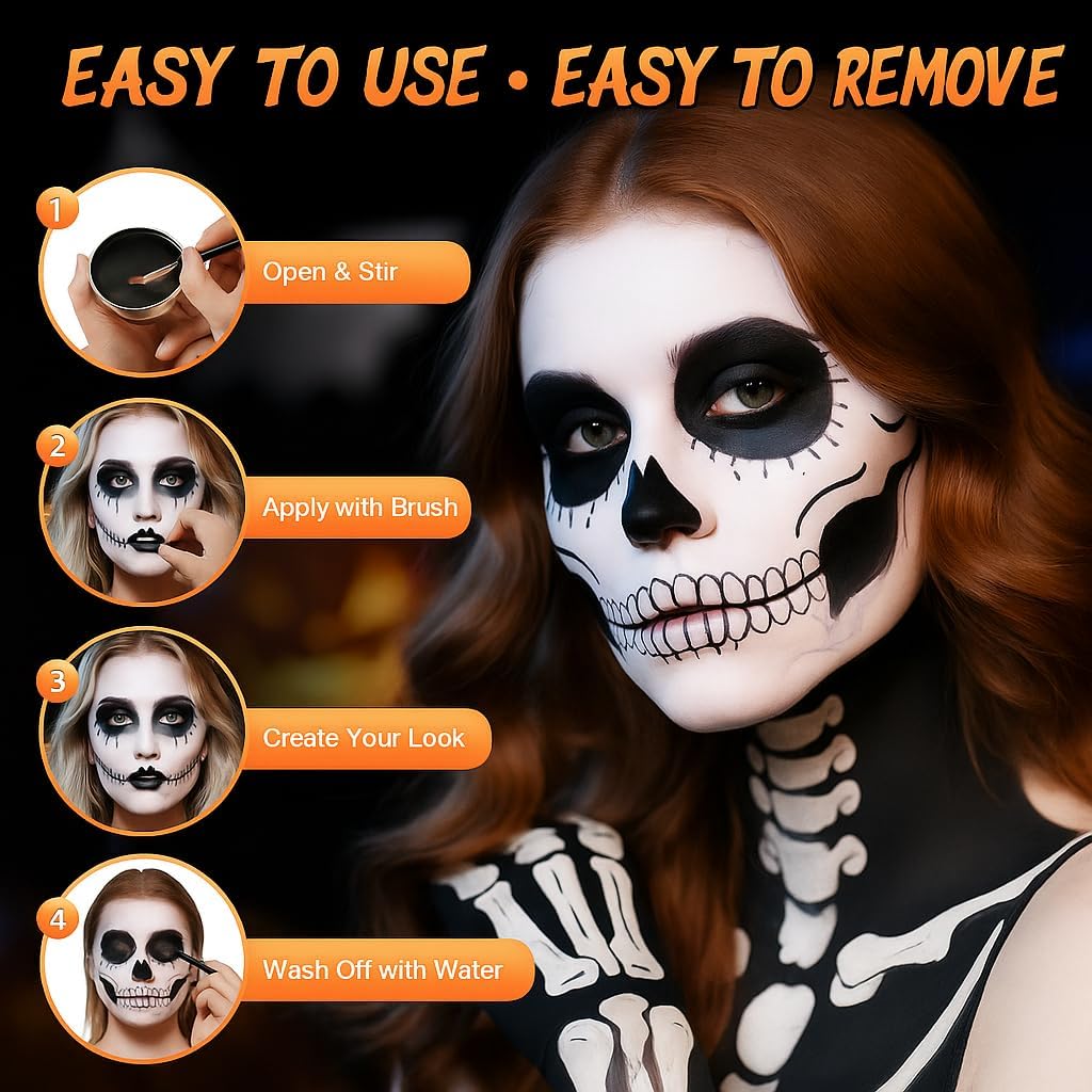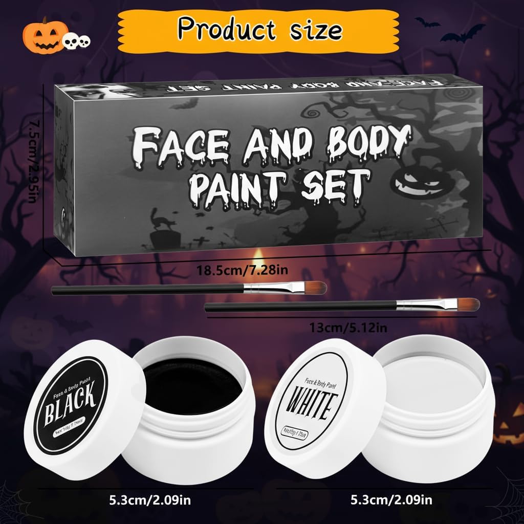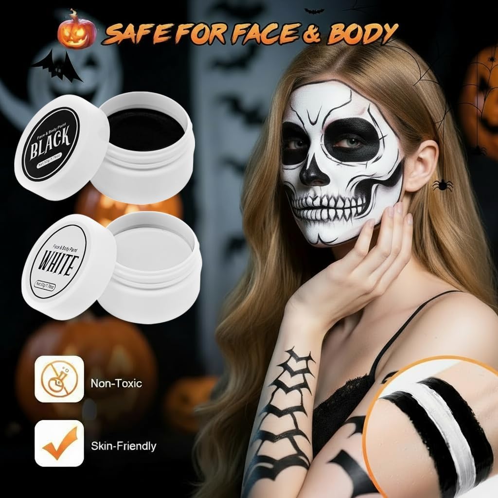 【Alta Coprenza】Trucco di Halloween in bianco e nero può soddisfare le tue esigenze quotidiane e ti permette di creare un look spettrale e drammatico. Trucchi halloween bianco nero ideale per trucco e body painting per far risaltare il tuo look di Halloween dalla massa. 【Ingredienti Delicati】Trucco di Halloween per adulti è adatto a tutti i tipi di pelle. Trucchi bianco e nero per viso halloween realizzato con materie prime cosmetiche di alta qualità e sicure, puoi usarlo senza preoccupazioni. 【A lunga Durata & Anti-sbavature】la texture del set di trucco di Halloween è super morbida e delicata, con un'alta coprenza senza seccare o sfaldarsi. Trucco per il viso di halloween rimane in posizione per tutta la durata dell'evento, garantendo un trucco impeccabile per tutta la notte. 【Facile da Rimuovere】Trucco bianco per viso halloween basta detergere delicatamente la pelle con uno struccante o con olio d'oliva. Questo set di trucchi per Halloween ti coprirà dall'inizio alla fine, assicurandoti un'esperienza di trucco per Halloween sicura e senza pensieri. 【Ampia Gamma Usi】Trucco Halloween è adatto a varie occasioni come feste a tema, trucco di Carnevale, eventi di Halloween, spettacoli teatrali, ecc. ed è perfetto per impersonare scheletri, clown e fantasmi.