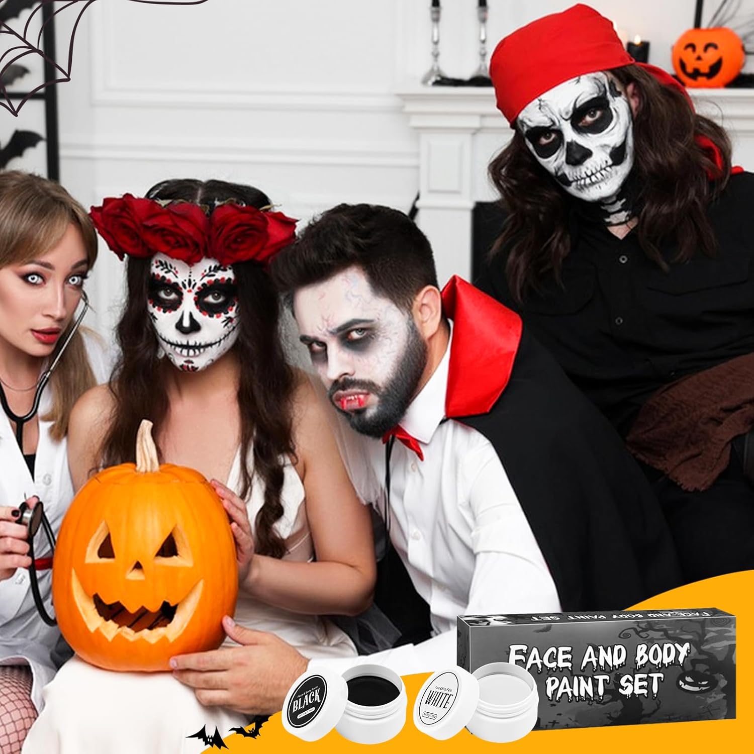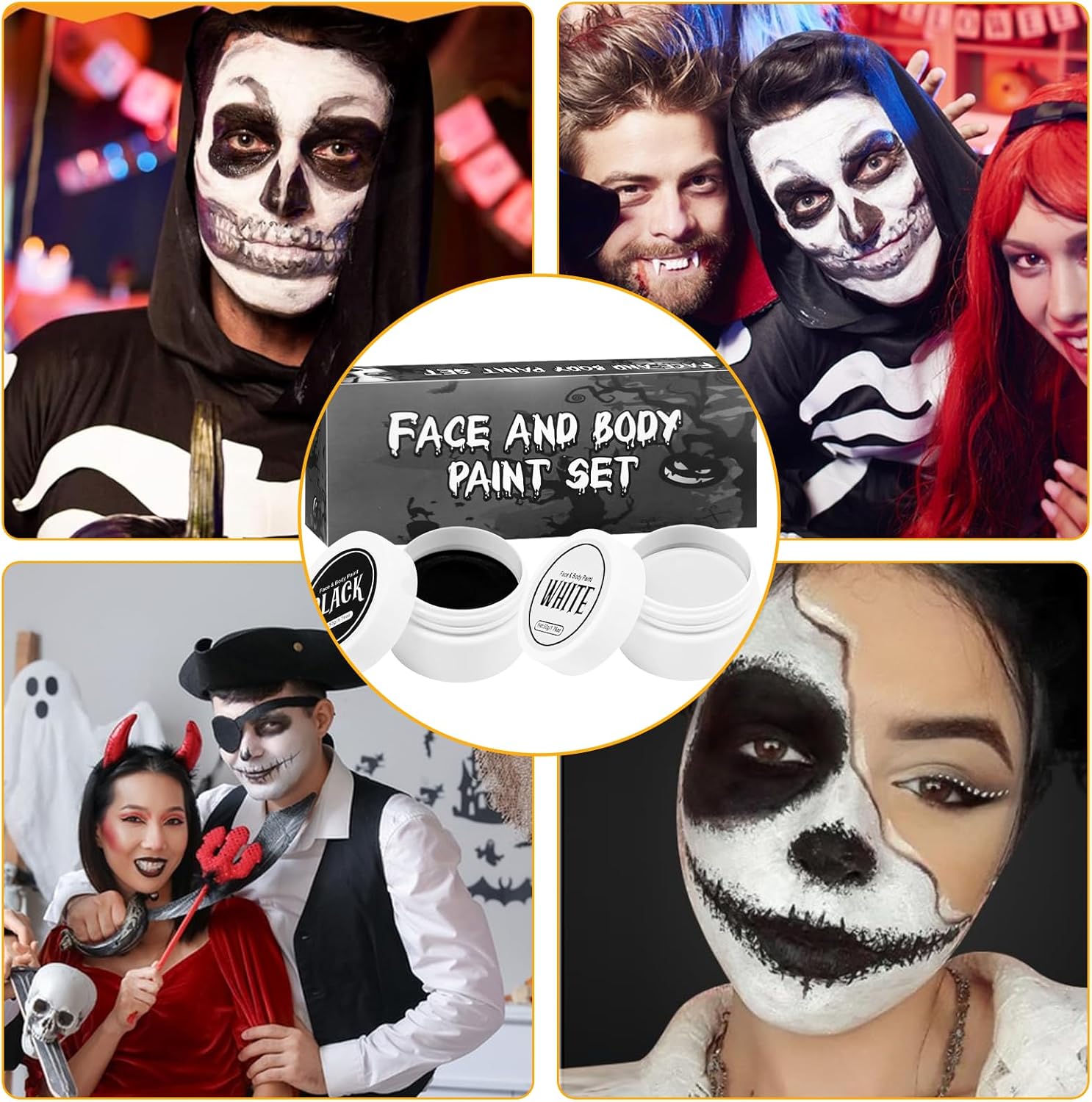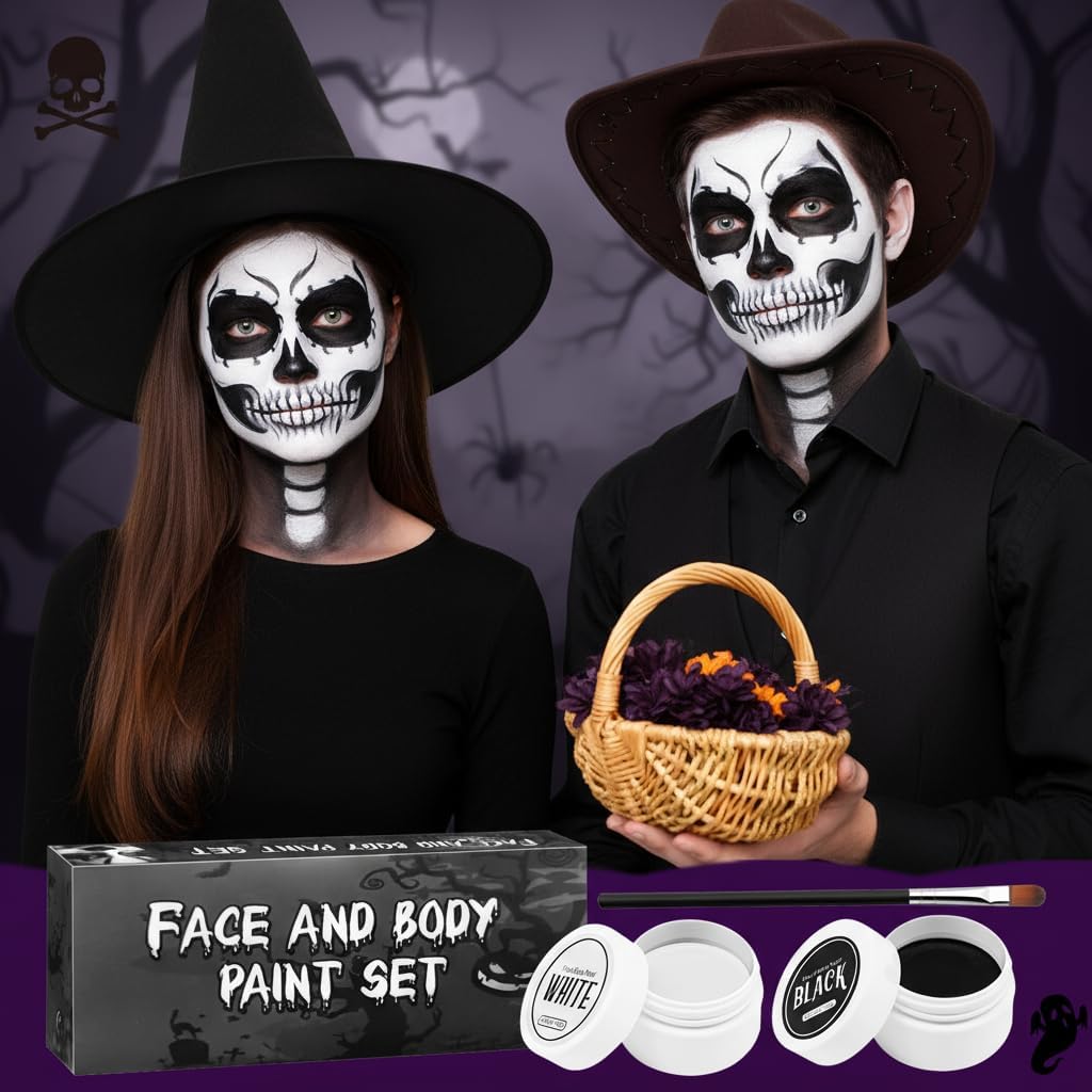 【Alta Coprenza】Trucco di Halloween in bianco e nero può soddisfare le tue esigenze quotidiane e ti permette di creare un look spettrale e drammatico. Trucchi halloween bianco nero ideale per trucco e body painting per far risaltare il tuo look di Halloween dalla massa. 【Ingredienti Delicati】Trucco di Halloween per adulti è adatto a tutti i tipi di pelle. Trucchi bianco e nero per viso halloween realizzato con materie prime cosmetiche di alta qualità e sicure, puoi usarlo senza preoccupazioni. 【A lunga Durata & Anti-sbavature】la texture del set di trucco di Halloween è super morbida e delicata, con un'alta coprenza senza seccare o sfaldarsi. Trucco per il viso di halloween rimane in posizione per tutta la durata dell'evento, garantendo un trucco impeccabile per tutta la notte. 【Facile da Rimuovere】Trucco bianco per viso halloween basta detergere delicatamente la pelle con uno struccante o con olio d'oliva. Questo set di trucchi per Halloween ti coprirà dall'inizio alla fine, assicurandoti un'esperienza di trucco per Halloween sicura e senza pensieri. 【Ampia Gamma Usi】Trucco Halloween è adatto a varie occasioni come feste a tema, trucco di Carnevale, eventi di Halloween, spettacoli teatrali, ecc. ed è perfetto per impersonare scheletri, clown e fantasmi.