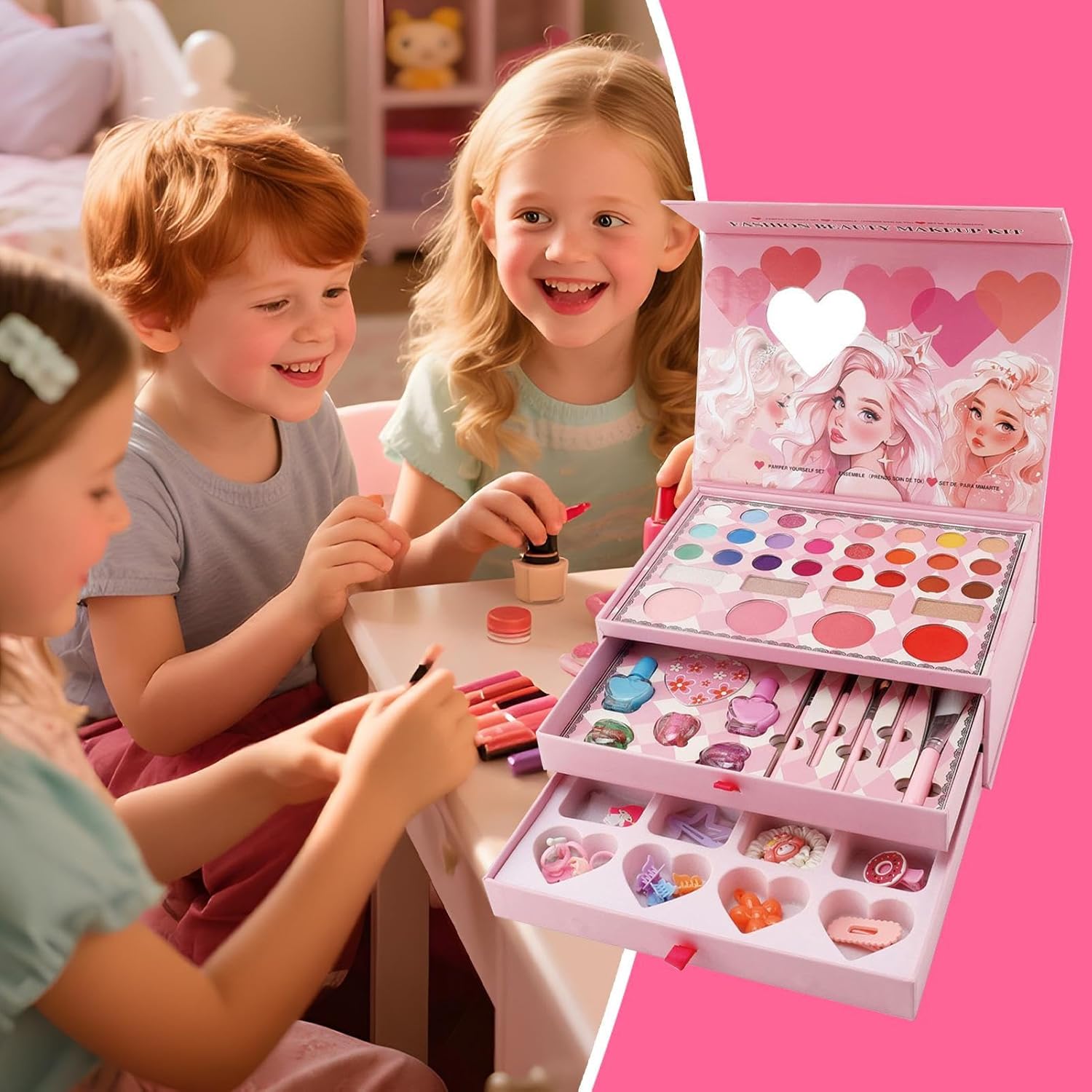 Stile Illustrativo Coinvolgente: Illustrazioni curate in tema principessa stimolano l'interesse dei bambini offrendo un look incantato che aumenta l'attrattiva del set trucco in modo naturale e piacevole Pulizia Rapida: Consistenza setosa si toglie in un attimo, rende la pulizia pratica e minimizza lo sforzo per genitori impegnati Esperienza Educativa: Aumenta destrezza manuale e focalizzazione coltivando immaginazione e inventiva tramite attività di trucco coinvolgenti, ideate per sostenere la crescita evolutiva in modo spontaneo Applicazione Confortevole: Materiali ipoallergenici accuratamente scelti abbinati a formula gentile, garantiscono minore disagio mantenendo una sensazione delicata per trucchi bimbi Giochi di Ruolo Essenziali: Con tanti cosmetici, questo set stimola la creatività infantile permettendo di imitare stili di trucco e soddisfare di interpretare ruoli in modo coinvolgente e divertente