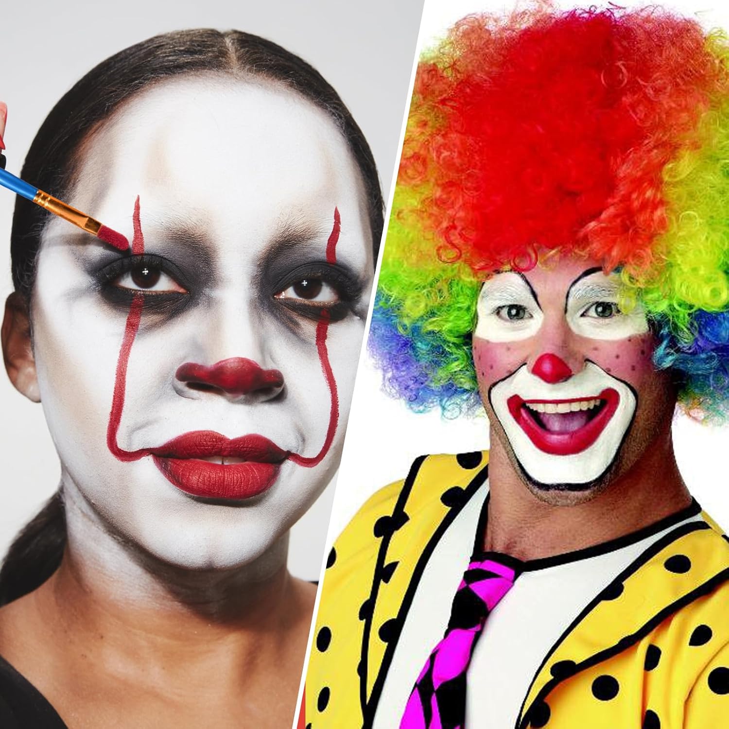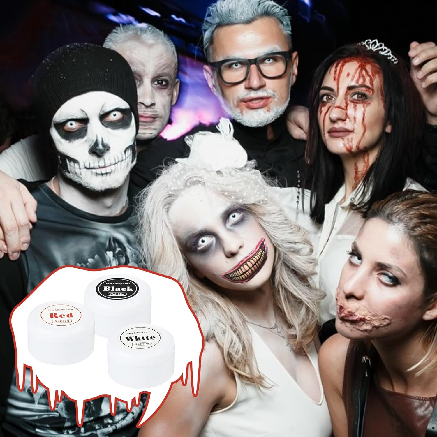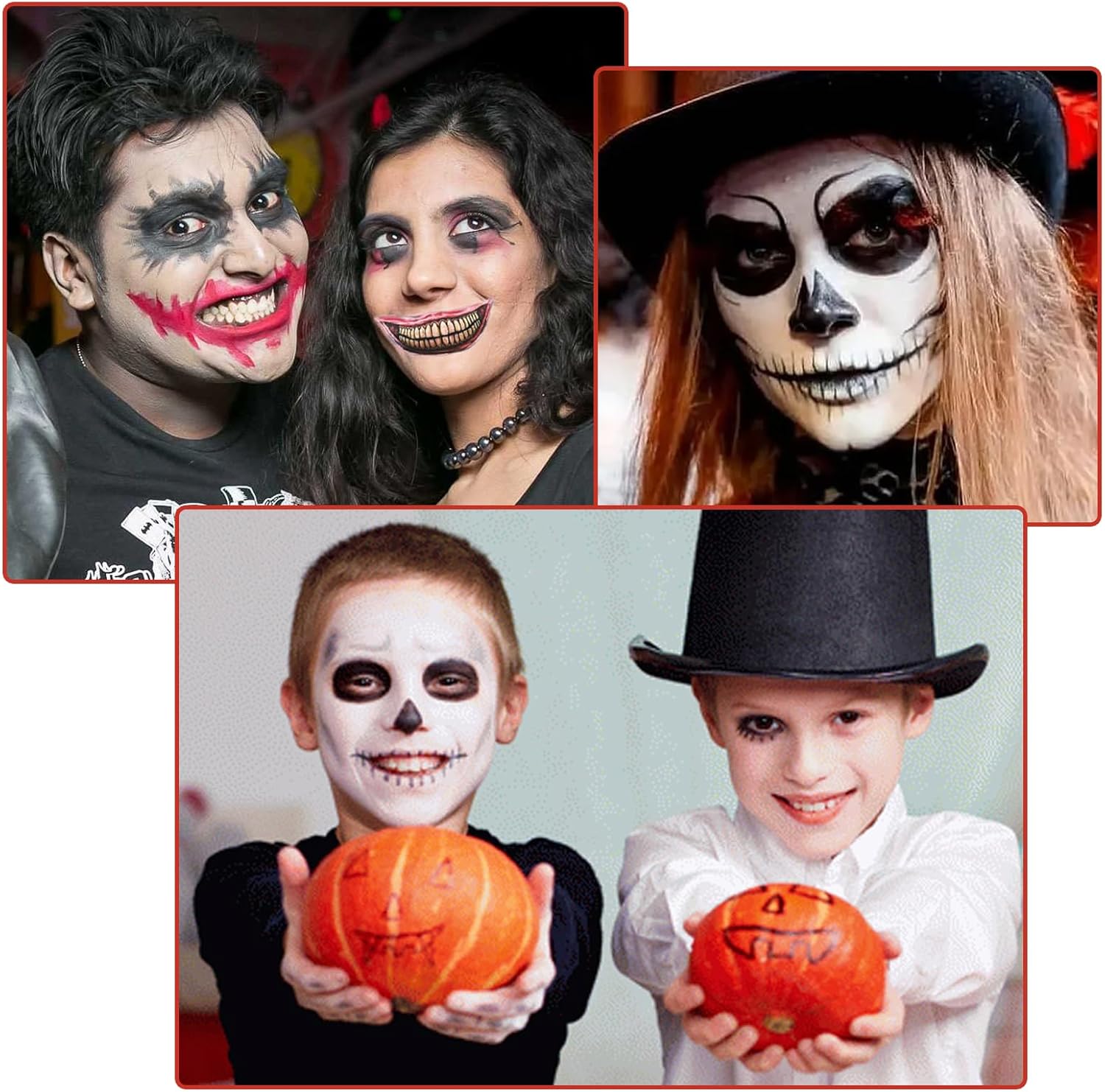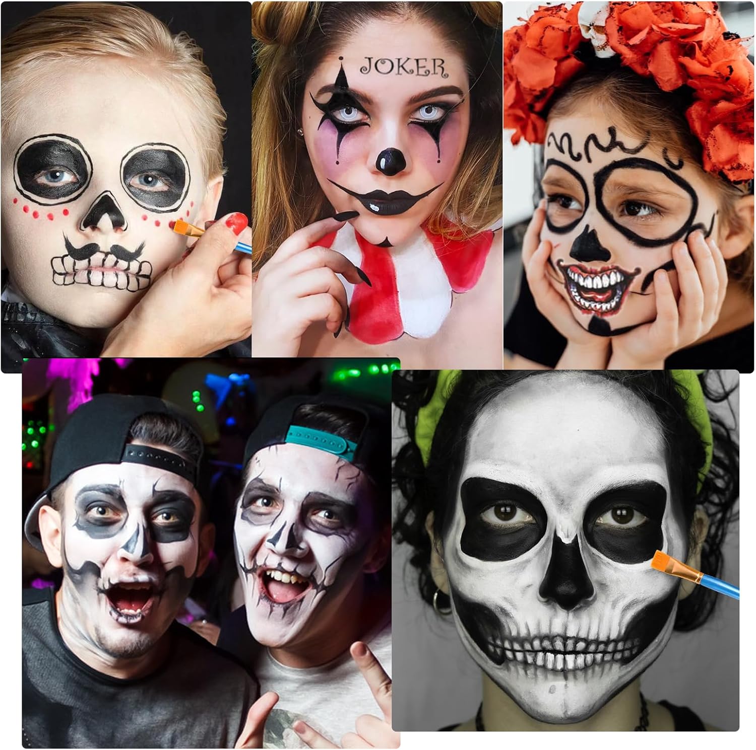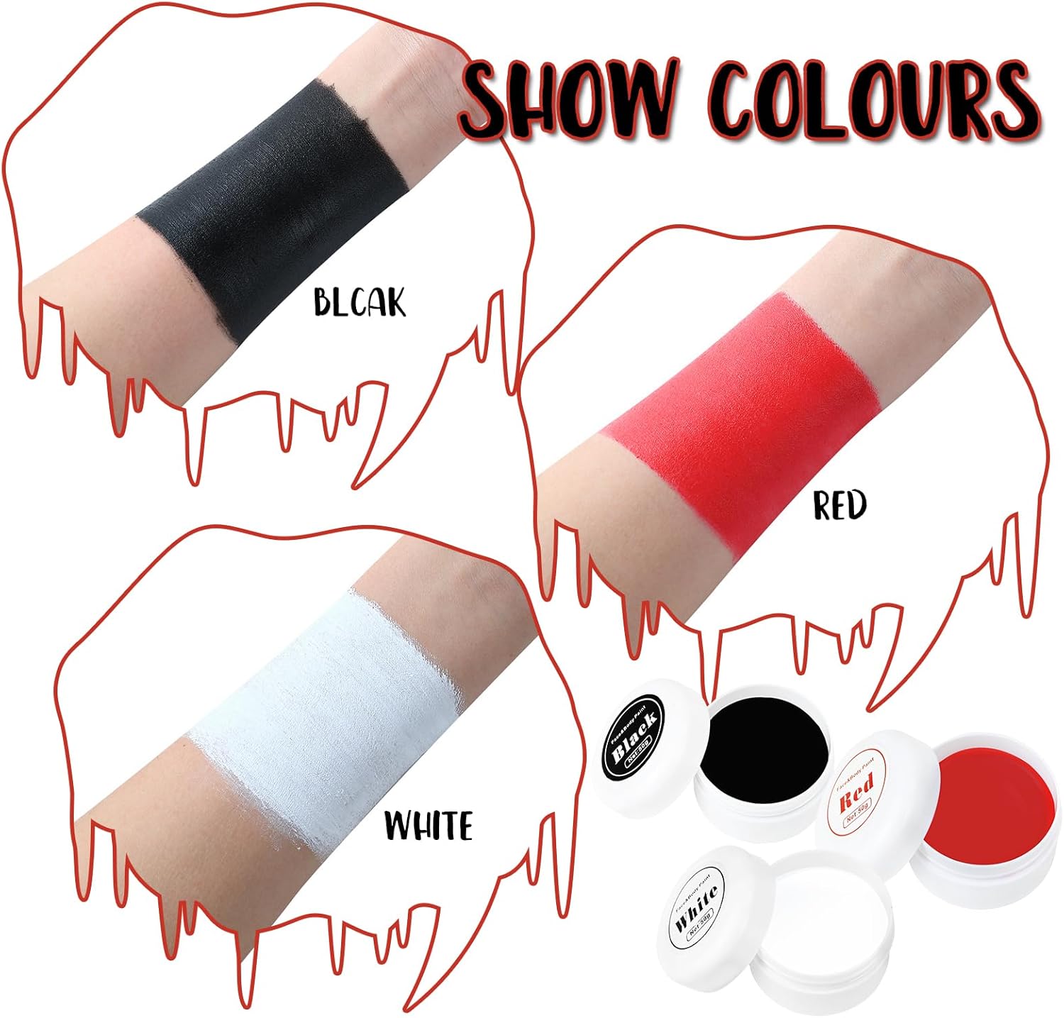 【Set per il trucco di Halloween】 La classica pittura per il corpo rosso nero bianco può essere utilizzata per viso e corpo, 3 pennelli per il trucco, 1 foglio di tatuaggi spaventosi, il set per il trucco di Halloween può essere utilizzato direttamente o mescolato con altri colori. 【Set per il trucco del viso delicato sulla pelle】 Set per il trucco del carnevale di Halloween realizzato con ingredienti di alta qualità con una consistenza morbida e delicata che può facilmente coprire tutto il viso, che è vibrante e di lunga durata e offre una copertura completa e colori vivaci. 【Facile da usare】 Il set per il trucco del teatro di Halloween è facile da usare, si applica sulla pelle con una spugna, un pennello o la punta delle dita, peso netto 50 g/1,76 once Set di pittura per il viso bianco da clown, è così compatto che sta nella borsa per portarlo fuori. 【Trucco da clown spaventoso】 Classico trucco di Halloween nero bianco rosso con tatuaggi da clown per trasformarti in ogni clown spaventoso immaginabile! Molteplici usi: trucco di carnevale per Halloween, Giorno dei Morti, carnevale, costumi, feste cosplay. Facile da creare scheletro, livido, sangue, diavolo, cosplay gotico, vampiro, clown, zombie, decorazione cosplay a tema costume di Halloween, ecc.