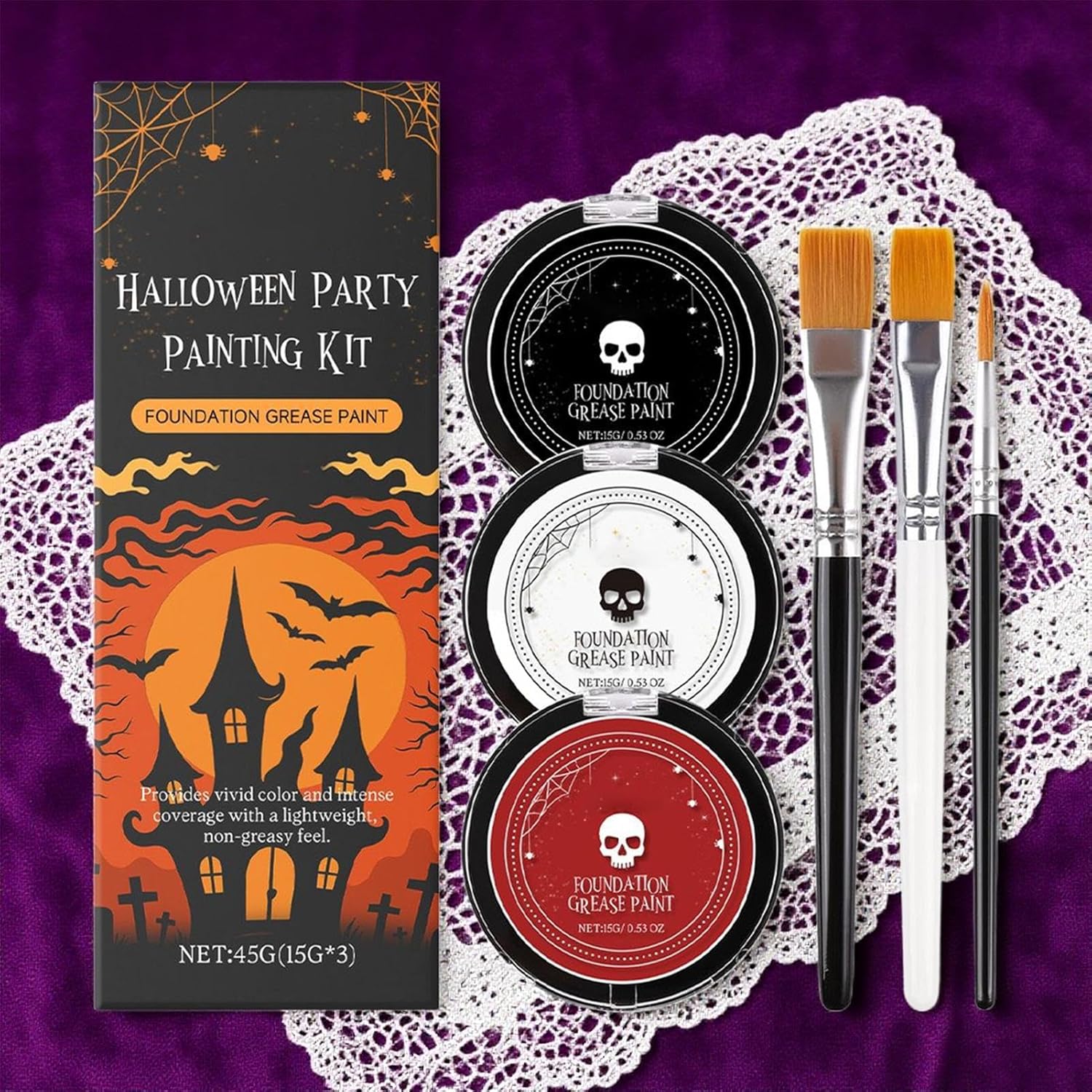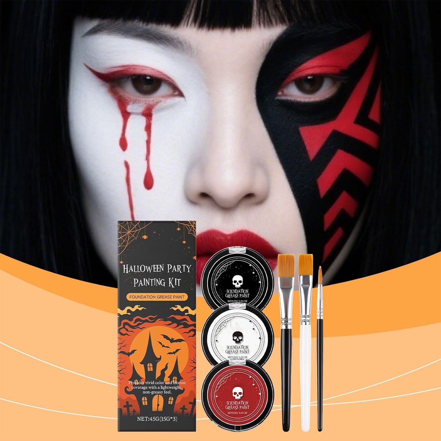 Adatto a tutti: Soluzione creativa per performance teatrali, feste Halloween ed eventi tematici, supporta la fantasia con utilizzi diversificati in occasioni speciali per bambini e adulti, garantendo esperienze coinvolgenti Formula Delicata per Pelli Sensibili: Prodotto con ingredienti cosmetici di qualità, questa pittura viso offre un comfort prolungato durante le festività di Halloween senza rischi di irritazione, ideale per pelli reattive e delicate. Effetto Duraturo: Pigmenti ricchi assicurano risultati vividi con un solo passaggio per disegni gotici e vampiri. Tenuta prolungata senza sbavature o perdita di colore durante feste movimentate. Comodità Assoluta: Il trucco scivola via senza residui con normale detergente dopo l'uso, garantendo praticità di applicazione a pennello, spugna o dita Kit Completo: Formula crema-polvere nel bianco per effetto opaco, texture cremosa a base in nero e rosso, ideale per makeup quotidiano o festivo. Include tre pennelli per applicazione .