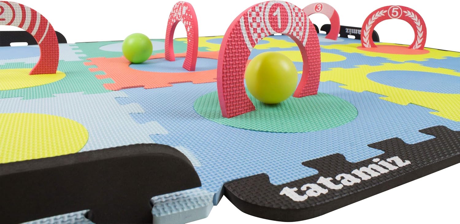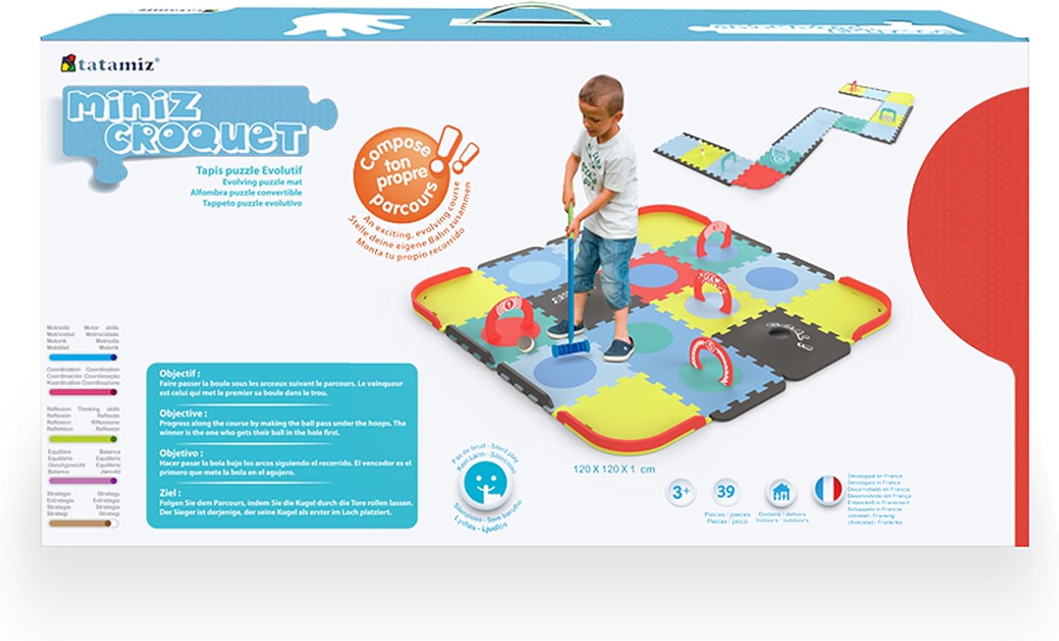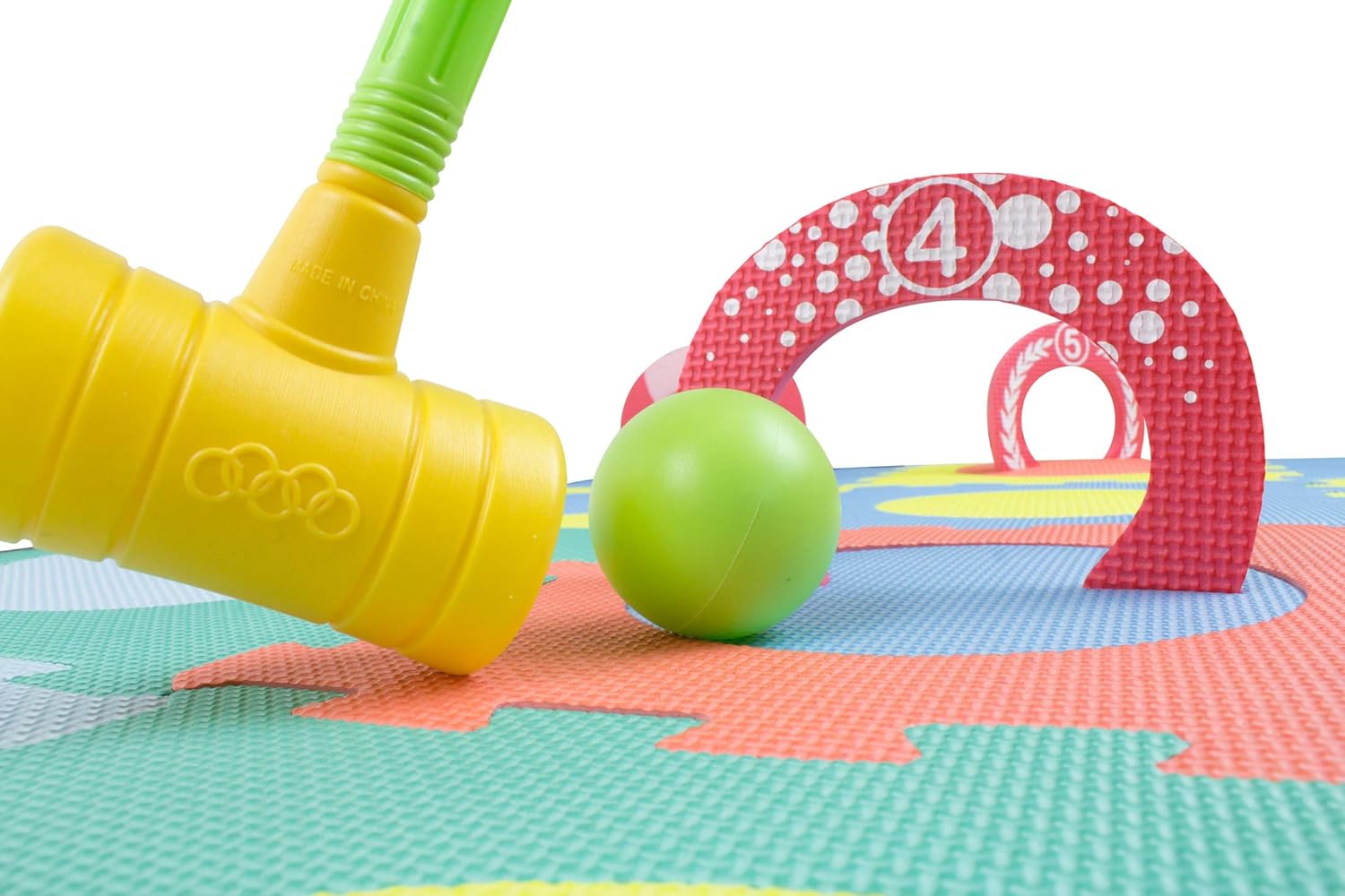 Miniz croquet - tappeto puzzle in schiuma eva Terreno personalizzabile Contenuto: 20 pezzi di puzzle colorate, pretagliate in schiuma EVA, un Club di croquet, palline colorate in schiuma