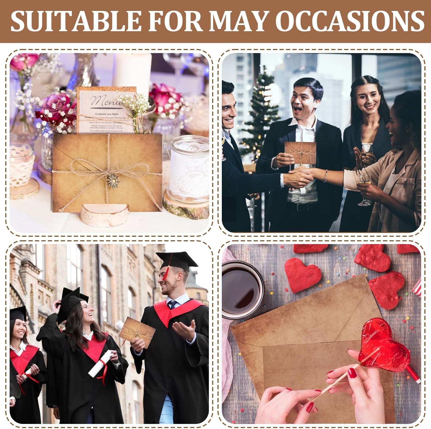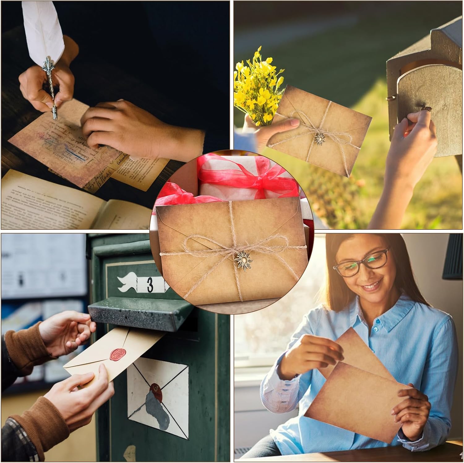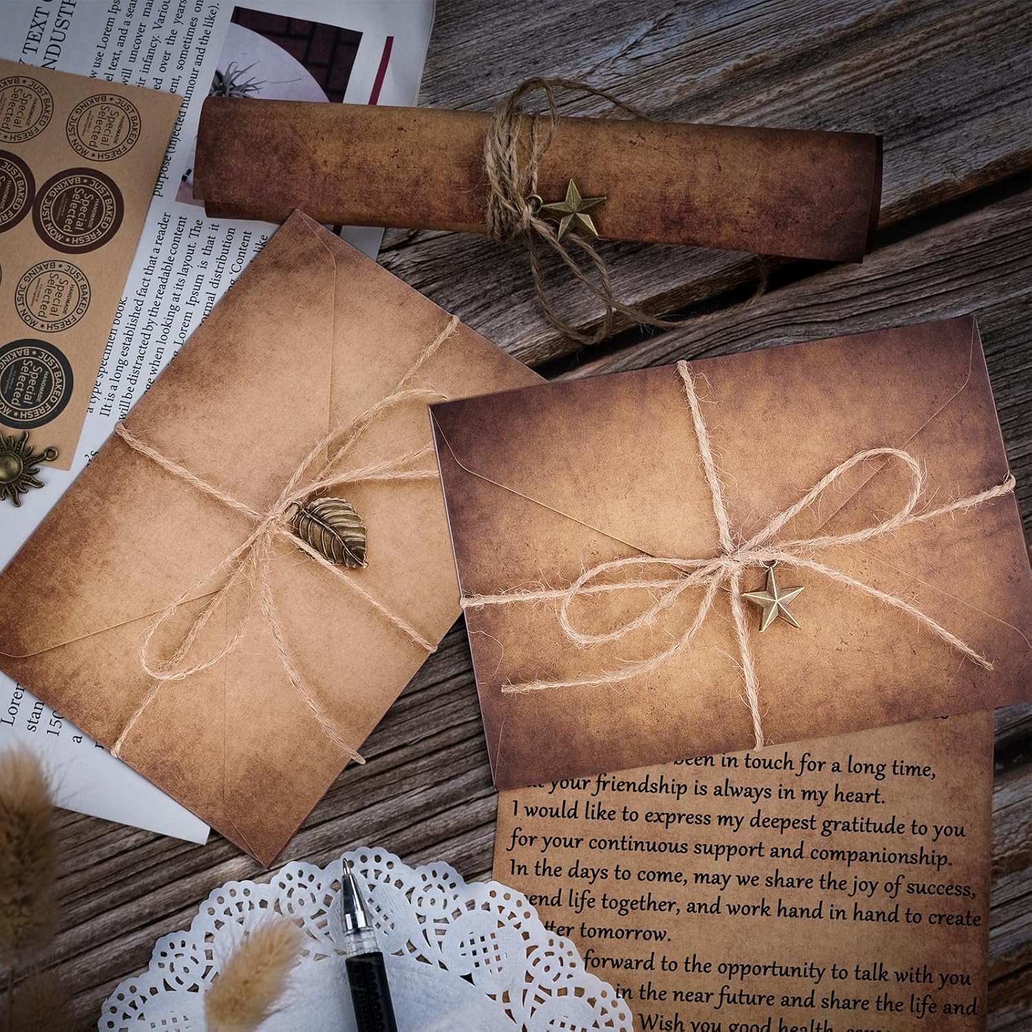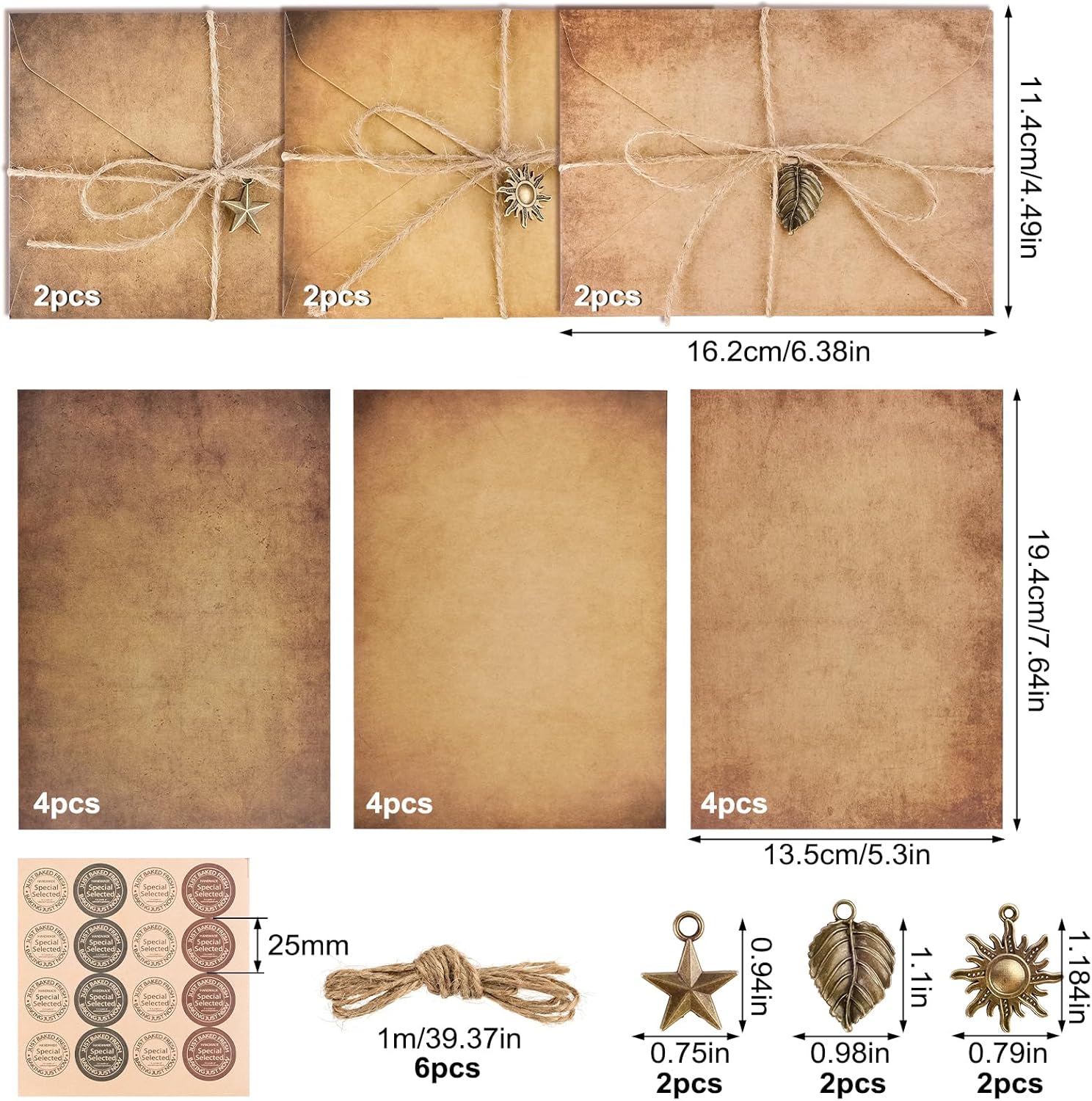 📝✉️【Elenco dei pacchetti】Il nostro set di Carta da Lettere con Buste Vintage comprende 12 pezzi di Carta da Lettere Vintage, 6 buste in carta kraft vintage, 6 accessori in metallo vintage, 6 pezzi di spago, 1 adesivo con sigillo rotondo retrò, la quantità è sufficiente per soddisfare le tue esigenze. 📝✉️【Materiale di alta qualità】 La nostra Carta da Lettere Vintage e Buste per Lettere Vintage sono realizzate in carta kraft di alta qualità, piena di trama vintage, superficie piatta e liscia, scrittura liscia, non facile da sbiadire, spessa e robusta, non facile da strappare. Gli accessori retrò sono realizzati in metallo di alta qualità, durevole e non arrugginisce facilmente, sono squisiti e compatti nell'aspetto, belli e pratici. 📝✉️【Stile Vintage】 I modelli classici retrò e i disegni a colori fanno sì che ogni busta e cancelleria trasmettano moda ed eleganza. La Carta da Lettere Vintage con Buste è progettata con 3 diverse decorazioni in stile retrò come foglie, sole e stelle, che possono decorare meglio la busta e rendere la tua lettera più attraente, bella e significativa. 📝✉️【Multiuso】Il Kit per Scrivere Lettere Antiche è perfetto per scrivere lettere alla tua famiglia o ai tuoi amici per esprimere i tuoi pensieri. Possono essere utilizzati anche come inviti a feste, decorazioni vintage, lettere antiche simulate, lettere d'amore vintage, dipinti classici, lettere di anniversario o di laurea e altro ancora. 📝💌【Regalo pieno d'amore】 Il Kit per Scrivere Lettere Vintage ha un significato straordinario e può essere utilizzato per la festa della mamma, San Valentino, Natale, Ringraziamento, compleanni, anniversari o altri giorni importanti, un regalo speciale per genitori, famiglia, amici, sarebbero molto felici per ricevere la tua lettera scritta a mano.