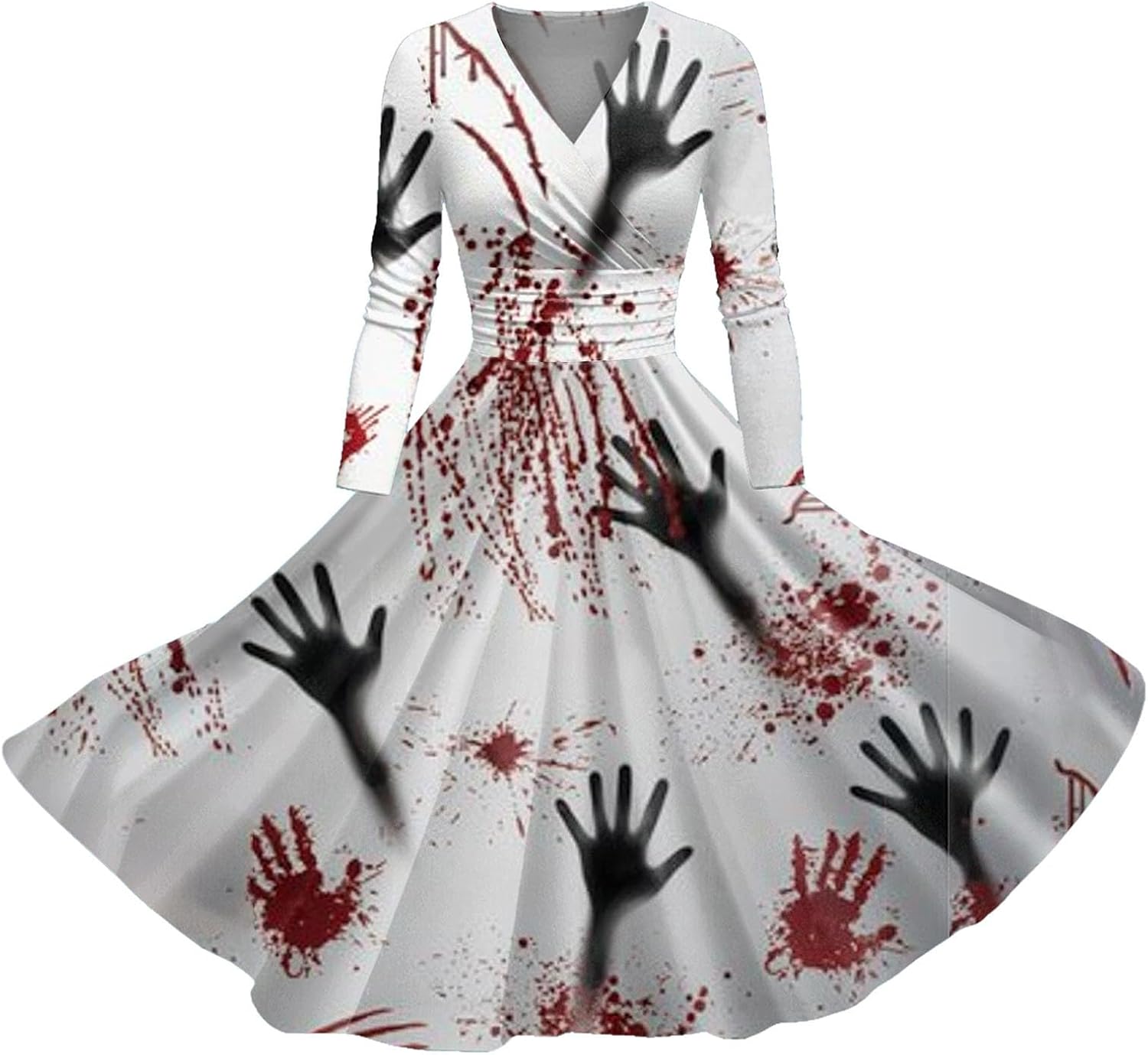 TUQIDEWU Abito da donna per Halloween, sexy, spaventoso, lungo, con scollo a V, per Halloween, carnevale, Halloween, costume sexy di Halloween, con stampa sanguinosa