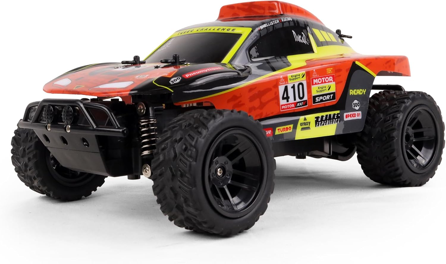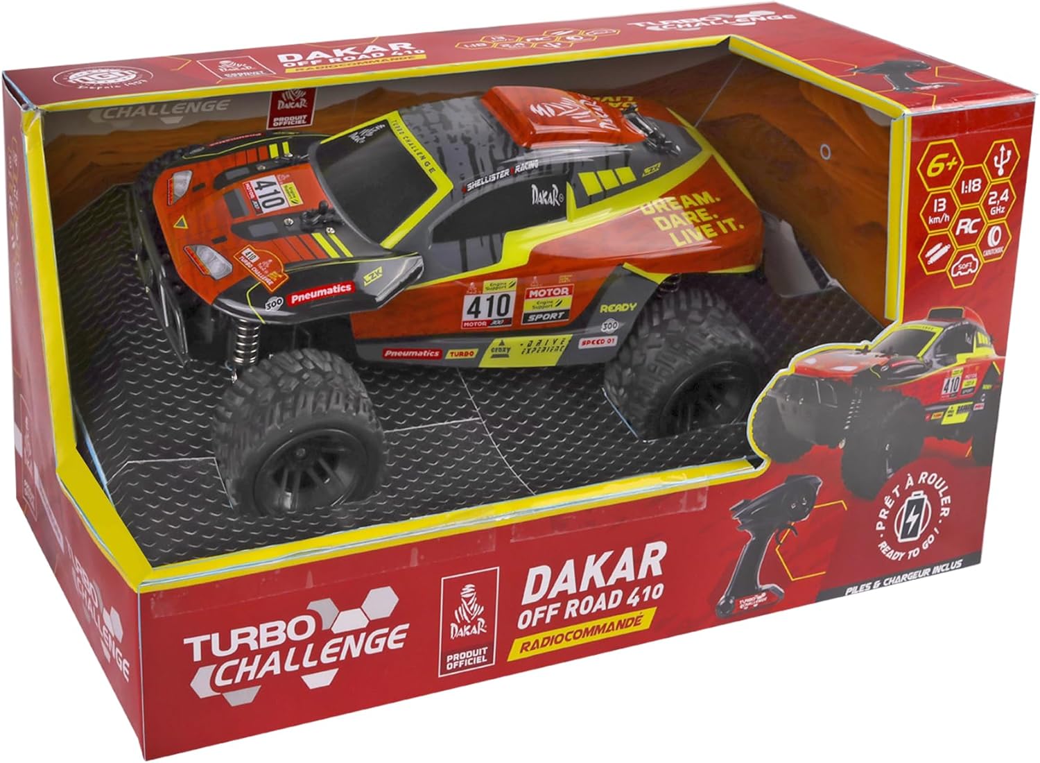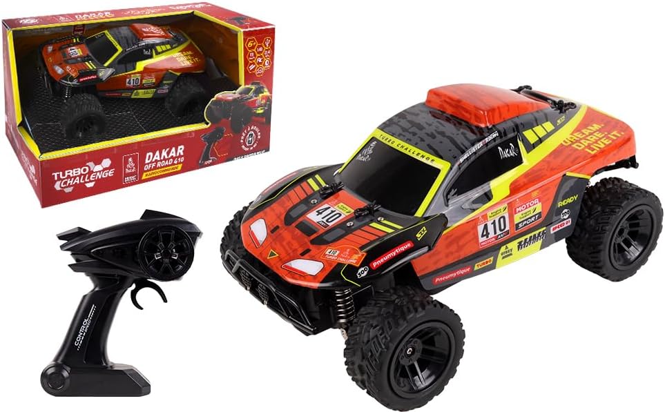 A TODO GAS: Questo giocattolo ideale offrirà ore di divertimento a tutti i piloti in erba. Grazie al telecomando potrai guidare la tua auto tra gli ostacoli per 25 minuti a tutta velocità. Il +: Dakar è una licenza ufficiale. CONTENIDO: 1 Off Road 410 Dakar in scala 1/18 2,4 GHz con radiocomando portata 20 m. Velocità 8 km/h, stabile e controllabile. Include batteria 7,4 V + caricabatterie USB + 2 pile AA per il radiocomando. DENTRO COME FUORI: Realizzata in plastica per garantire massima durata, resiste a urti e graffi; utilizzabile da solo o in compagnia, in interni o esterni per prestazioni ottimali su ogni superficie. UN REGALO MAGNIFICO: Questo giocattolo divertente è ideale per i giovani appassionati di guida; è anche uno strumento di apprendimento per sviluppare destrezza e coordinazione senza schermo. TURBO CHALLENGE, un marchio che fa vibrare i giovani piloti con veicoli radiocomandati che combinano prestazioni e controllo. Progettati per l’azione, offrono velocità, precisione ed emozioni forti su ogni terreno.