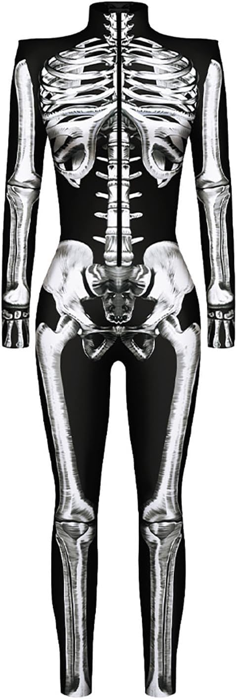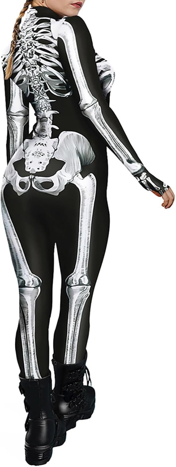 Costume stampato in 3D per donna Ognissanti Cosplay Party Body Pagliaccetti Tuta Scheletri spaventosi Stampato in un unico pezzo aderente, vestibilità slim, elastico. Il design innovativo e creativo ti regalerà un'esperienza meravigliosa e interessante Costume per Halloween, attività a tema, cosplay, crociera o altre occasioni speciali Realizzato in poliestere e spandex. Tessuto leggero con grande elasticità per un maggiore comfort. Scheletro stampato davanti e dietro; mostra la curva del tuo corpo sexy. Collo alto. Cerniera sul retro, facile da indossare e da togliere. Scheletro rosa, scheletro dorato, scheletro colorato stampato in digitale. Cerniera nella parte posteriore. Girocollo, collo in piedi per nascondere il collo. Tessuto delicato sulla pelle, tuta intera comoda da indossare, costumi facili per Halloween e Natale per adulti