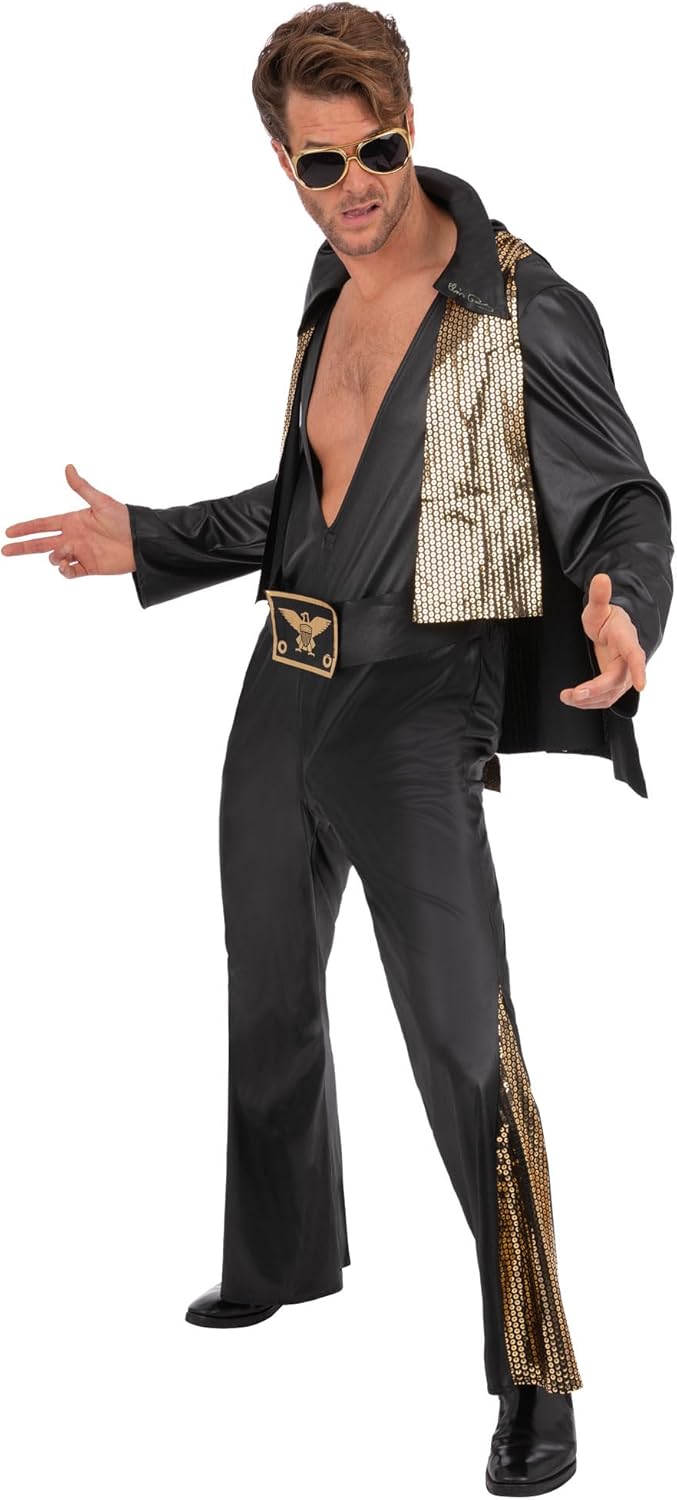 Descrizione prodotto Tuta nera di Elvis All In One con mantello. Tieni presente che tutti i nostri prodotti Smiffys verranno sempre forniti con la confezione completa del marchio Smiffys. Avviso di sicurezza Costumi in maschera per adulti Il contenuto della confezione include la tuta nera di Elvis tutto in uno con mantello Scopri di più