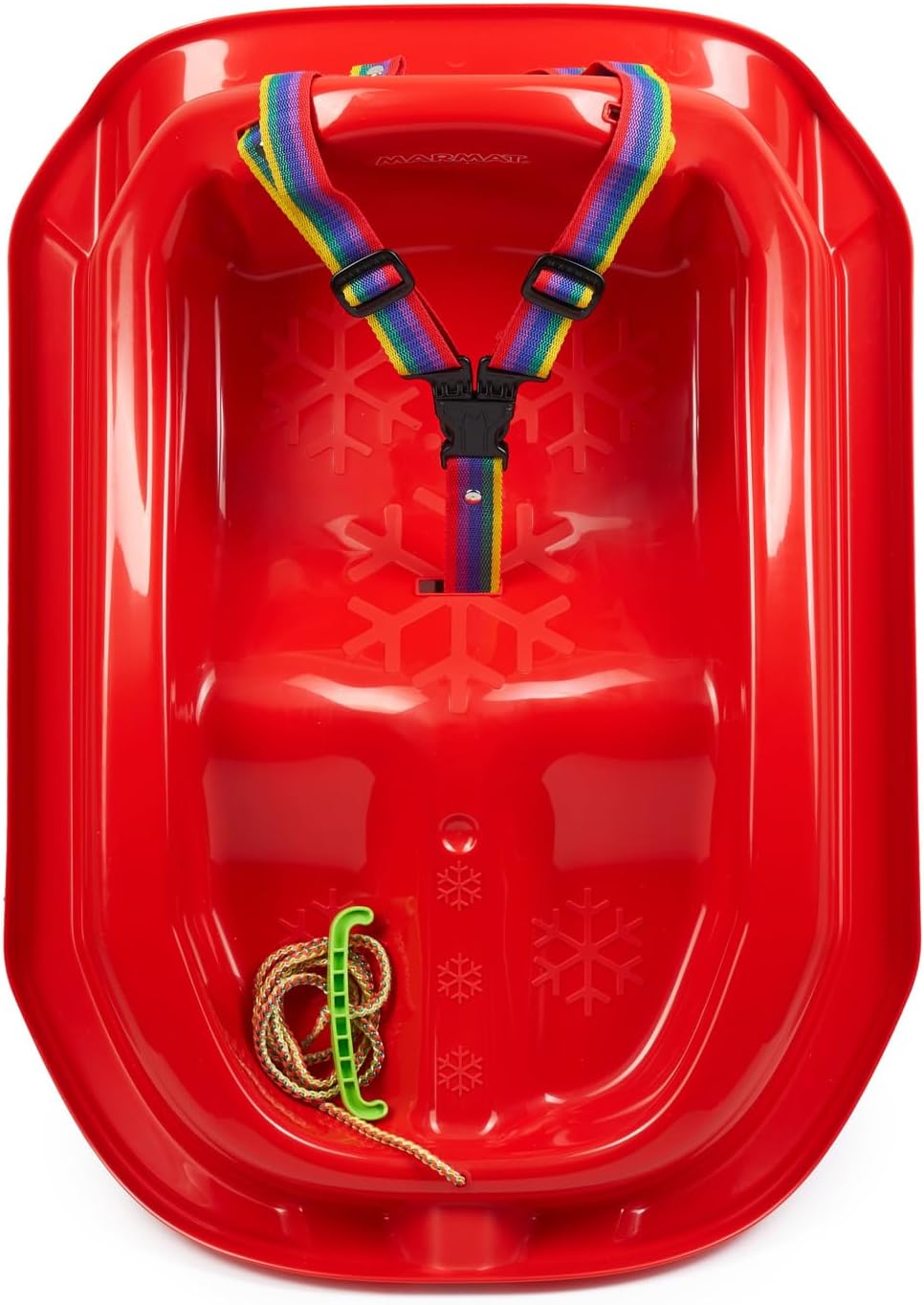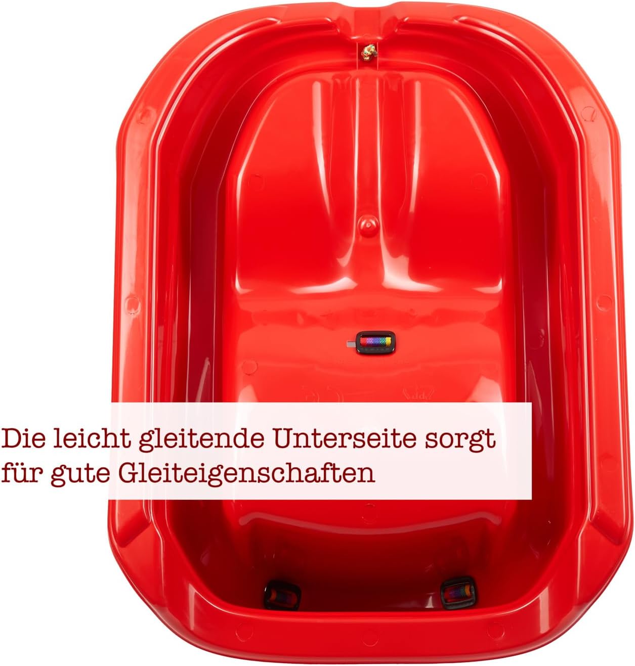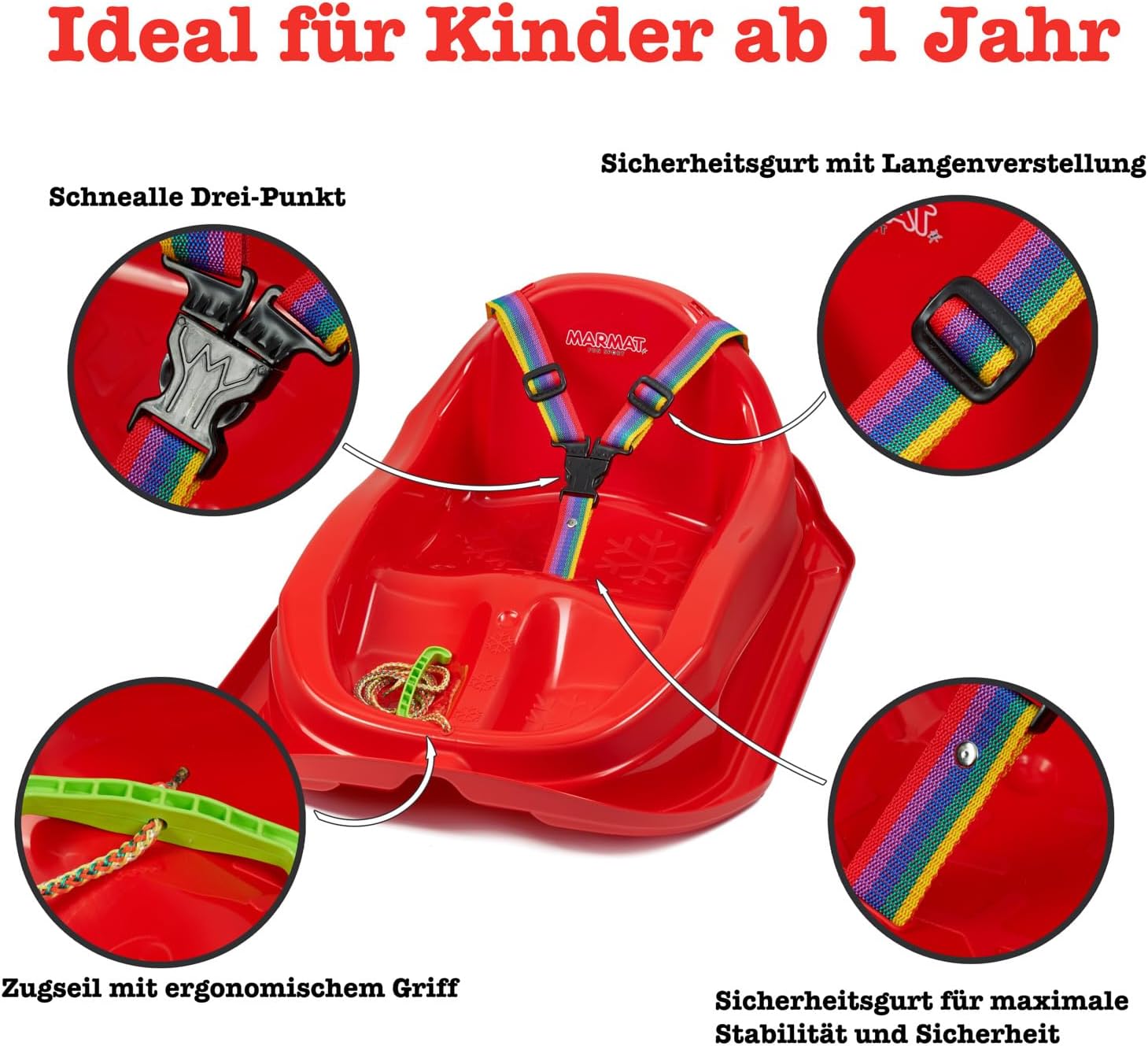 Slitta bambino da 1 anno. Sedile ergonomico con cintura di sicurezza per il massimo comfort e stabilità Dimensioni: lunghezza: 71 cm, larghezza: 52 cm, altezza: 29 cm, peso: circa 1,2 kg Lunghezza della corda con manico: circa 120 cm. Massima Portata: 20 kg Materiale: plastica polipropilene. Materiale robusto e resistente al freddo per una lunga durata Il modello possiede un certificato CE. Prodotto nell'Unione Europea.