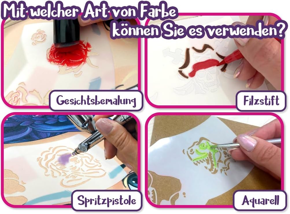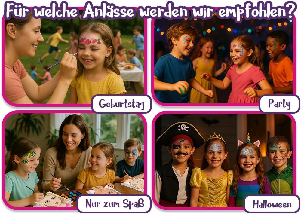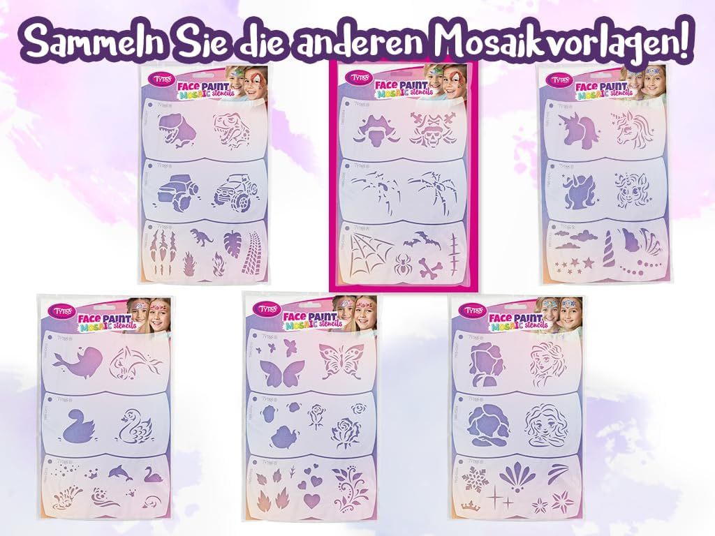 ✅ Trucco perfetto per bambini facile! Con gli stencil a mosaico potrete creare in un batter d'occhio splendidi motivi. Nessun talento artistico richiesto: basta posizionarla, colorare e godere del grande risultato! Numerosi motivi creativi per un divertimento senza limiti. Dagli unicorni alle stelle: questo set offre un design emozionante per ogni bambino. Perfetto per feste di compleanno, carnevale o un pomeriggio creativo a casa Facile e veloce da pulire: grazie alla tecnica di stencil ben studiata, anche i motivi complessi sono facili da realizzare. I bambini saranno entusiasti di quanto sia professionale la loro pittura facciale! Ideale da abbinare con set di trucco, adatto per bambini dai 3 anni in su. Riutilizzabile e delicato sulla pelle. Stencil per il trucco di alta qualità, flessibili, resistenti e piacevoli sulla pelle. Facile da pulire e riutilizzare Con istruzioni video per risultati perfetti! – Oltre a istruzioni dettagliate (lingua italiana non garantita), hai accesso a un'esclusiva guida video (tramite codice QR), che spiega l'applicazione passo per passo. Facilissimo da usare, perfetto per i genitori. I nostri stencil per il trucco per bambini sono così facili da usare che anche le mani inesperte possono ottenere risultati professionali. Basta applicarlo, compilare con il trucco e in pochi secondi l'opera d'arte è pronta! Delicato sulla pelle e sicuro per i bambini. Il materiale morbido e flessibile è delicato sulla pelle sensibile dei bambini e non lascia graffi o irritazioni. Così i più piccoli potranno godersi la pittura del viso spensierata!