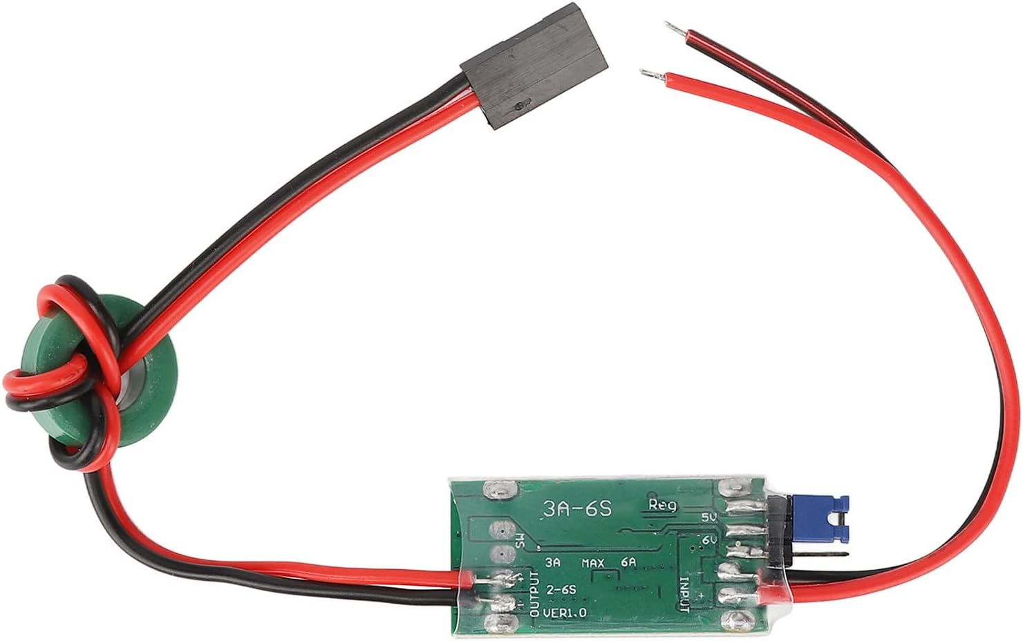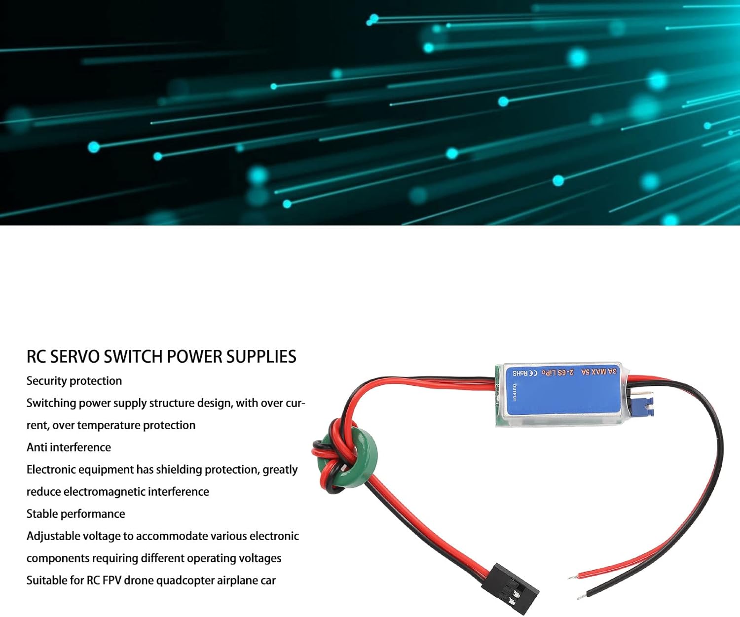 Protezione di sicurezza: il modulo adotta il design della struttura dell'alimentatore switching (frequenza: 300 KHz), con protezione da sovracorrente e sovratemperatura, elevata efficienza del chip. Applicazione: adatto per auto d'aereo quadricottero drone RC FPV e tensione affidabile per ospitare vari componenti elettronici che richiedono tensioni operative diverse. Parametro: tensione di uscita di 5 V/3 A e 6 V/3 A (commutabile), ingresso di 5,5 V-26 V, prestazioni stabili e design professionale per risultati pratici. Anti interferenza: il dispositivo elettronico è schermato e protetto, riducendo notevolmente le interferenze elettromagnetiche e garantendo il normale funzionamento del ricevitore. Prestazioni: il modulo è protetto contro la polarità dell'alimentazione e non danneggerà l'UBEC se l'alimentazione viene collegata accidentalmente.