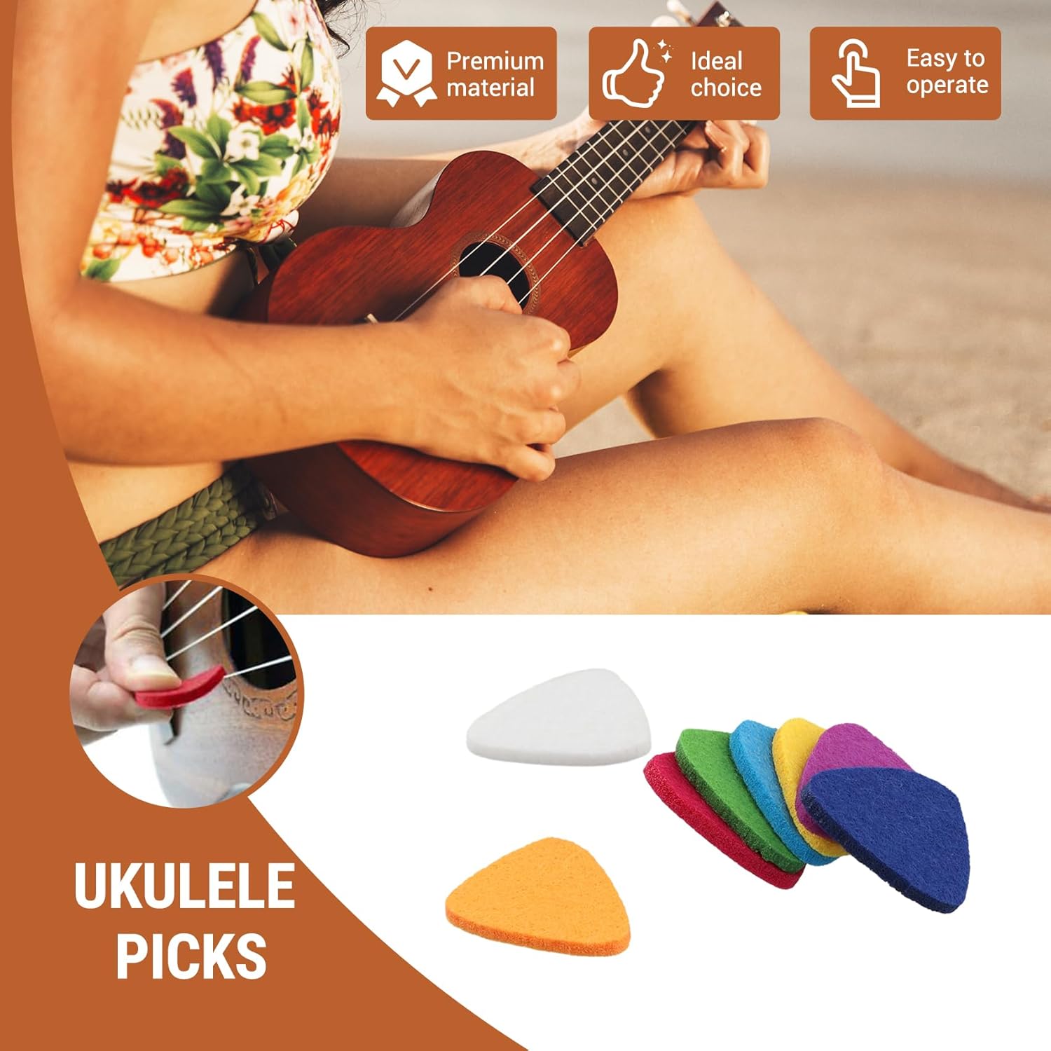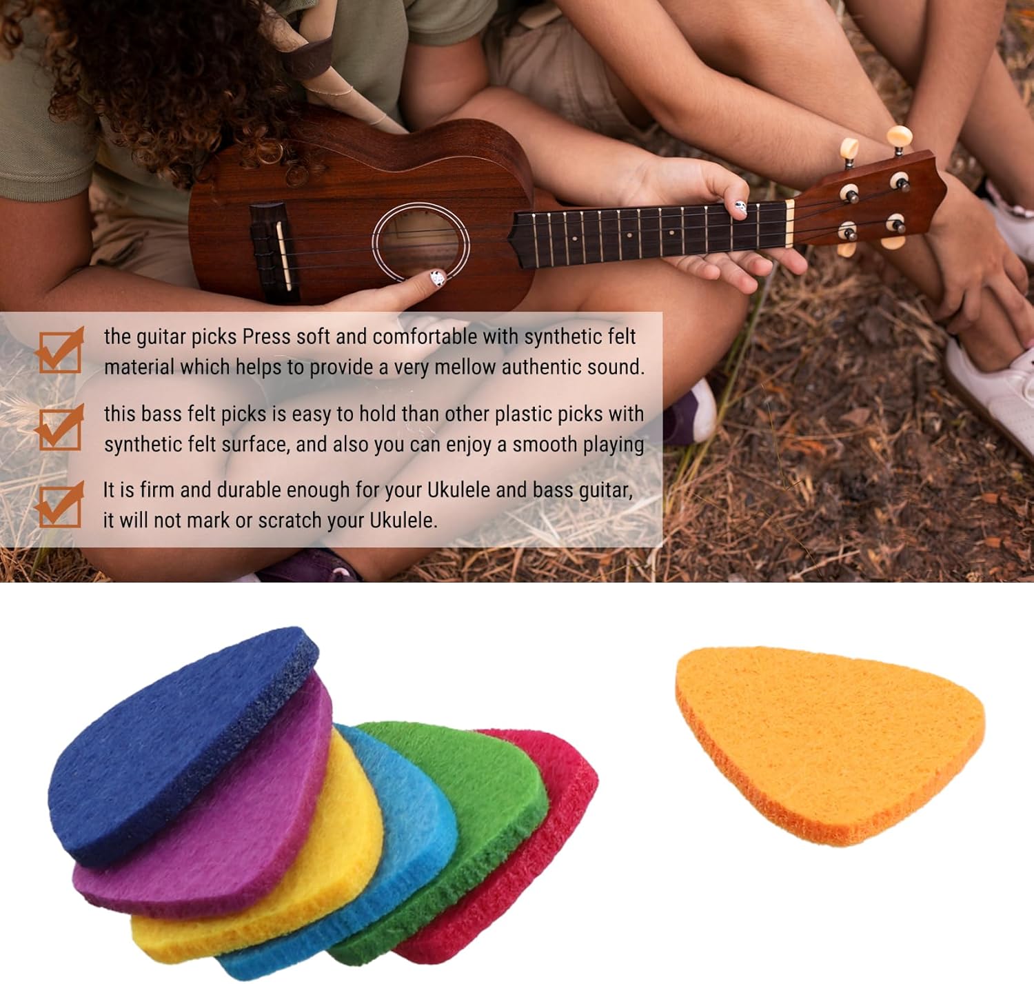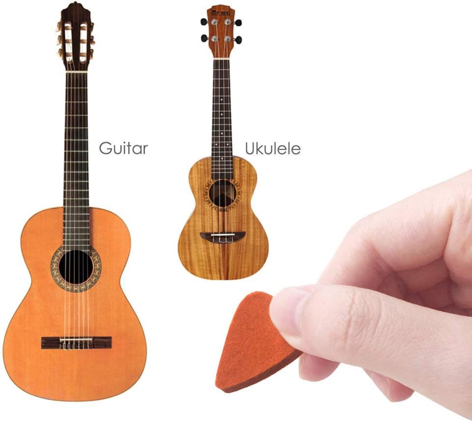 Morbido e non scivoloso: questo plettro in feltro e' facile da impugnare rispetto ad altri plettri in plastica con superficie in feltro sintetico, e puoi anche goderti un gioco fluido. Plettri per chitarra: questi pennarelli sono fatti di feltro di lana. Non suonare un suono percussivo come i plettri in plastica e metallo colpisci le corde. e' adatto per ukulele e corde per chitarra. Morbido e confortevole: le plettri per chitarra Stampa morbida e confortevole con materiale in feltro sintetico che contribuisce a fornire un suono molto e . e duraturo: le plettri per chitarra sono realizzate in feltro ad alta densita', e' e abbastanza resistente per il tuo Ukulele e il tuo basso, non segna o graffia il tuo Ukulele.
