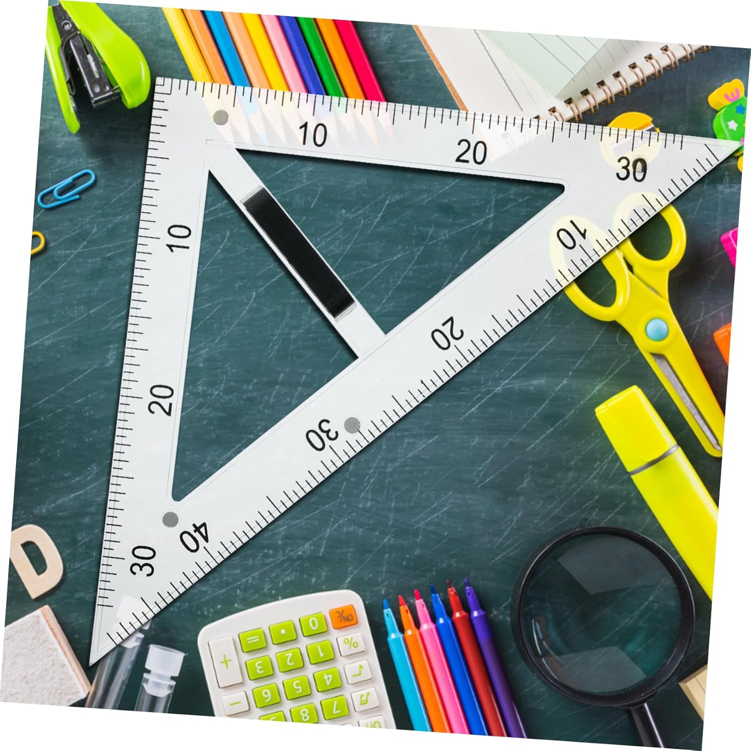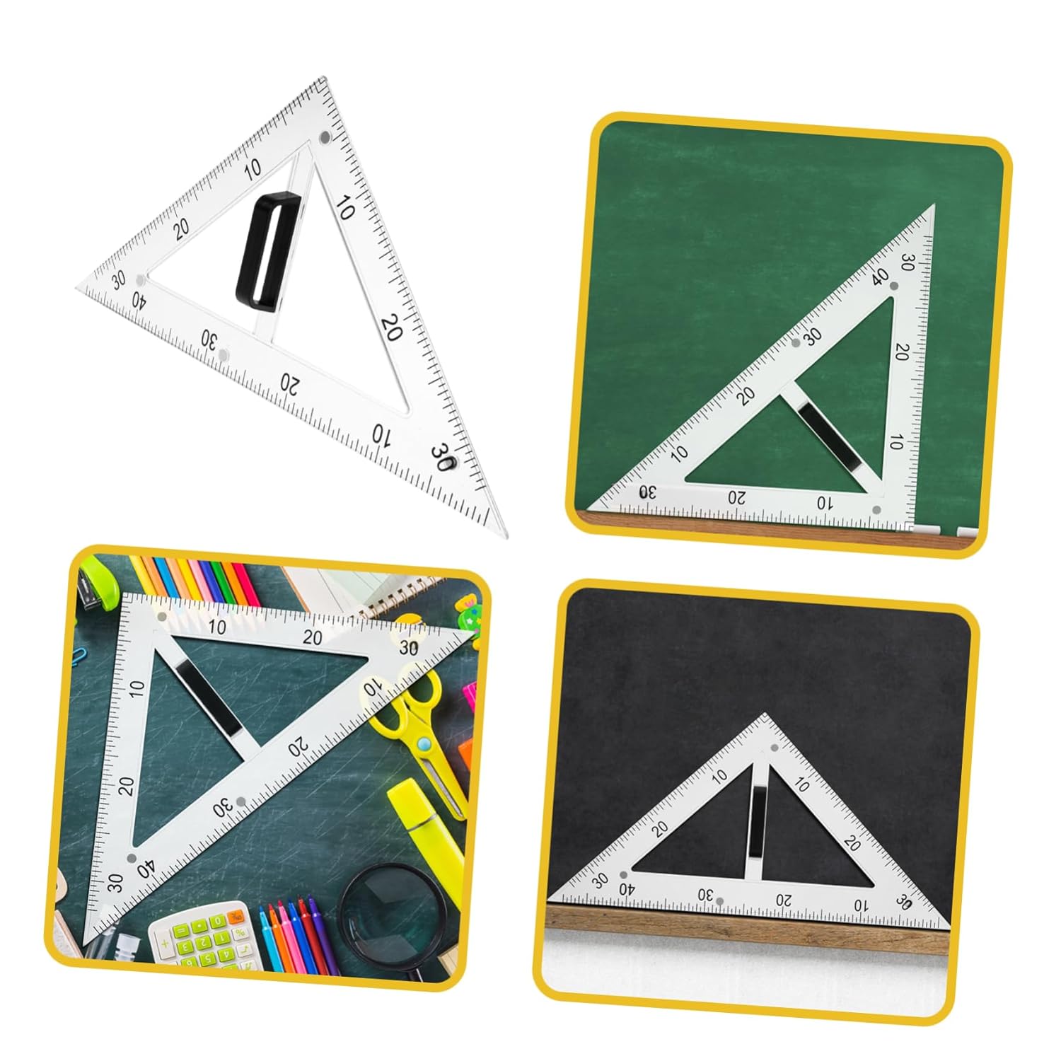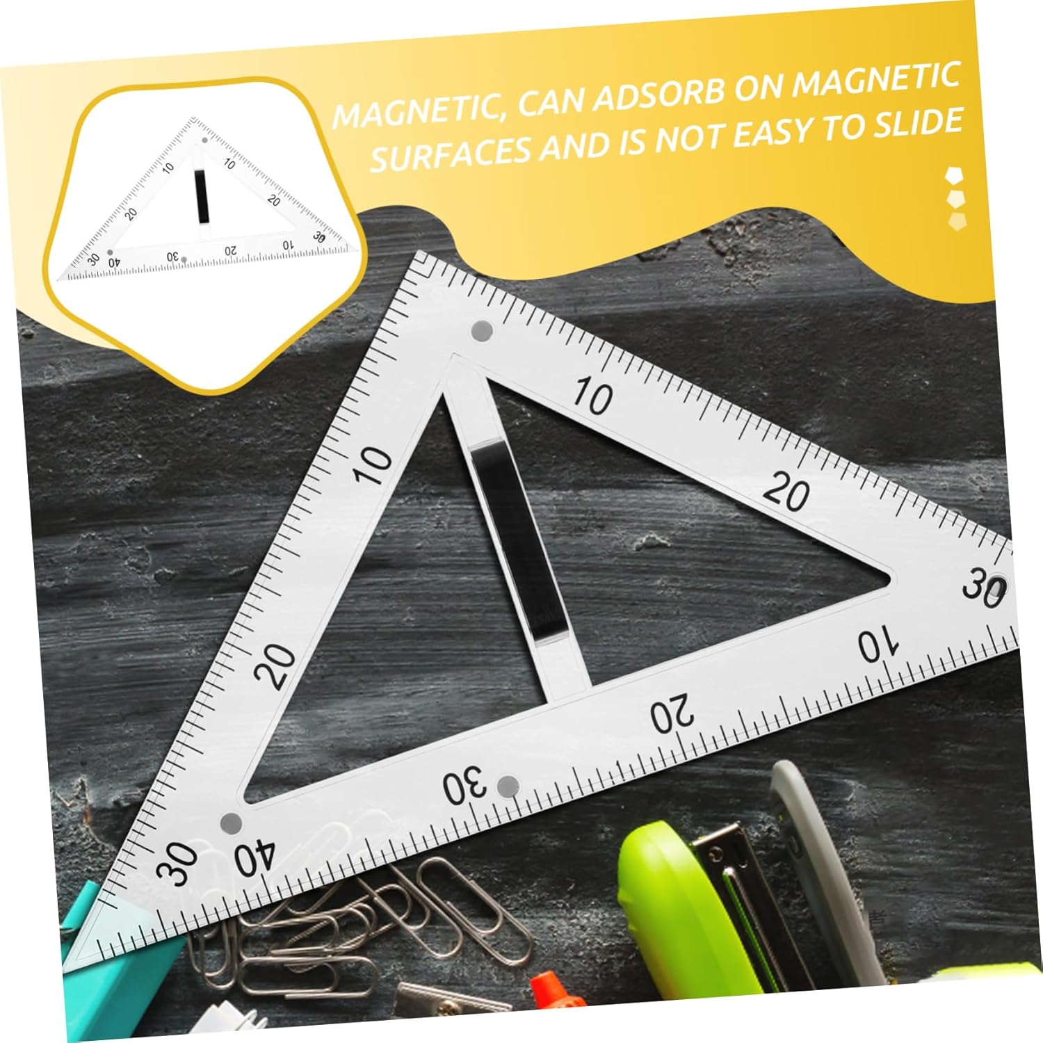 Righello didattico: presenta un design conveniente con una struttura triangolare a 45 gradi per creare angoli retti e triangoli equilateri precisi, righello triangolare didattico. Piastra triangolare didattica: il righello triangolare da disegno è adatto sia agli studenti che agli insegnanti durante le lezioni di disegno, il righello didattico della geometria. Materiali didattici: l'uso di materiali abs e magnetici garantisce la durata dello strumento di disegno e una facile pulizia, righelli triangolari in plastica. Righello triangolare da disegno: realizzato in abs e materiali magnetici, garantisce durata e facile pulizia, insegnando il righello triangolare da disegno. Goniometro didattico: il righello triangolare da disegno didattico presenta un design a triangolo di 45 gradi, utile per disegnare angoli retti e triangoli equilateri, righelli geometrici multifunzionali.