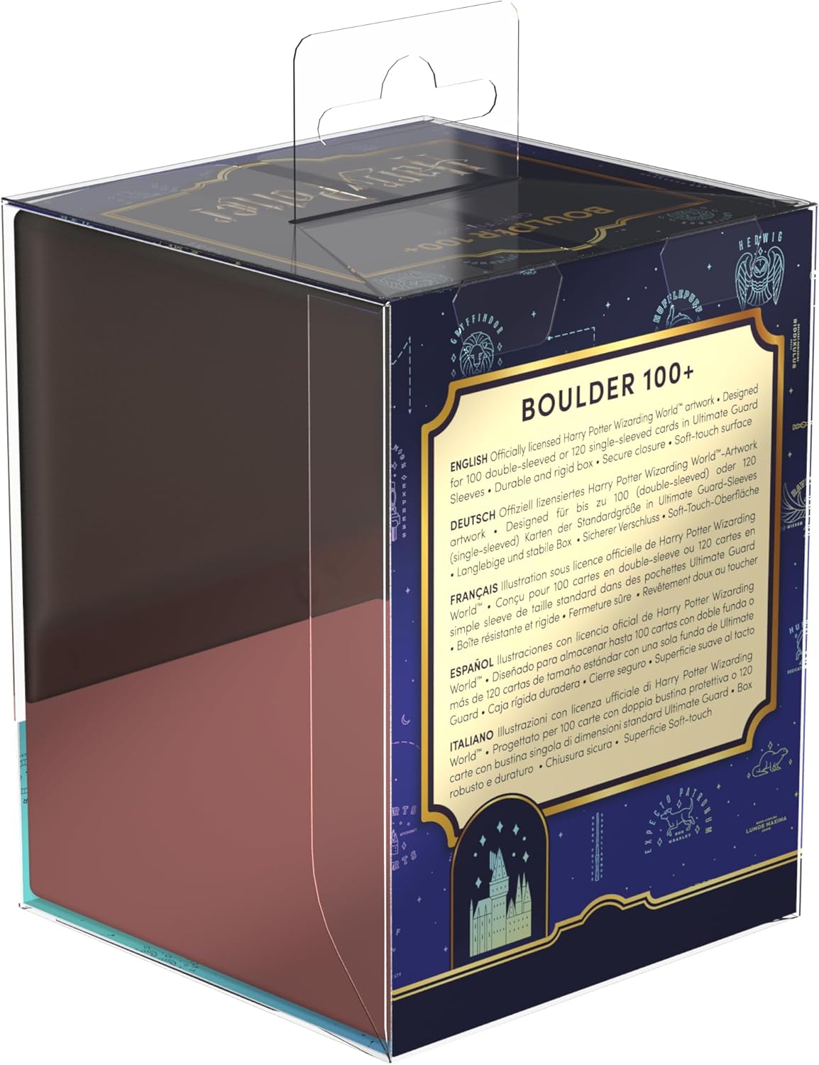 Mostra la tua appartenenza a Grifondoro, Serpeverde, Tassorosso o Corvonero con il mazzo Harry Potter Boulder 100+ di Ultimate Guard. La robusta scatola per carte di credito si apre comodamente nonostante la chiusura sicura, ha una piacevole superficie morbida al tatto e offre spazio per 100 (in doppia custodia) o 120 (in una semplice custodia) carte di dimensioni standard o più piccole, ad esempio Magic: The Gathering, Lorcana, Pokémon o Yu-Gi-Oh!