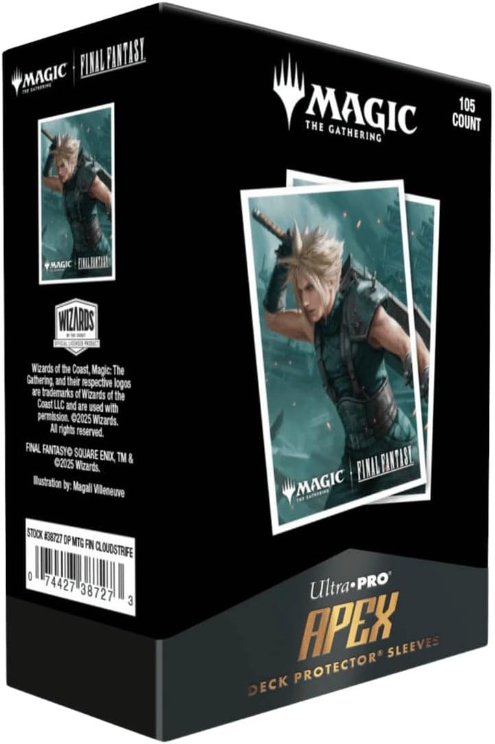 Maniche protettive con licenza ufficiale APEX per Magic: The Gathering Final Fantasy x Universes Beyond – Progettate per collezionisti e fan, queste custodie riuniscono elementi iconici di due franchise leggendari per un oggetto da collezione unico nel suo genere. Vivace stampa testurizzata con illustrazione esclusiva di Cloud, ex soldato di Wangjie Li - Caratterizzate da grafica premium su una finitura opaca testurizzata, queste maniche mostrano la potente presenza di Cloud con dettagli e profondità sorprendenti. La nuova formulazione della custodia offre un'esperienza di gioco shuffle premium costruita per funzionare e durare - Progettata per durare e giocare fluidamente, questa formula avanzata migliora la maneggevolezza pur essendo resistente al gioco frequente. 105 custodie protettive per patio di dimensioni standard in ogni confezione - Perfette per i mazzi Commander completi di extra, la confezione ti assicura di avere abbastanza maniche per proteggere l'intero patio e il buffet. La parte anteriore trasparente lucida fa brillare le tue carte foil. - Progettata per mostrare le carte foil, la parte anteriore trasparente aggiunge brillantezza mantenendo piena visibilità e chiarezza.