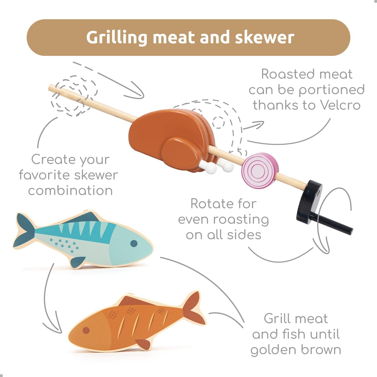 Giocattolo realistico per barbecue: la superficie di gioco ricca di dettagli con rotella, spiedo e accessori porta un vero divertimento alla cameretta dei bambini. I bambini imparano a infilzare, girare e servire carne e verdure, proprio come i grandi! Imparare giocando: durante il "grigliare" e servire, i bambini allenano la coordinazione occhio-mano, le abilità motorie e la capacità di squadra. Allo stesso tempo, sviluppano la prima conoscenza del calore, del fuoco e della cottura del cibo. Diversi ingredienti per grigliare: che si tratti di bistecca con effetto medio, insalata croccante, salsicce, pollo, pesce o marshmallow: con 45 pezzi, i bambini possono liberare la loro immaginazione e creare piatti creativi alla griglia. Regalo ideale per piccoli maestri del barbecue: perfetto per compleanni, Natale o come pensierino. Promuove le abilità sociali quando si gioca insieme a fratelli, genitori o amici. Sicuro e sostenibile: realizzato in legno di alta qualità, verniciato con colori atossici e bordi arrotondati. Il set è robusto, durevole e adatto ai bambini, ideale per interni ed esterni.