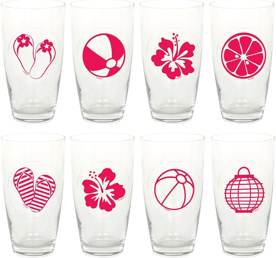 Ogni confezione include un assortimento di 8 disegni tra cui fiori, flip flops, frutta, lanterne e palloni da spiaggia.