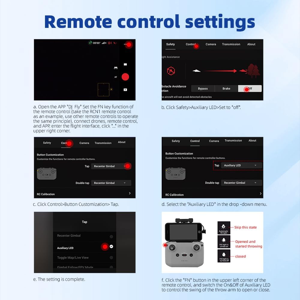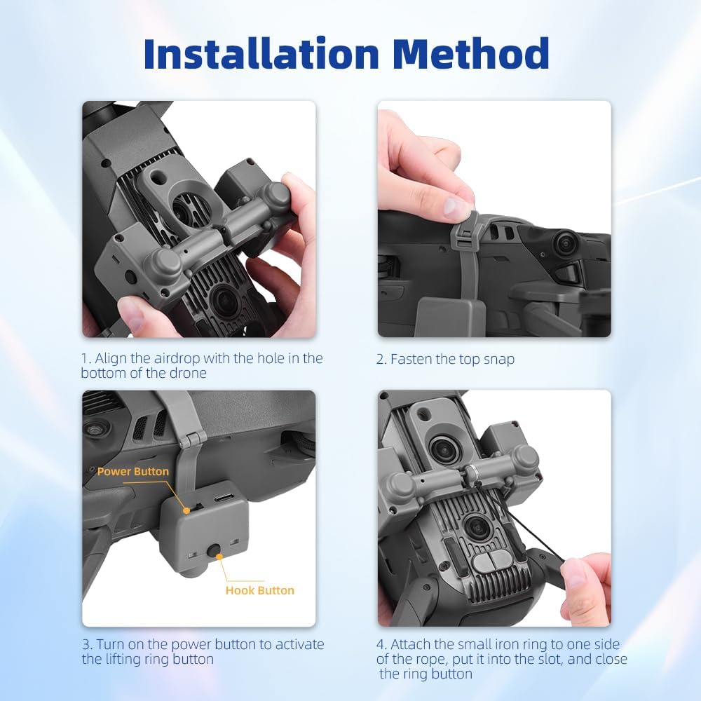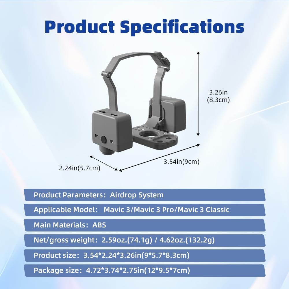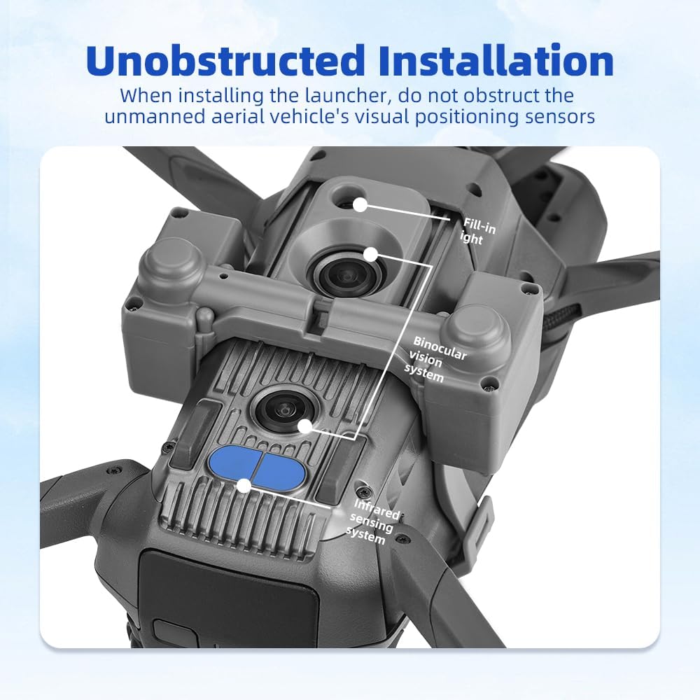 Il lanciatore pesa circa 50 grammi, è leggero, sicuro e leggero Il carico massimo è di 500 grammi, adatto a una varietà di scenari, aggiungendo divertimento infinito alla vita Durante l'installazione del trasmettitore, non bloccare il sensore di posizionamento visivo del drone. Dopo la carica completa, può essere utilizzato almeno 300 volte Lancio tramite telecomando, controllo tramite sensore di luce. Utilizzare il telecomando del drone per adattare la distanza di lancio alla portata controllabile