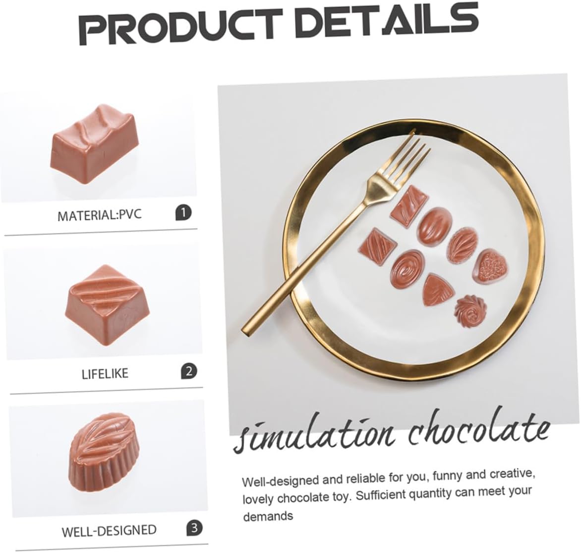 Cioccolato artificiale: il cioccolato simulato è adatto per applicazioni multiuso, come oggetti di scena per la fotografia, giocattoli divertenti, accessori da esposizione, decorazioni per feste al cioccolato Di dessert simulato: il cioccolato simulato è fatto di, durevole e, eccellente e bello, servito a lungo, cioccolato simulato Cioccolato finto da tavolo: realizzato in materiale sicuro e durevole, adatto ed eccellente per esporre e decorare, fingendo accessori da cucina Caramelle artificiali: cioccolato artificiale dalla forma realistica, decorativo e meraviglioso per il da esposizione, di cupcake finto Cibo artificiale: il cioccolato finto è di colore brillante, grazioso ed elegante, meraviglioso da esposizione per negozi e case in miniatura, accessorio per torta artificiale