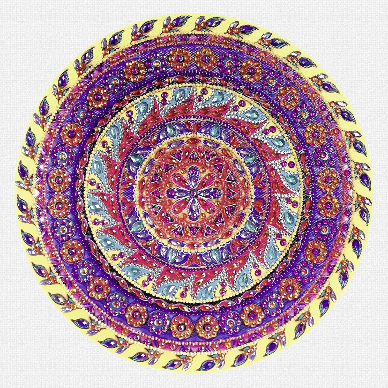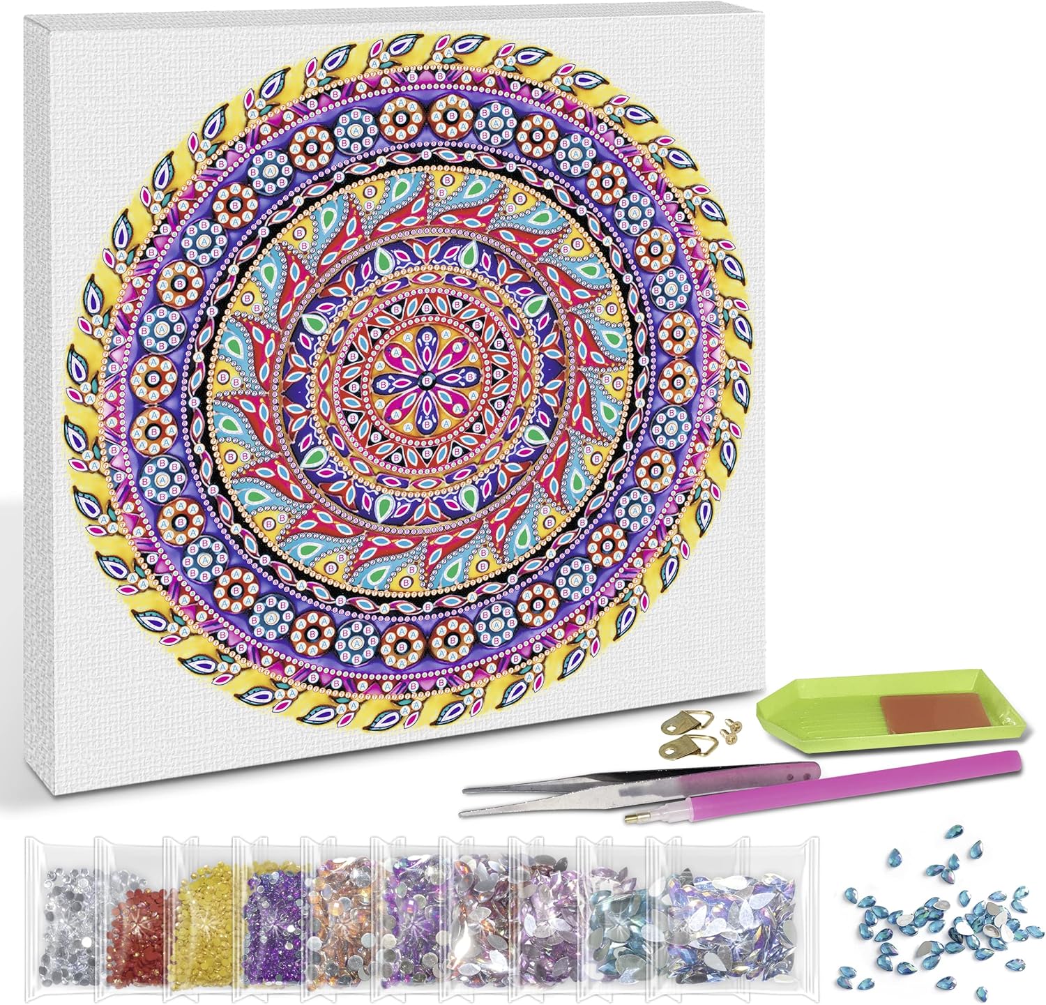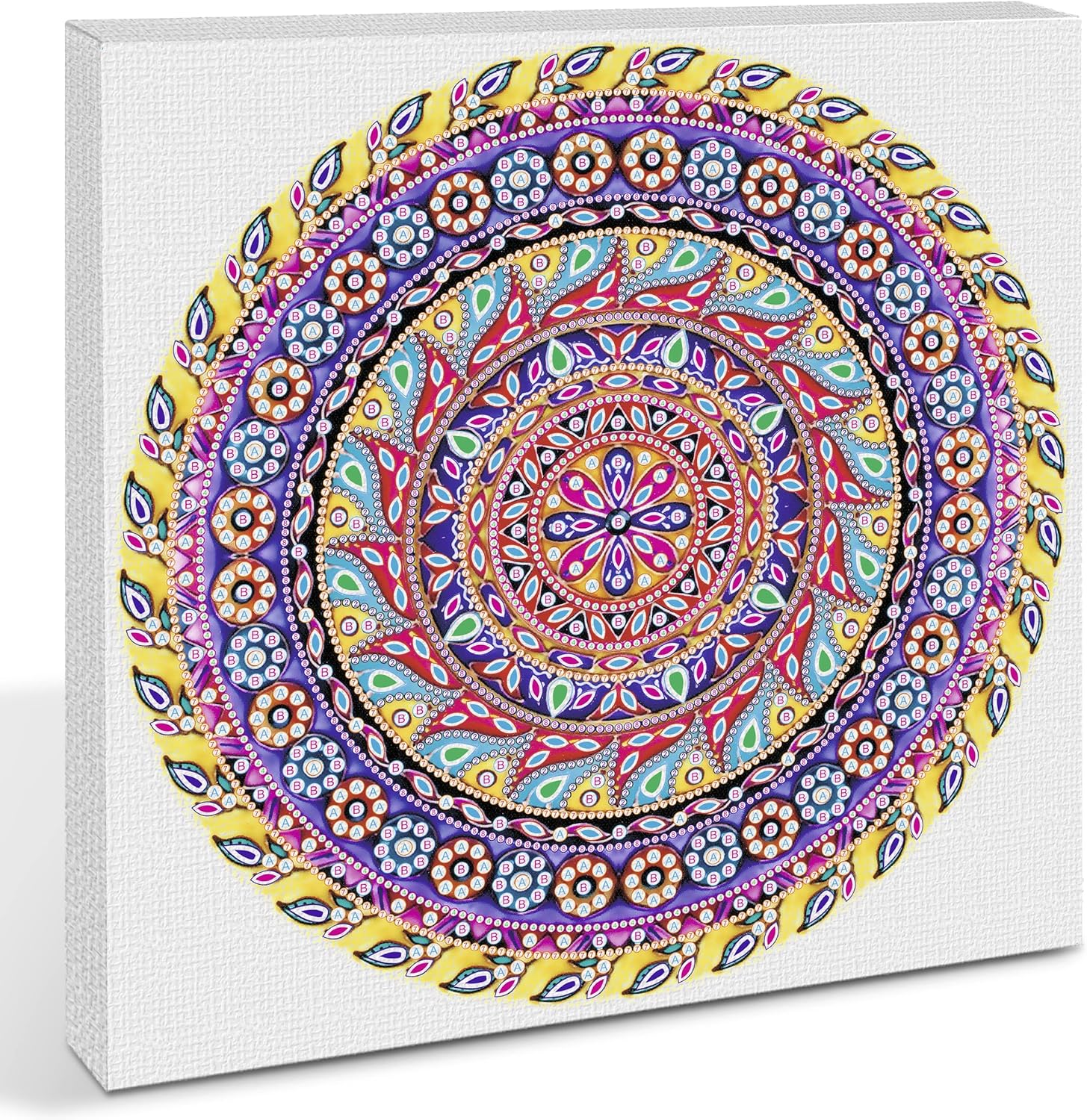 Kit per diamond painting colorato e decorativo "Mandala 4" nei colori giallo, viola e rosa I piccoli strass devono essere incollati su una tela con un cuscinetto adesivo e un pennino Contenuto del kit: 1 mandala su tela (30 x 30 x 1,5 cm), 1 penna con cuscinetto adesivo, 1 vassoio, 1 pinzetta, 1 kit di montaggio, diversi diamanti acrilici Stimola la creatività e le abilità motorie Nella confezione sono incluse le istruzioni e la leggenda per le pietre